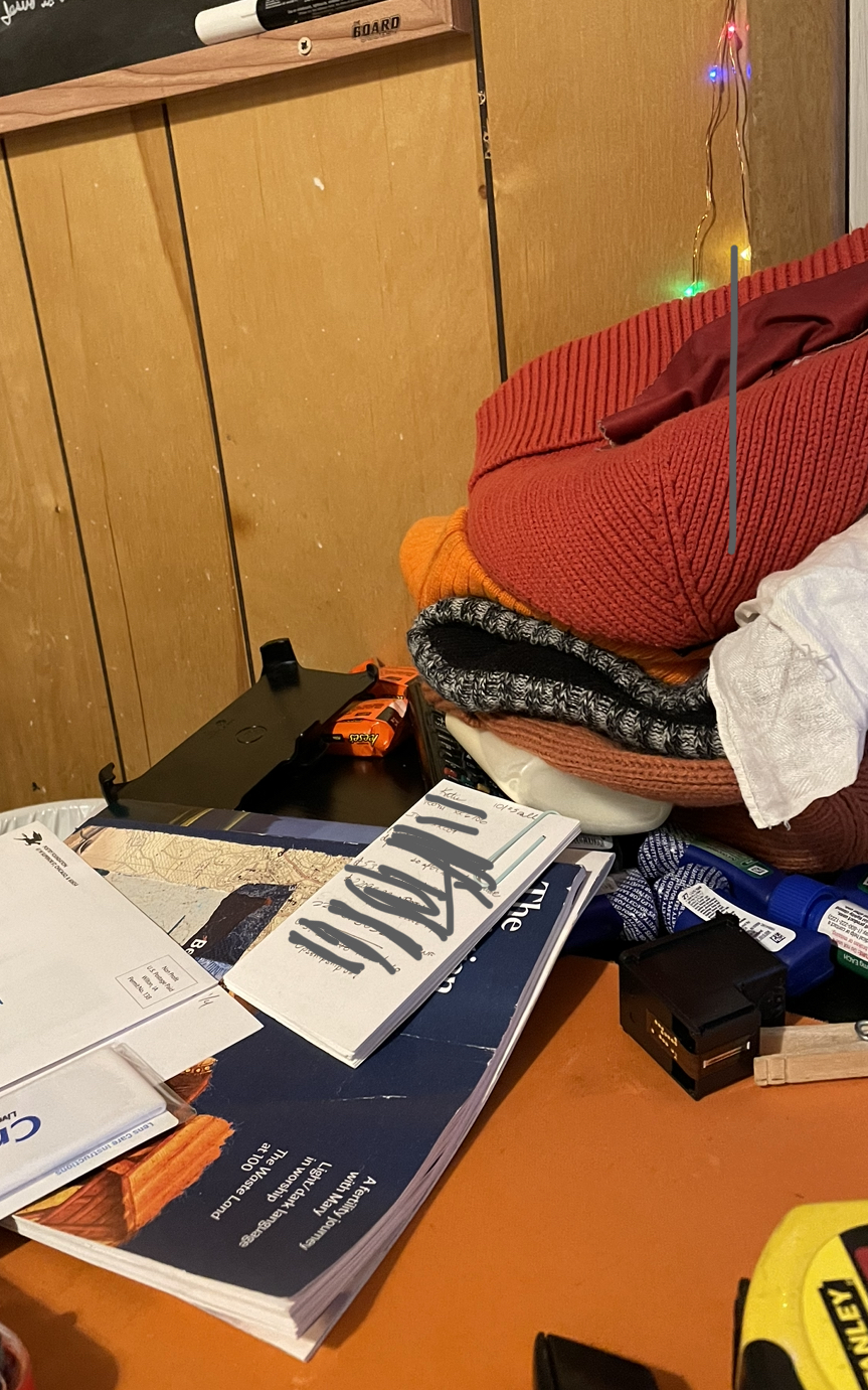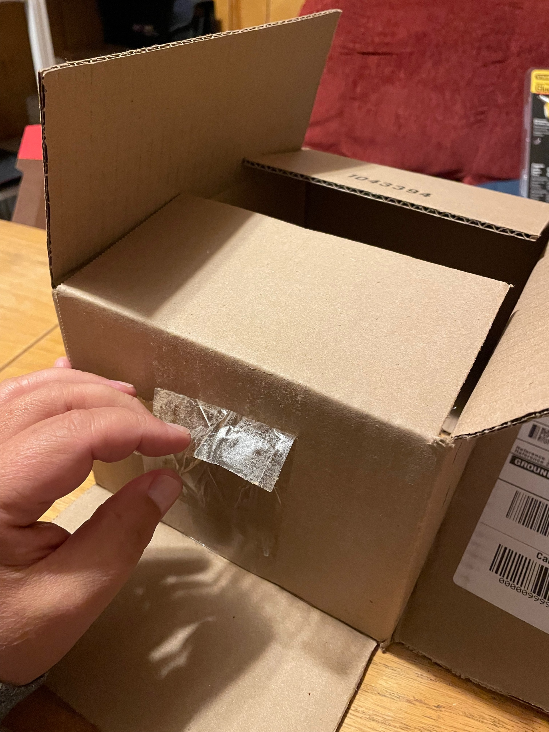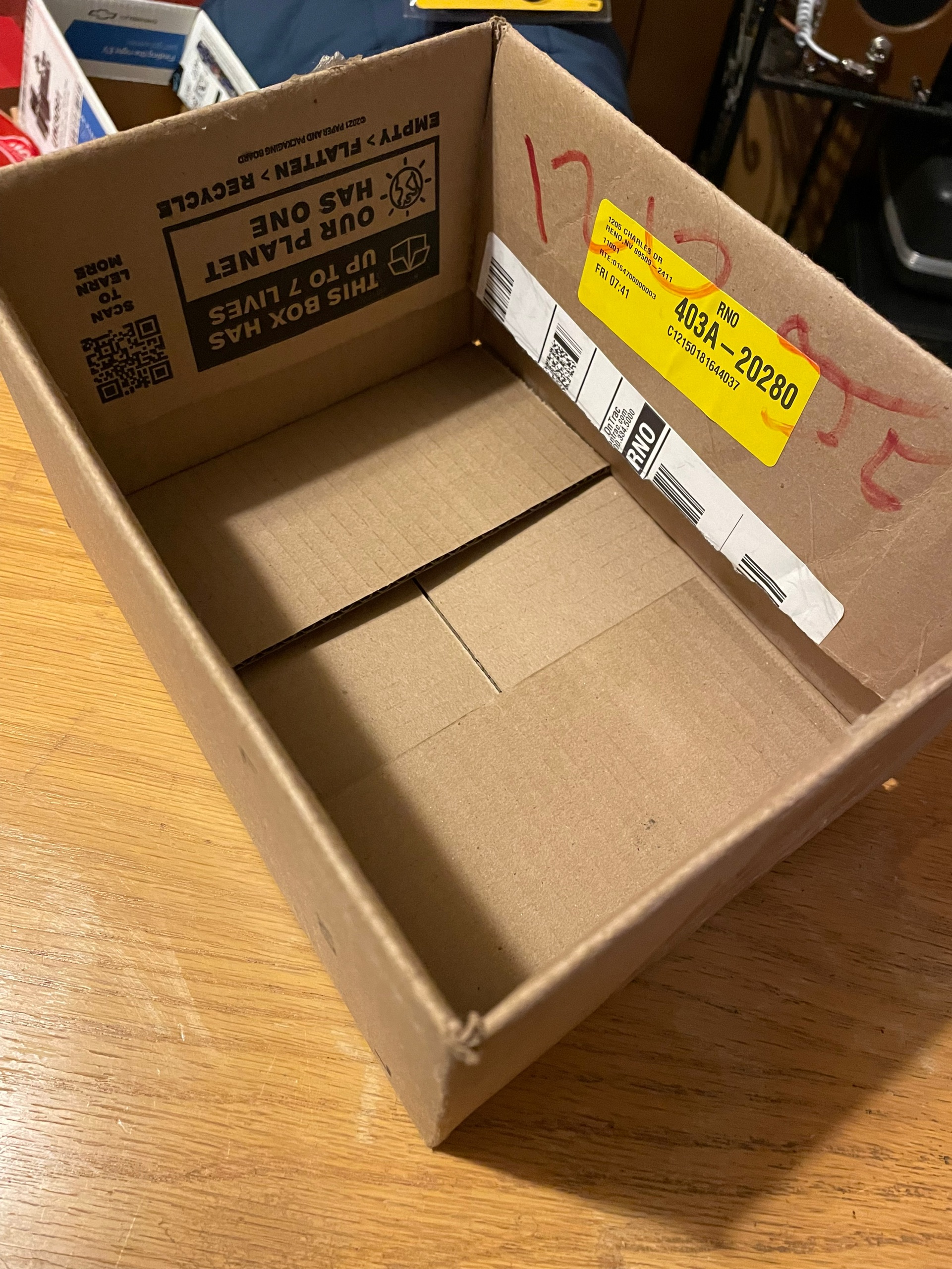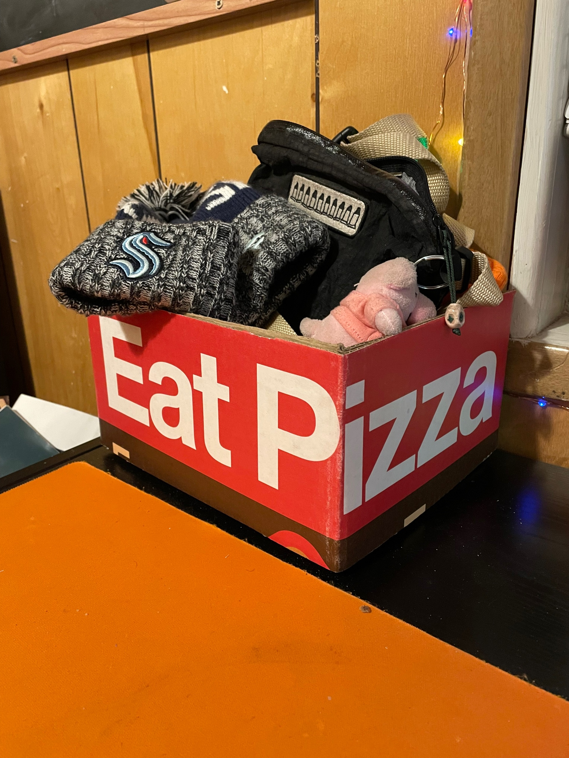 i put all the shit in it. improved cardboard box now holds hand sanitizer. $0.35 american cents in coin, a tv remote, two printer ink cartridges, three lens cleaning cloths, a small stack of notes and drawings on 3x5 white notecards, five bottles of nicotine lozenges, two bills, my iphone belt clip, two red beanies, two orange beanies, one seattle kraken beanie and my hip bag complete with pink I❤️NY pig.