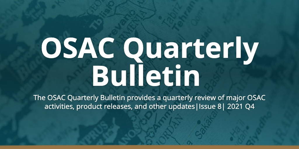 OSAC’s analysts published nearly 50 reports this quarter, looking at security threats in 30 different countries, including election-related insecurity in Honduras, Iraq, Libya, and Nicaragua; the evolving political/military threat in Ethiopia (rebel advance, regional trends, benchmarking); criminal landscape in Mexico (nationwide, Cancun/Riviera Maya); cross-border crises affecting Eastern Europe (Poland-Belarus and Ukraine-Russia); and a joint series of benchmarking reports with RANE risk intelligence.