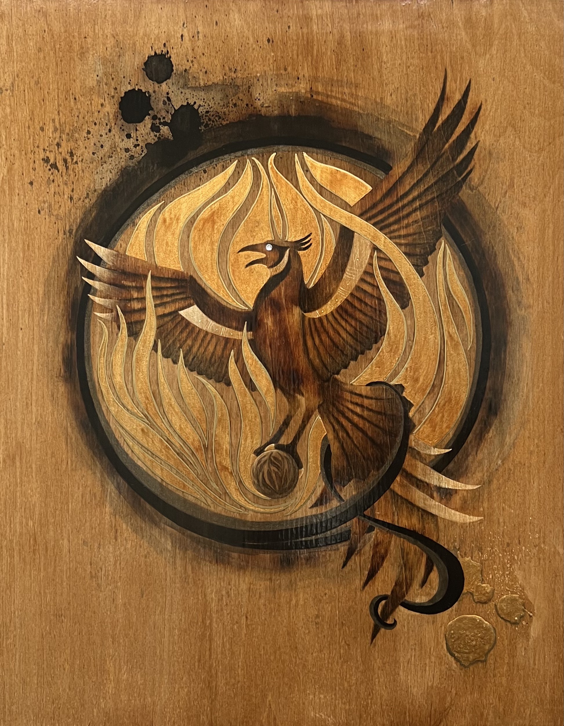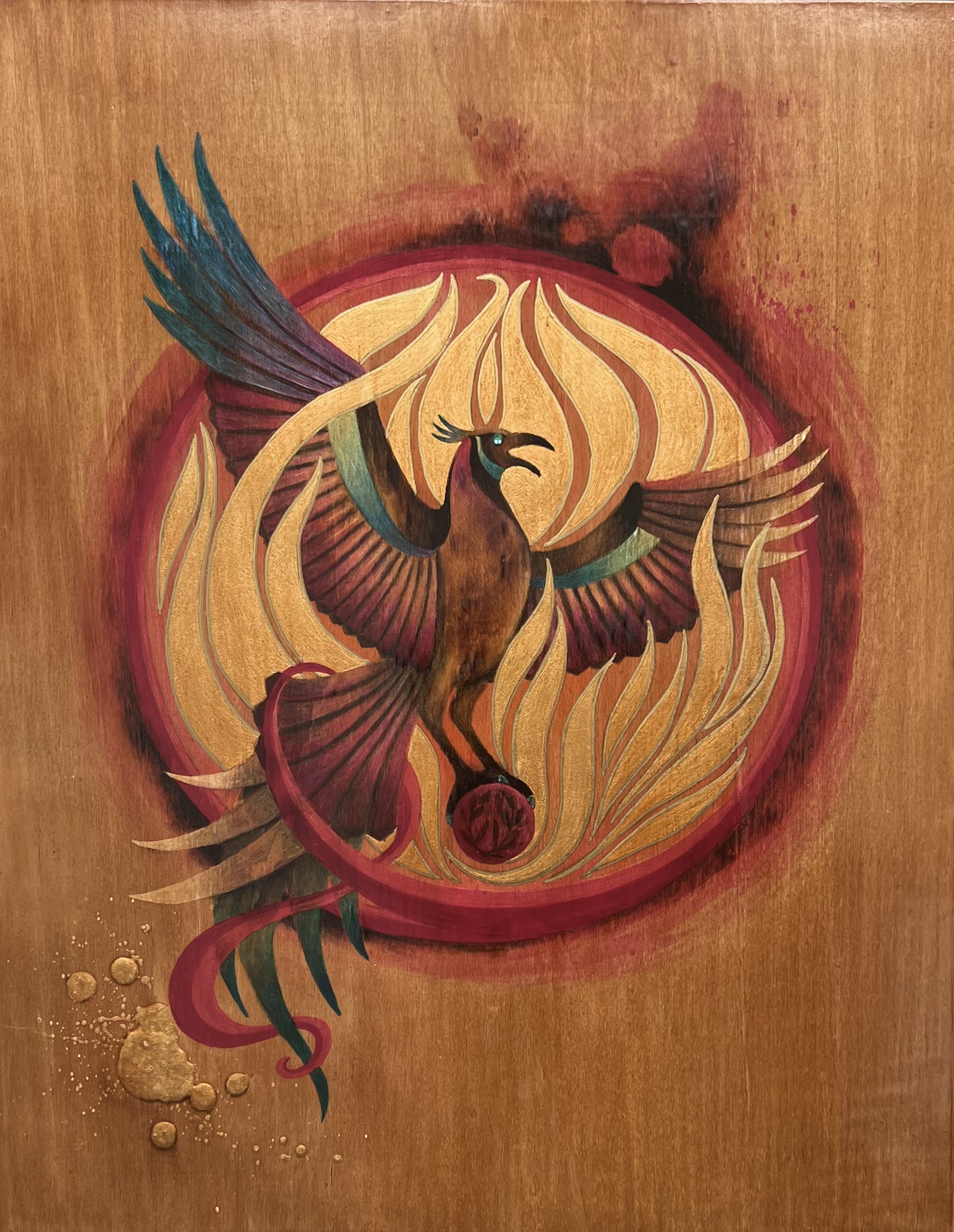 The form of the bird is influenced by my love of the ancient Egyptian styles, specifically that of Horus, the falcon god who carries the sun and moon across the sky. Here the ball carried by the phoenix is the remains of its former self which it carries back to heaven to place on the altar within the sacred temple’s holy shrine — thus it becomes a gift bearer. I burned the bird onto the wooden panel of this piece using lemon juice and a torch — a fitting method to use in the creation of a phoenix.