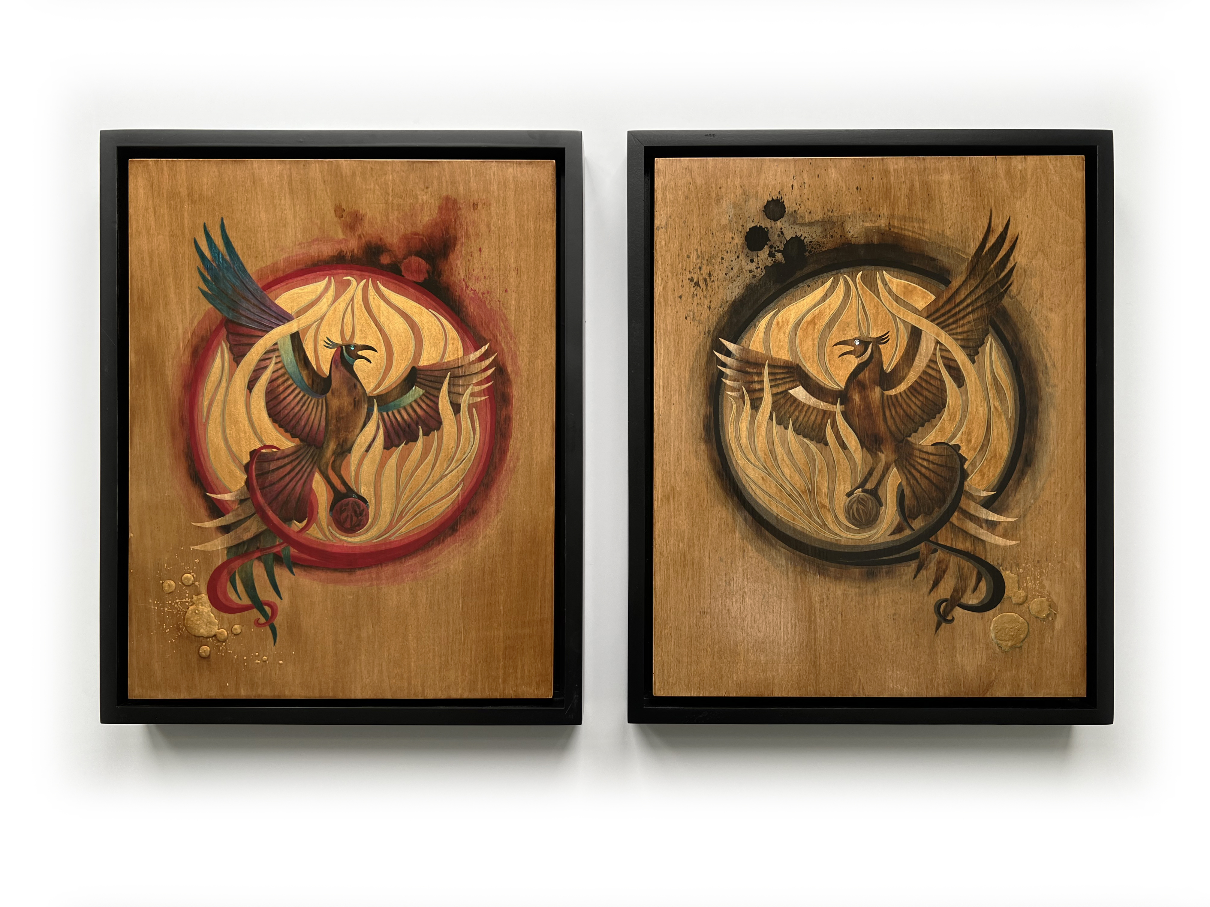 The opportunity to explore this symbol and create two artworks came from a client’s art commission request. In research for these pieces, I soon landed on the 3rd century poem by Lantantius (advisor to Roman Emporer Constantine), De ave phoenice, an allegory which compares the bird to Christ. It is from this text my phoenixes rise.