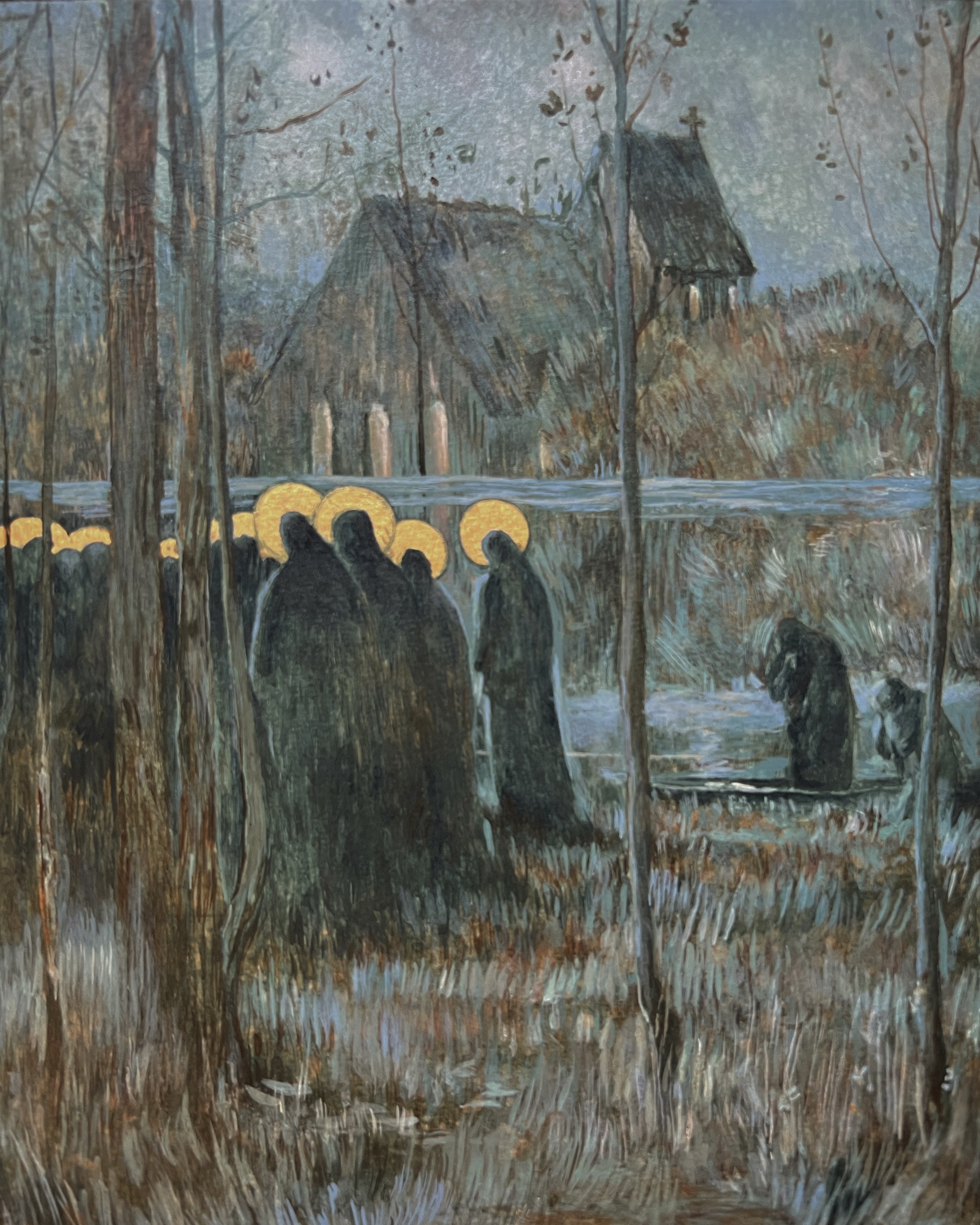 Above is an artwork I was commissioned to create for my oldest daughter, Madeline. It’s a copy of a painting called Procession of Souls by the French artist, Louis Weldon Hawkins from 1893. The painter says little about it other than it features a sculpture made by another artist. The meaning is obscure. It evokes questions. This makes the piece appealing and good for contemplation and meditation.