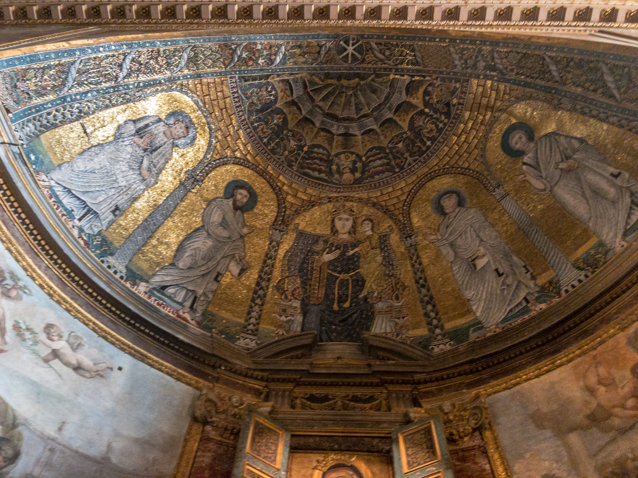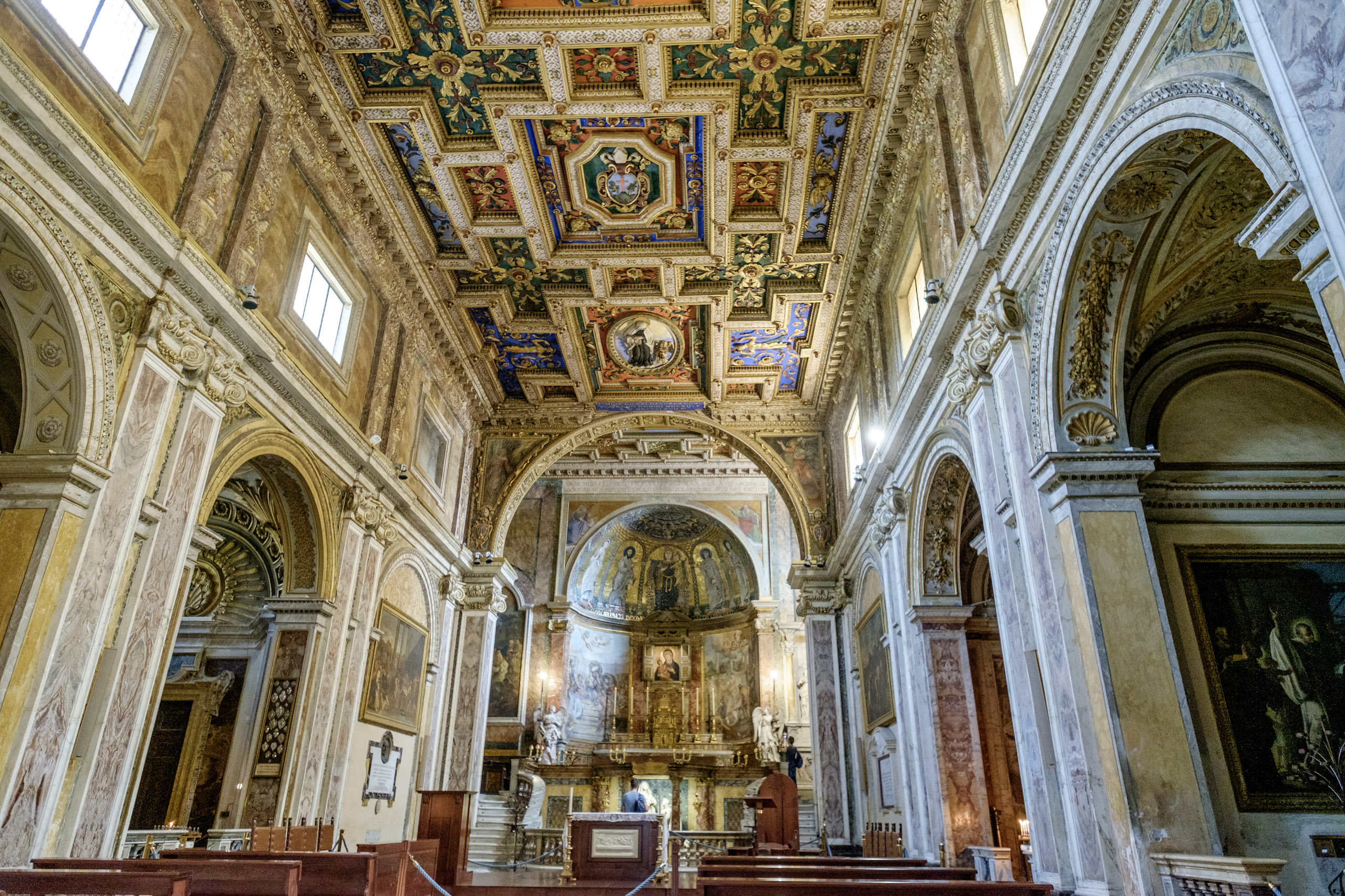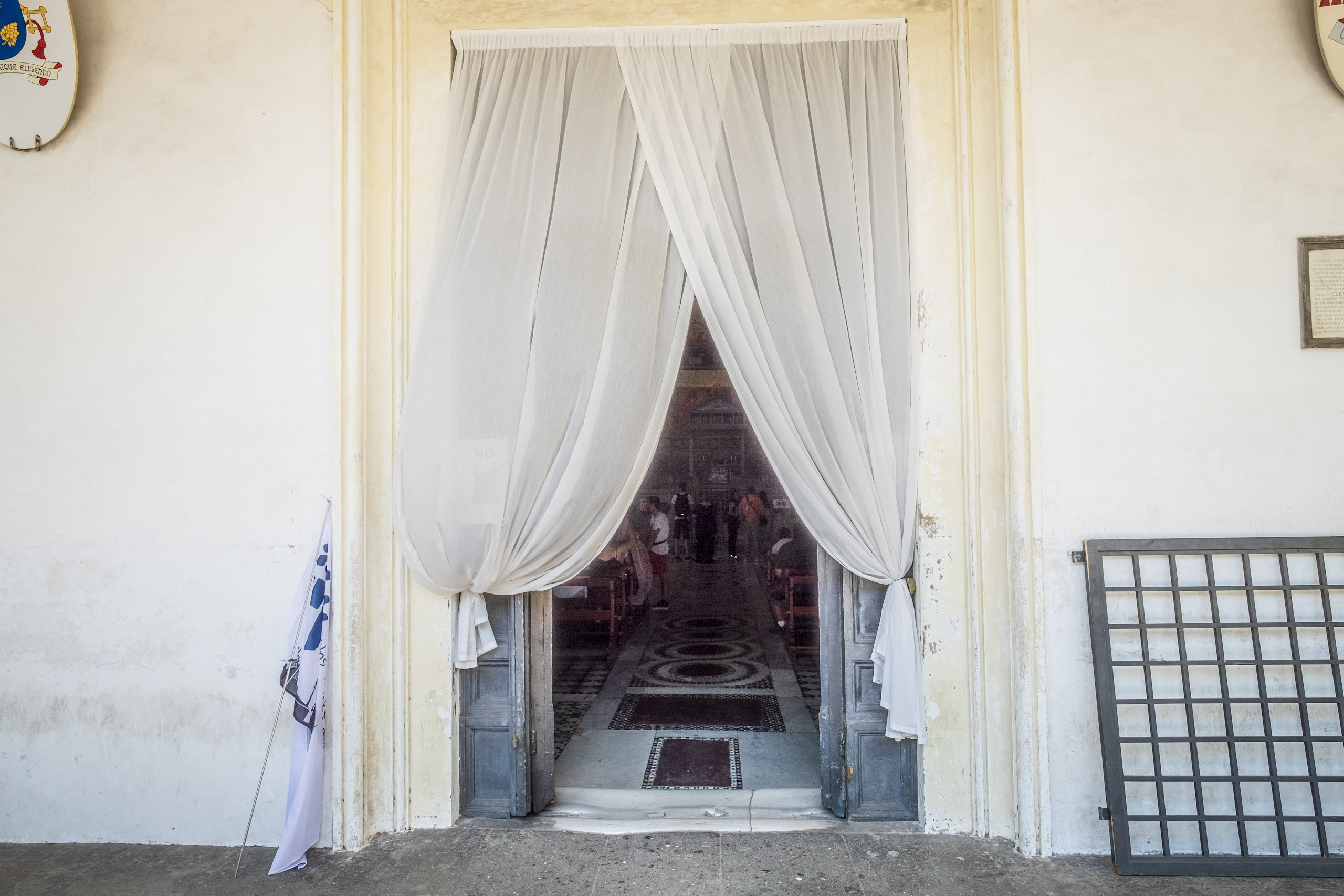 We get to the church - San Francesa del Roma, only to learn that it appears to be shuttered tight. What of the gathering crowds waiting in its shady grounds? It takes a few moments, but we learn that the side doors are open and inviting, though the main entrance is not. San Francesa does not disappoint either, with its ornate, three-dimensional ceilings. We linger and wander the sanctuary.