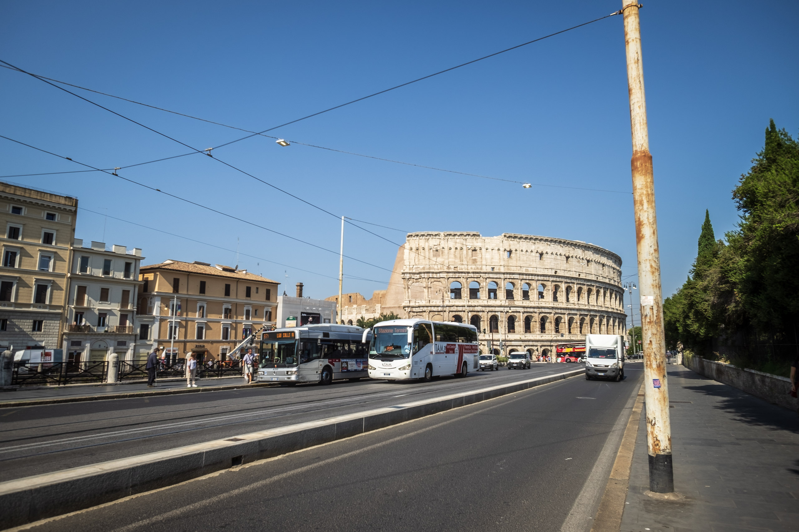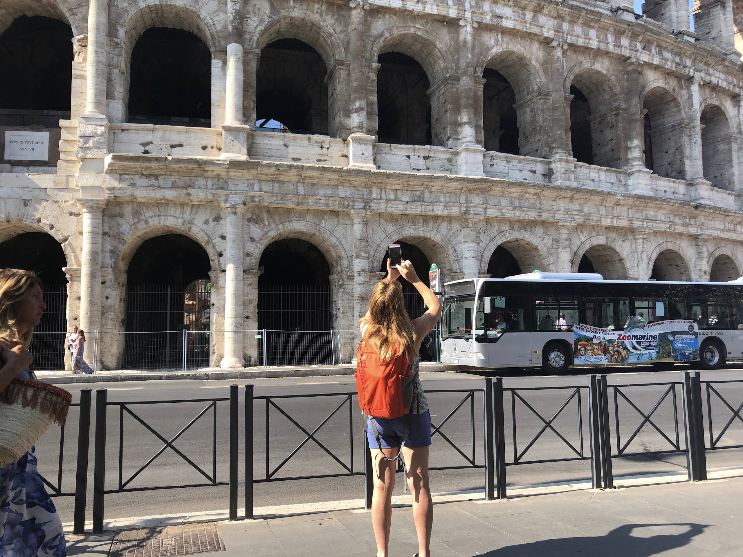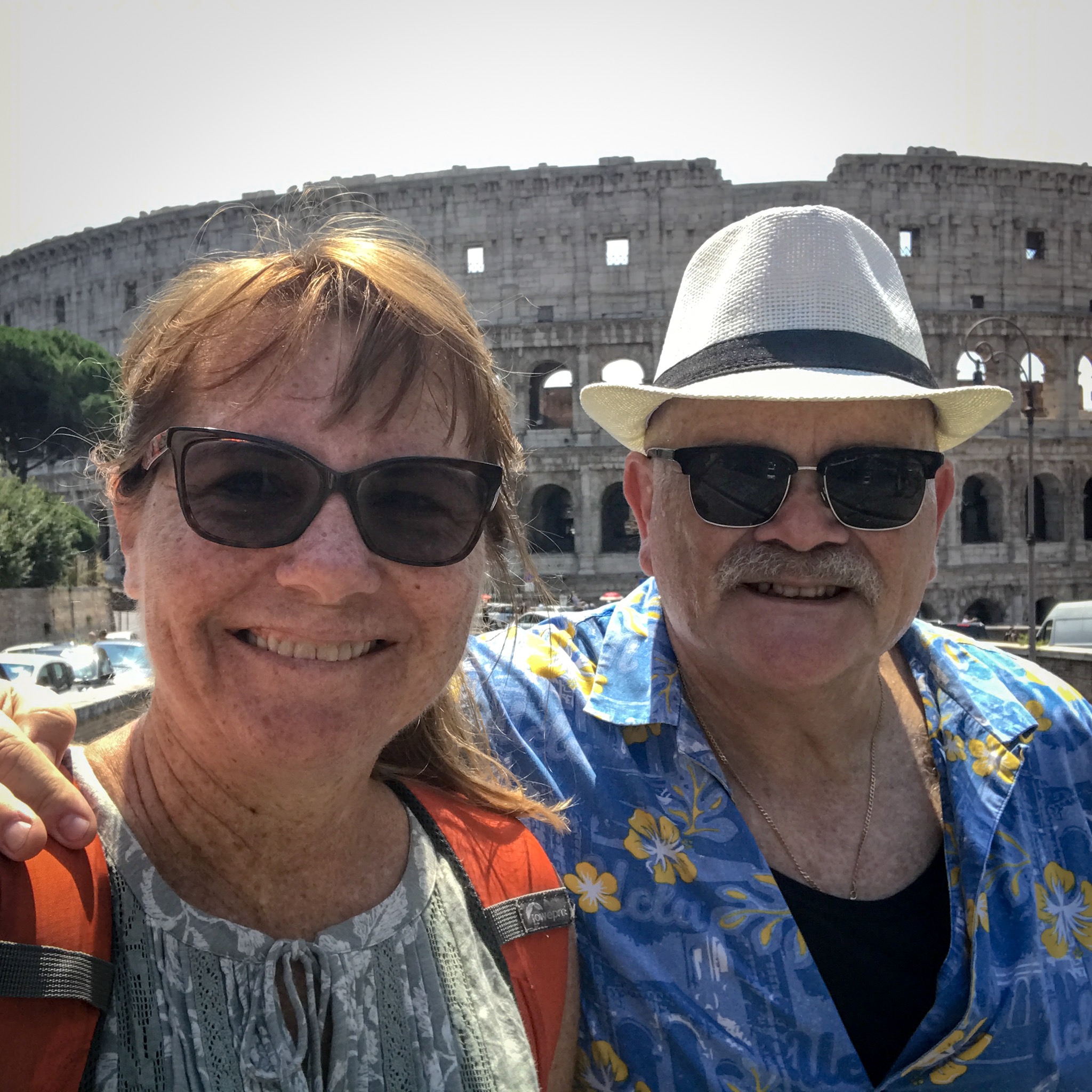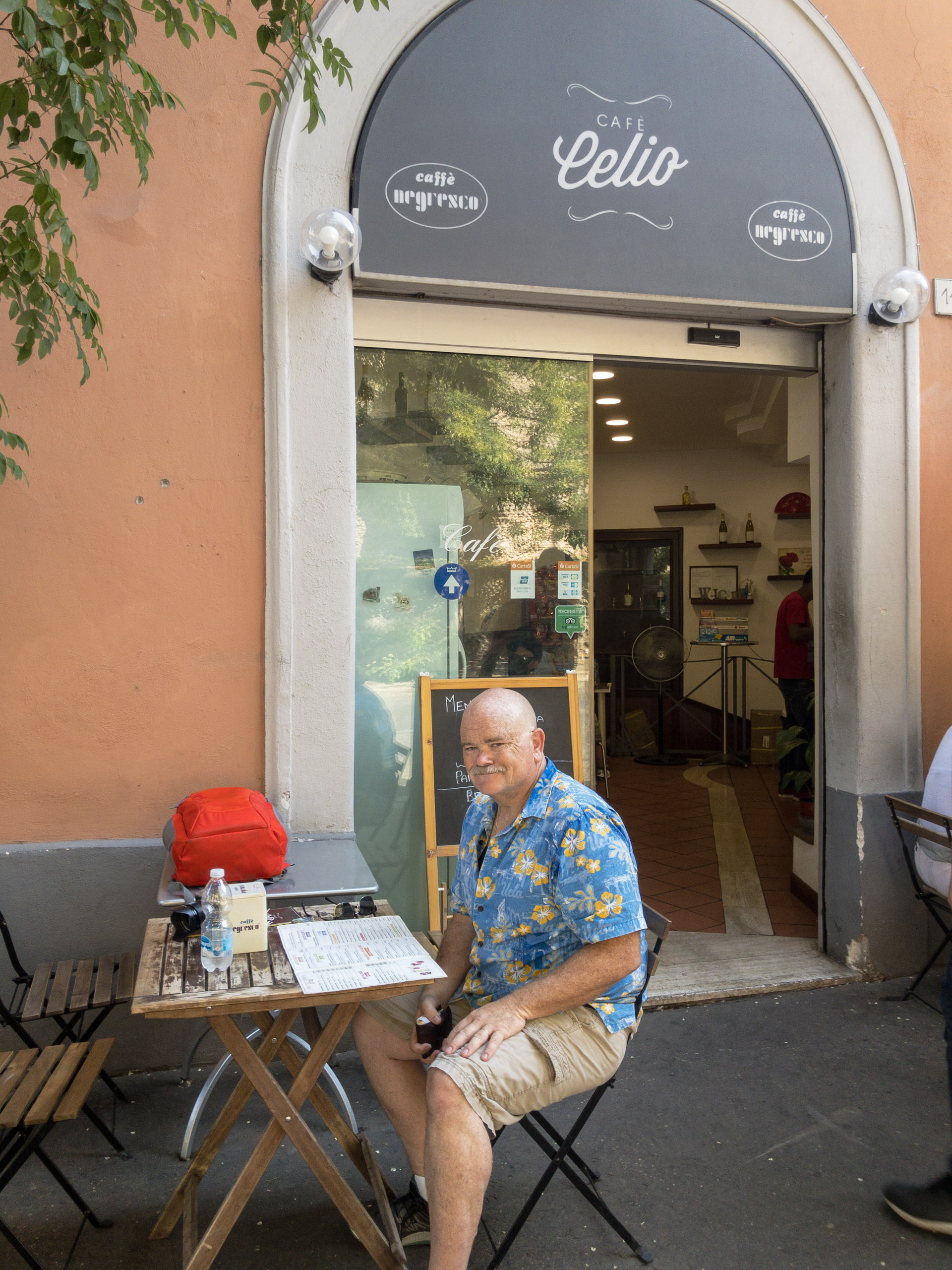It is here that Blaise acquires a hat to replace what was lost on the trek here, a lightweight newsboy cap received from a coworker. Ten Euros is a reasonable price to pay for the avoidance of sunstroke-and-burn. Emboldened by the protection, we explore the adjacent building, which turns out to be an educational institution in the midst of an apparent passing-period between classes. We, no doubt stand out like sore thumbs: too old to be counted among the students, too casually-dressed to be mistaken for the professore. It’s an amusing detour that gives way to a desire to find a place to rehydrate and relax a spell. Along the way, we capture some images of the Colosseum from yet another angle.