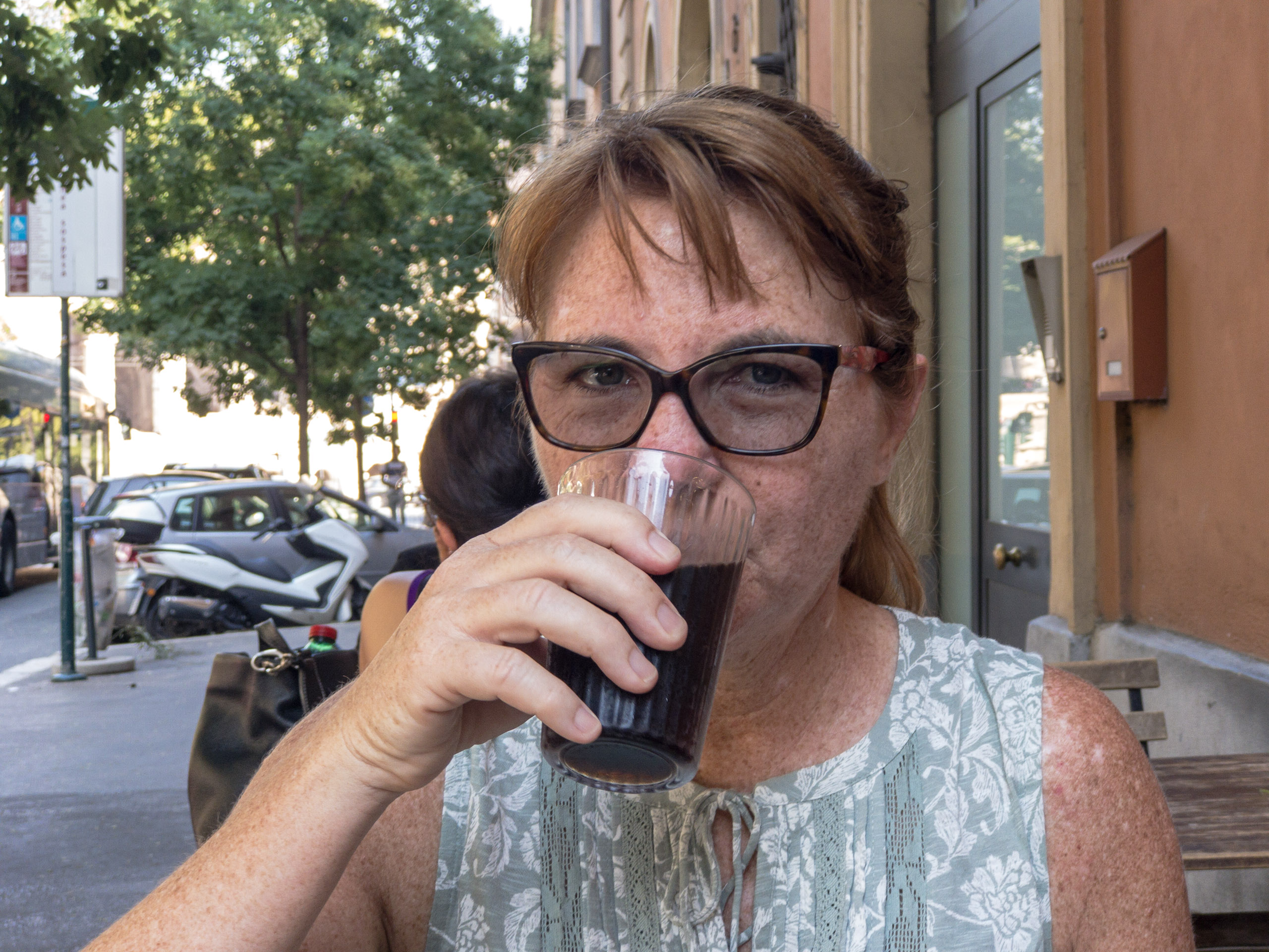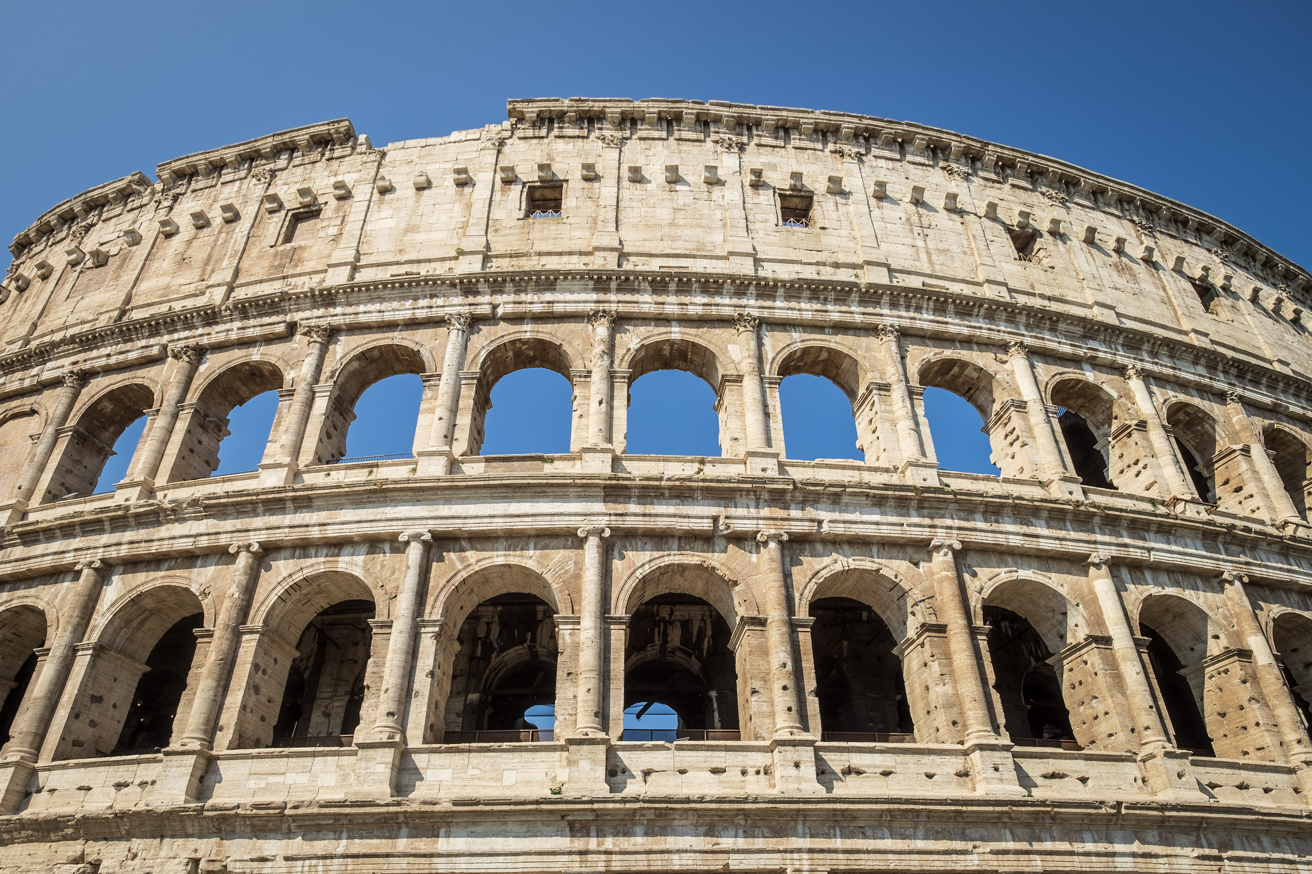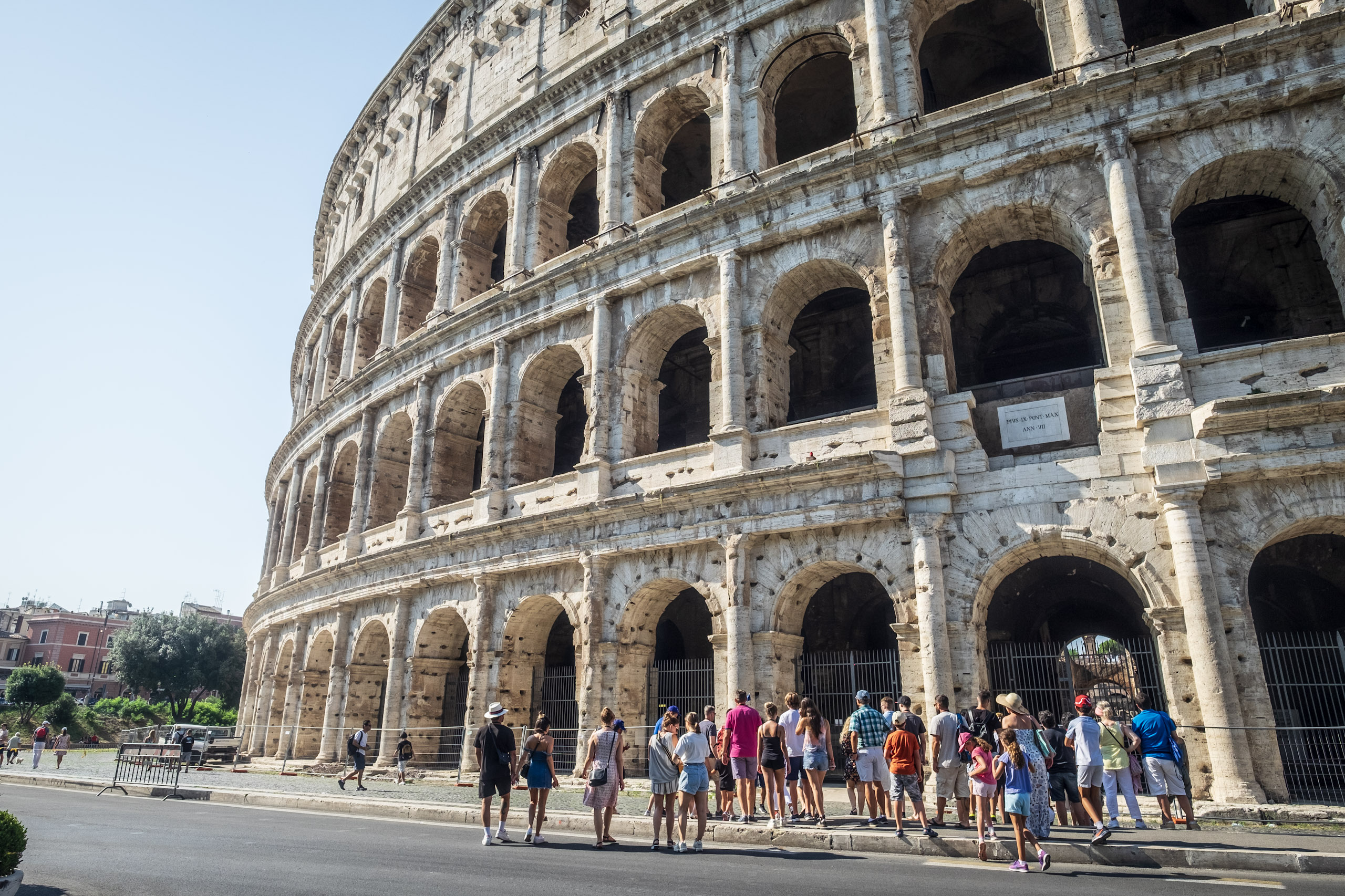 It is here that Blaise acquires a hat to replace what was lost on the trek here, a lightweight newsboy cap received from a coworker. Ten Euros is a reasonable price to pay for the avoidance of sunstroke-and-burn. Emboldened by the protection, we explore the adjacent building, which turns out to be an educational institution in the midst of an apparent passing-period between classes. We, no doubt stand out like sore thumbs: too old to be counted among the students, too casually-dressed to be mistaken for the professore. It’s an amusing detour that gives way to a desire to find a place to rehydrate and relax a spell. Along the way, we capture some images of the Colosseum from yet another angle.