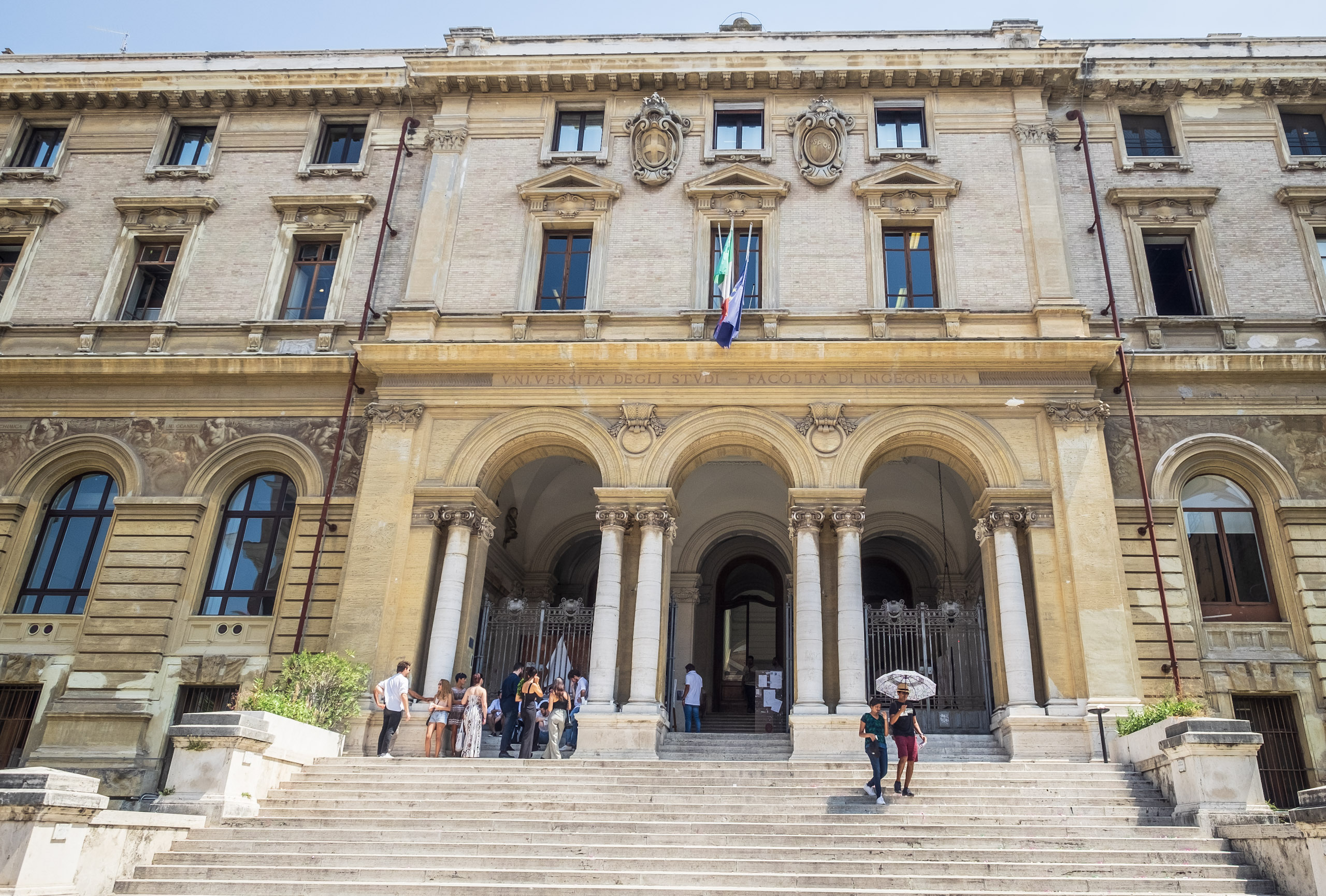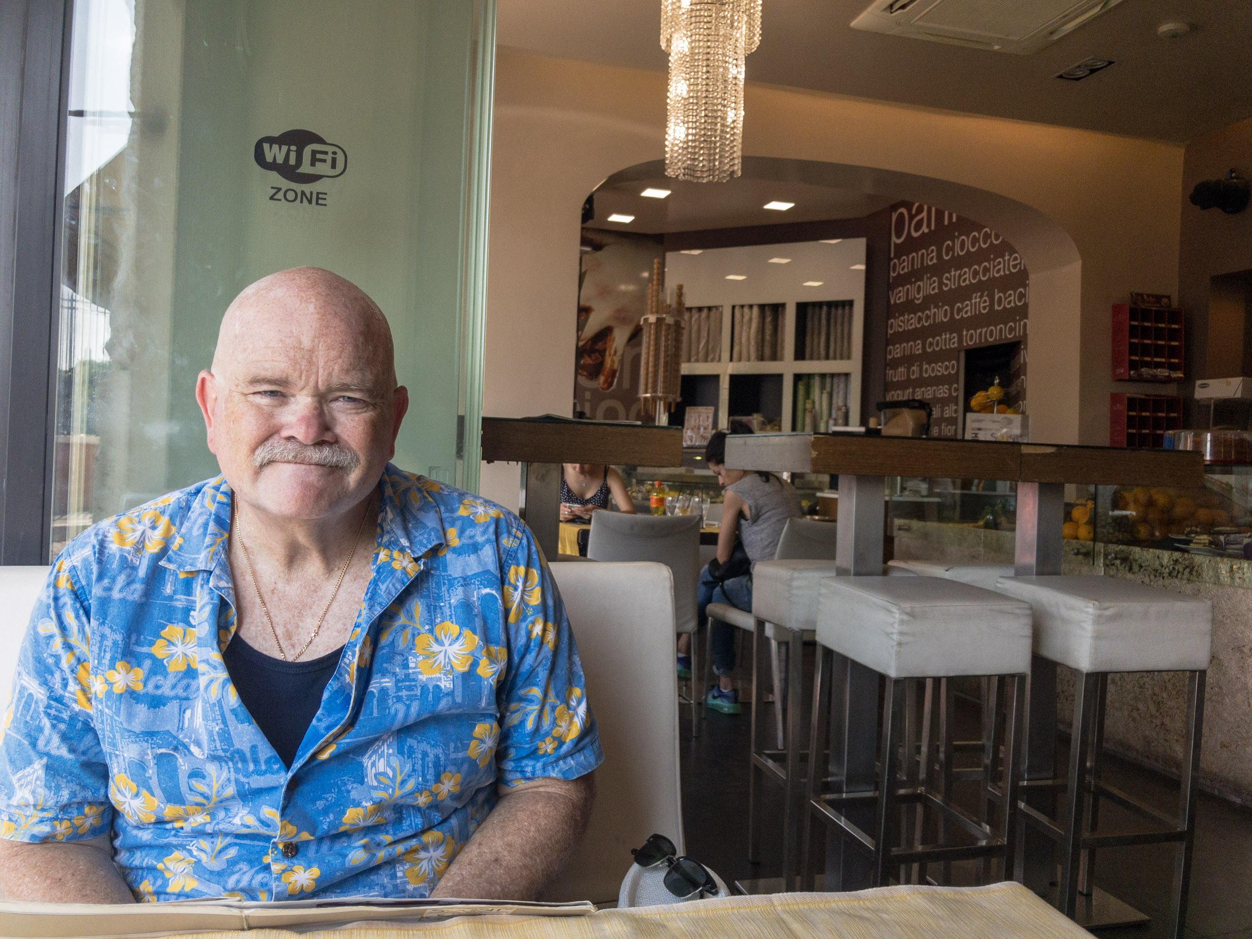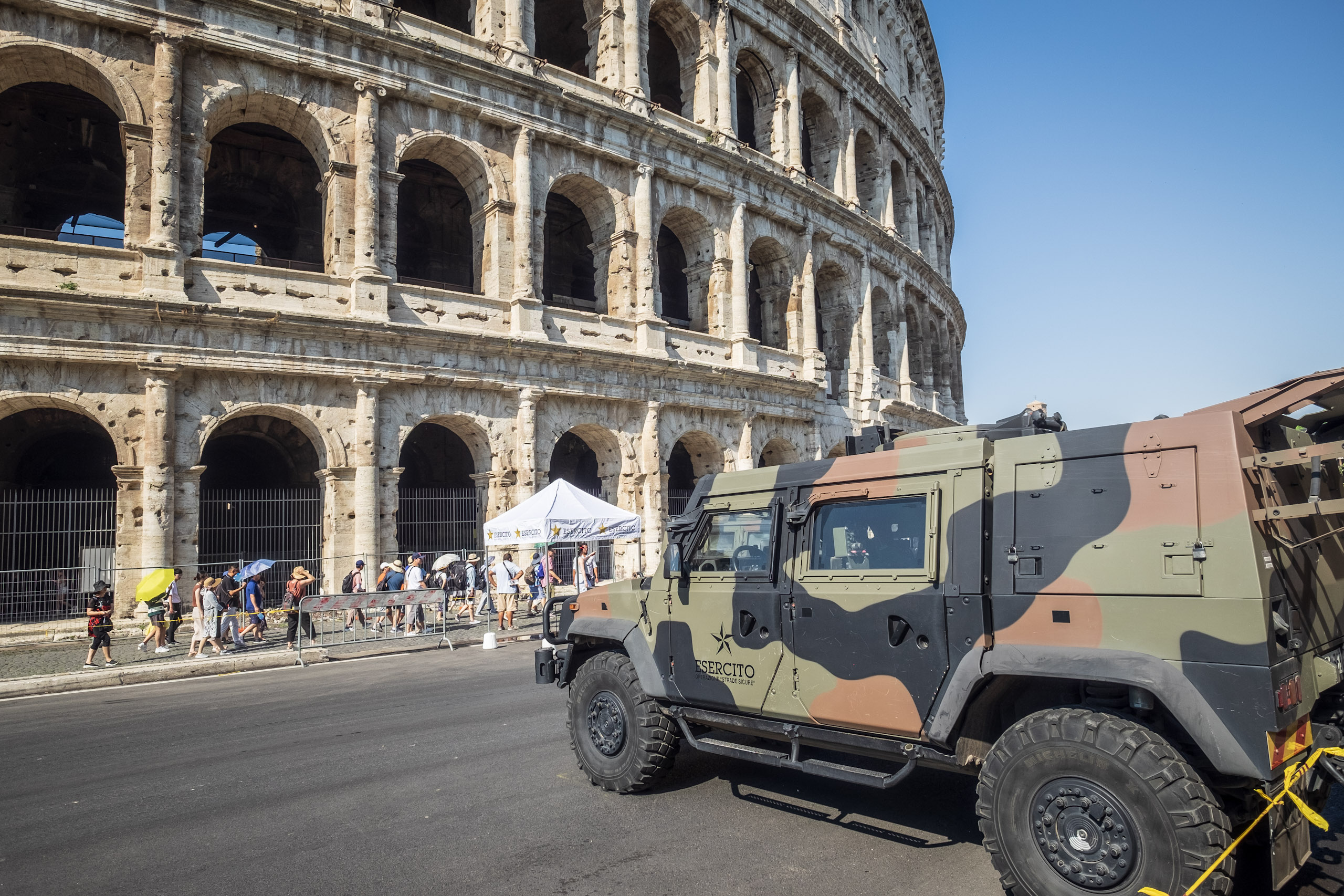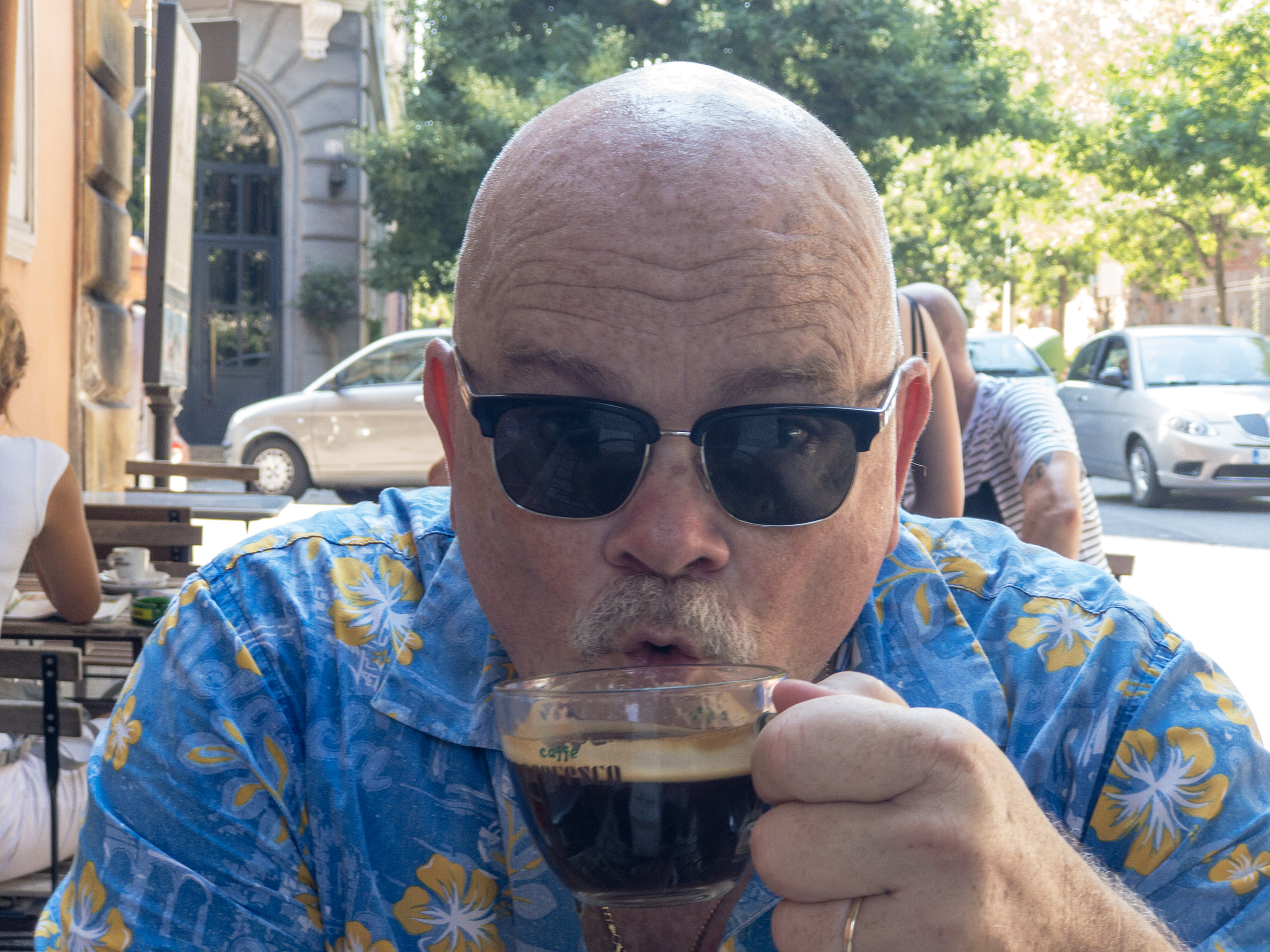 It is here that Blaise acquires a hat to replace what was lost on the trek here, a lightweight newsboy cap received from a coworker. Ten Euros is a reasonable price to pay for the avoidance of sunstroke-and-burn. Emboldened by the protection, we explore the adjacent building, which turns out to be an educational institution in the midst of an apparent passing-period between classes. We, no doubt stand out like sore thumbs: too old to be counted among the students, too casually-dressed to be mistaken for the professore. It’s an amusing detour that gives way to a desire to find a place to rehydrate and relax a spell. Along the way, we capture some images of the Colosseum from yet another angle.