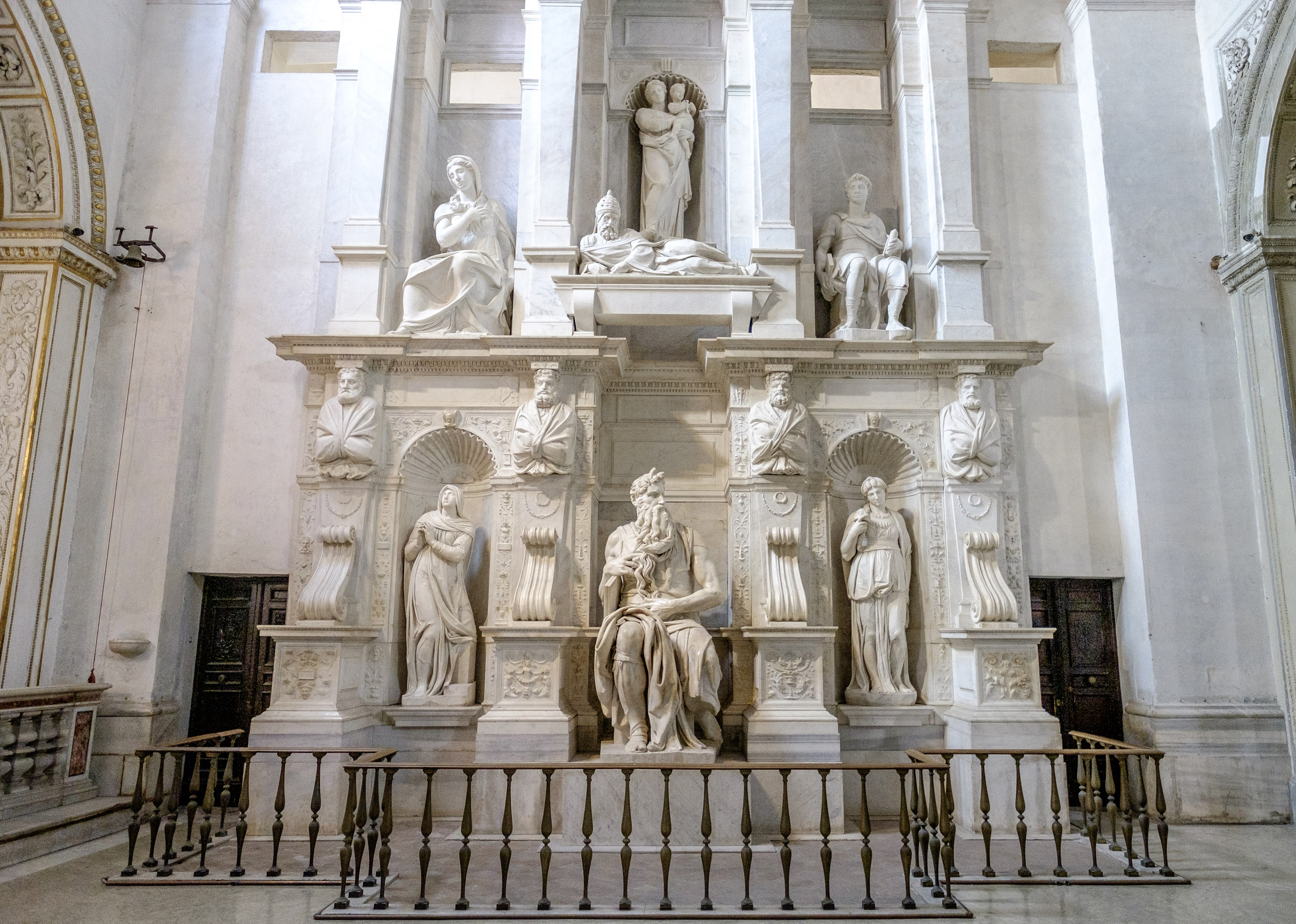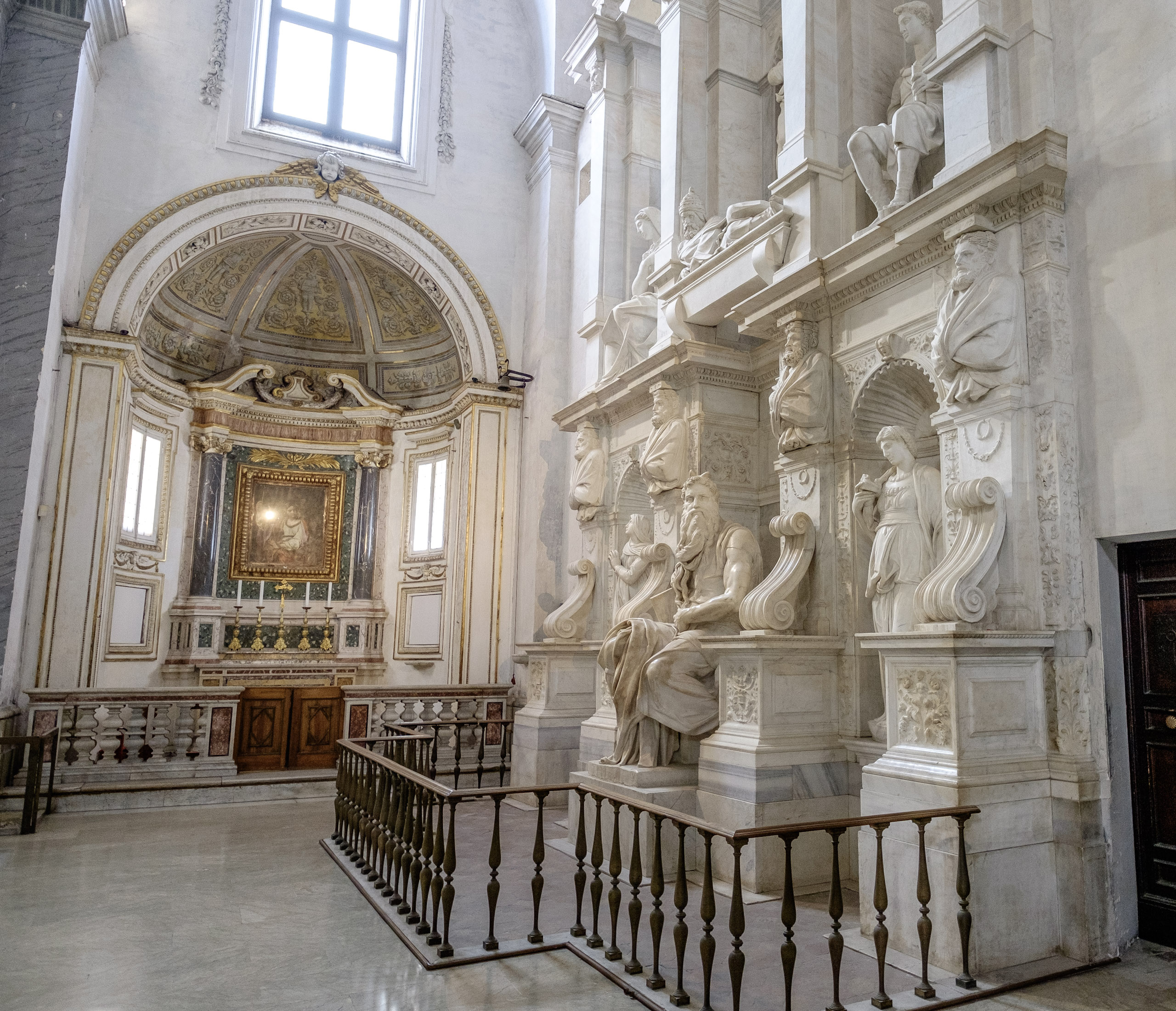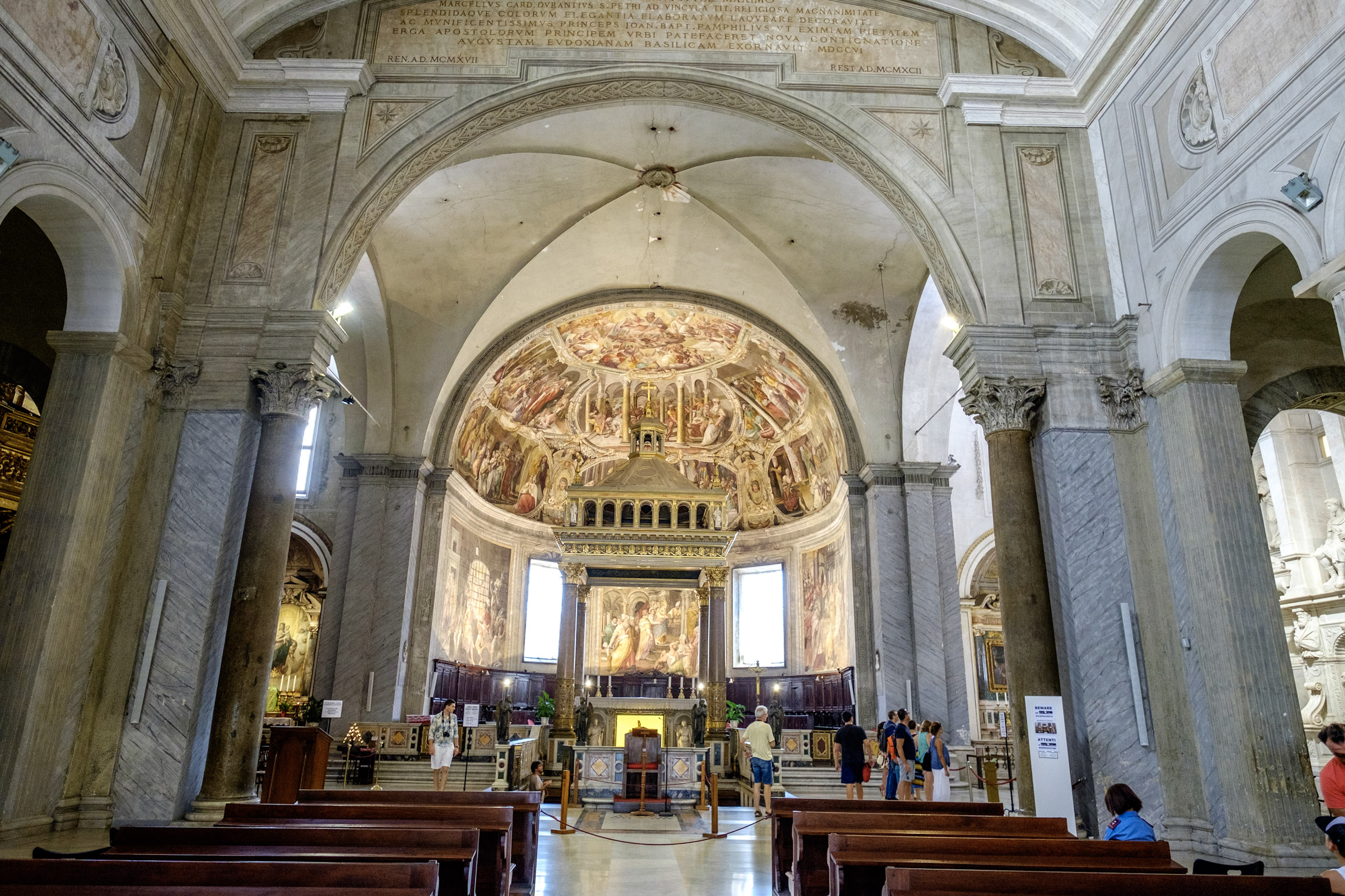 Once finished with San Clemente, we decide to explore San Pietro de Incoviglio (“Saint Peter in Chains”). For this, we engage the services of a local taxi driver, a young lady who can hold her own among this male-dominated vocation. Though disappointed to learn we weren’t asking her to drive us to Saint Peter’s in Vatican City, she drives us along a path of unexpectedly lush surroundings, including a tree-canopy lined street one might expect to find in Northern California or New England. We arrive at San Pietro, and are treated to a feast for the eyes and the soul.