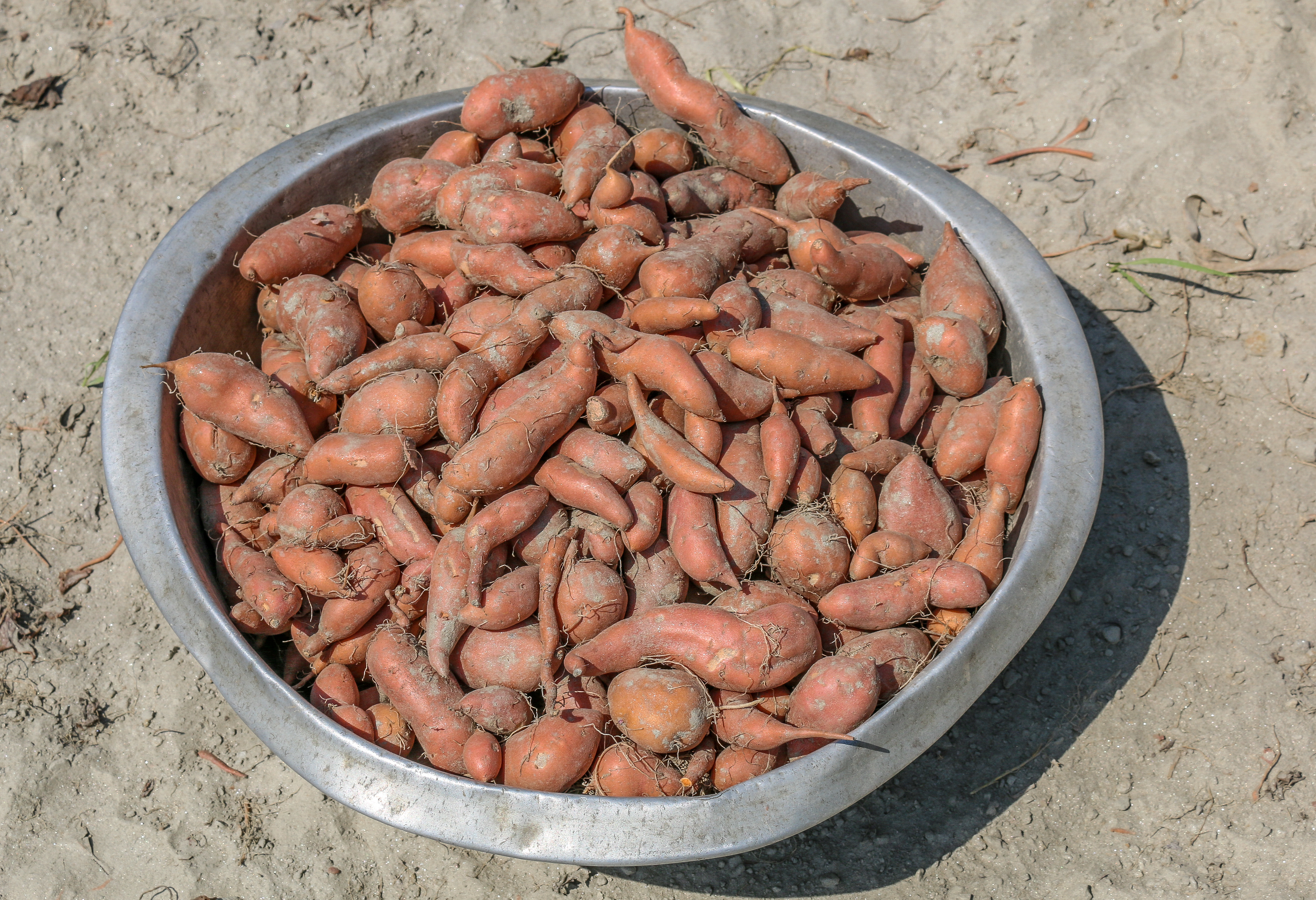 The banks of the river are currently dotted with green and orange. Farmers along this stretch of land are harvesting a relatively new crop to the area – orange fleshed sweetpotato (OFSP). The farmers are crouched low to the ground and use their hands and a small pick to gently ease the sweetpotato from the sandy soil. The root slips out quite easily as the sand is lose– but this is still hot and backbreaking work for these farmers.