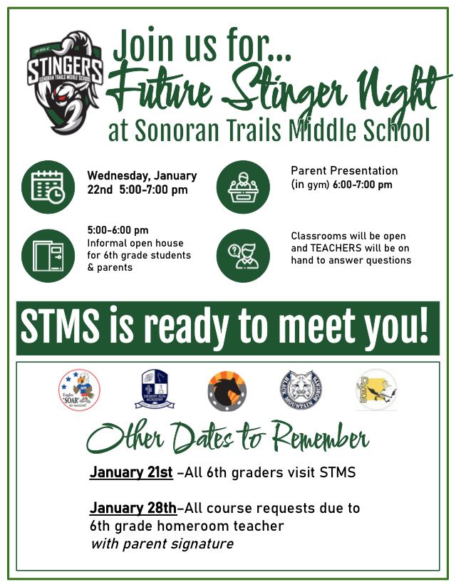 🔹1/21 Future Stinger Night - All 6th Graders and Parents Invited. More info below: