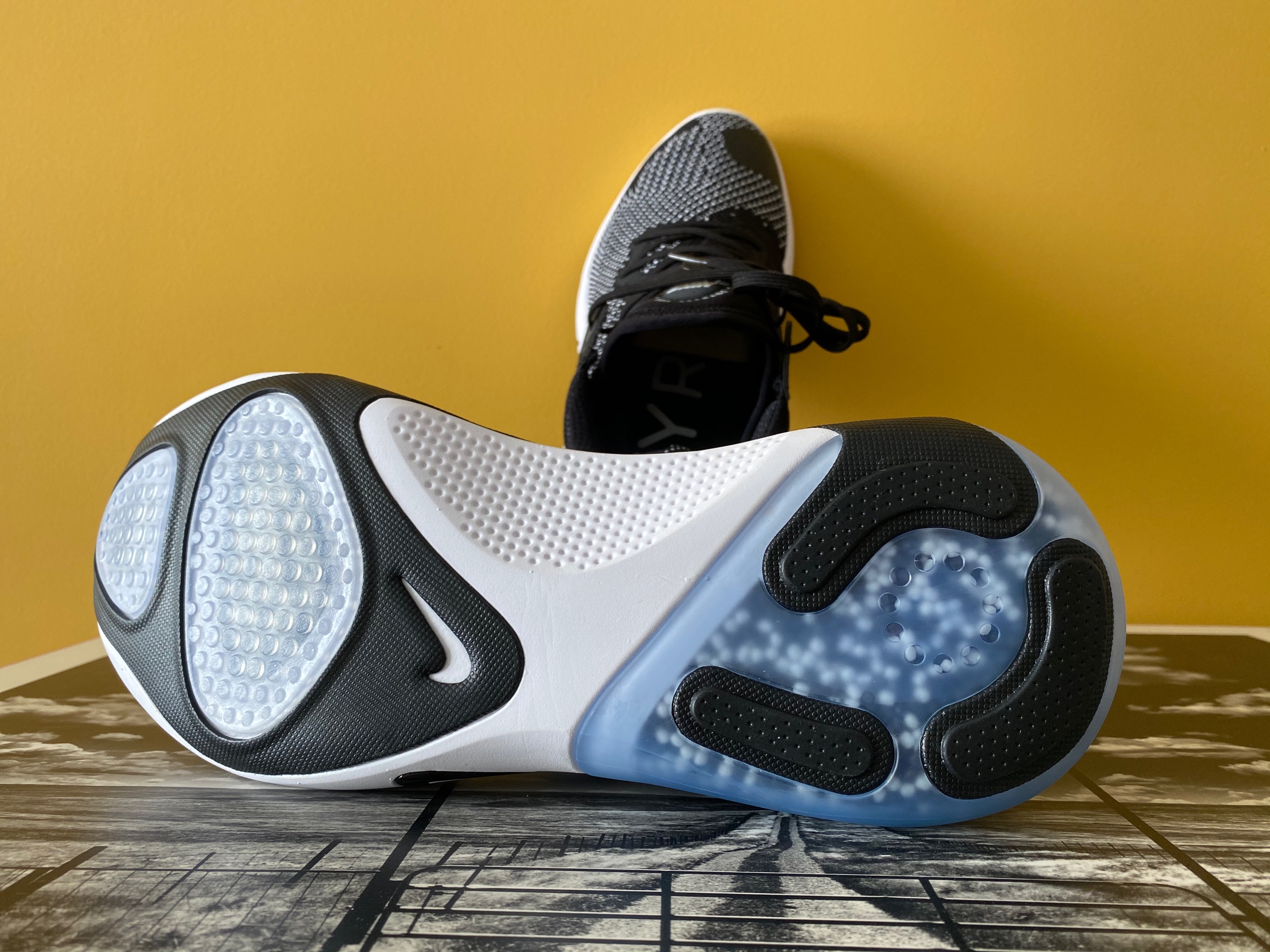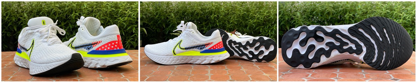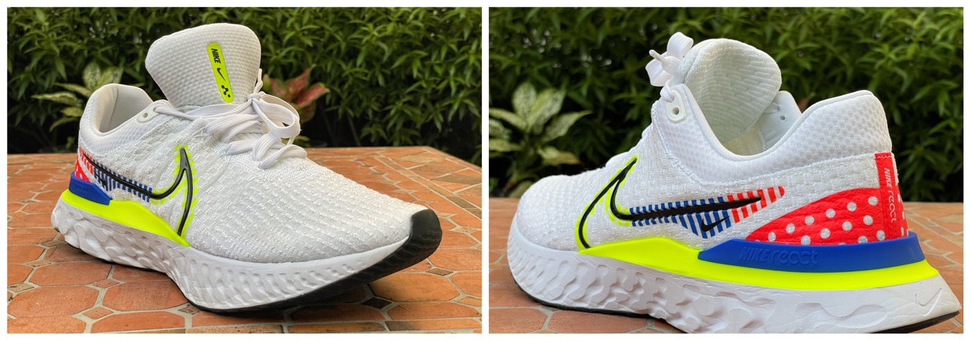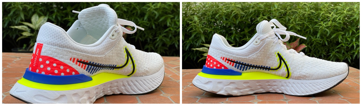 Miếng bọt đệm NIKE REACT (with no carrier, cement or glue) rất nhạy, nhẹ, bền và mềm đáng kể giúp va chạm trên đường hiệu quả hơn - muốn được như vậy đế giữa (midsole) phải cao hơn để tránh va chạm đáy, rộng hơn để phần tiếp xúc mặt đất tốt hơn. Vì vậy nhà thiết kế đã mở rộng phần đế giữa vượt quá chu vi phần trên quanh gót chân để có được sự ổn định cho người chạy.