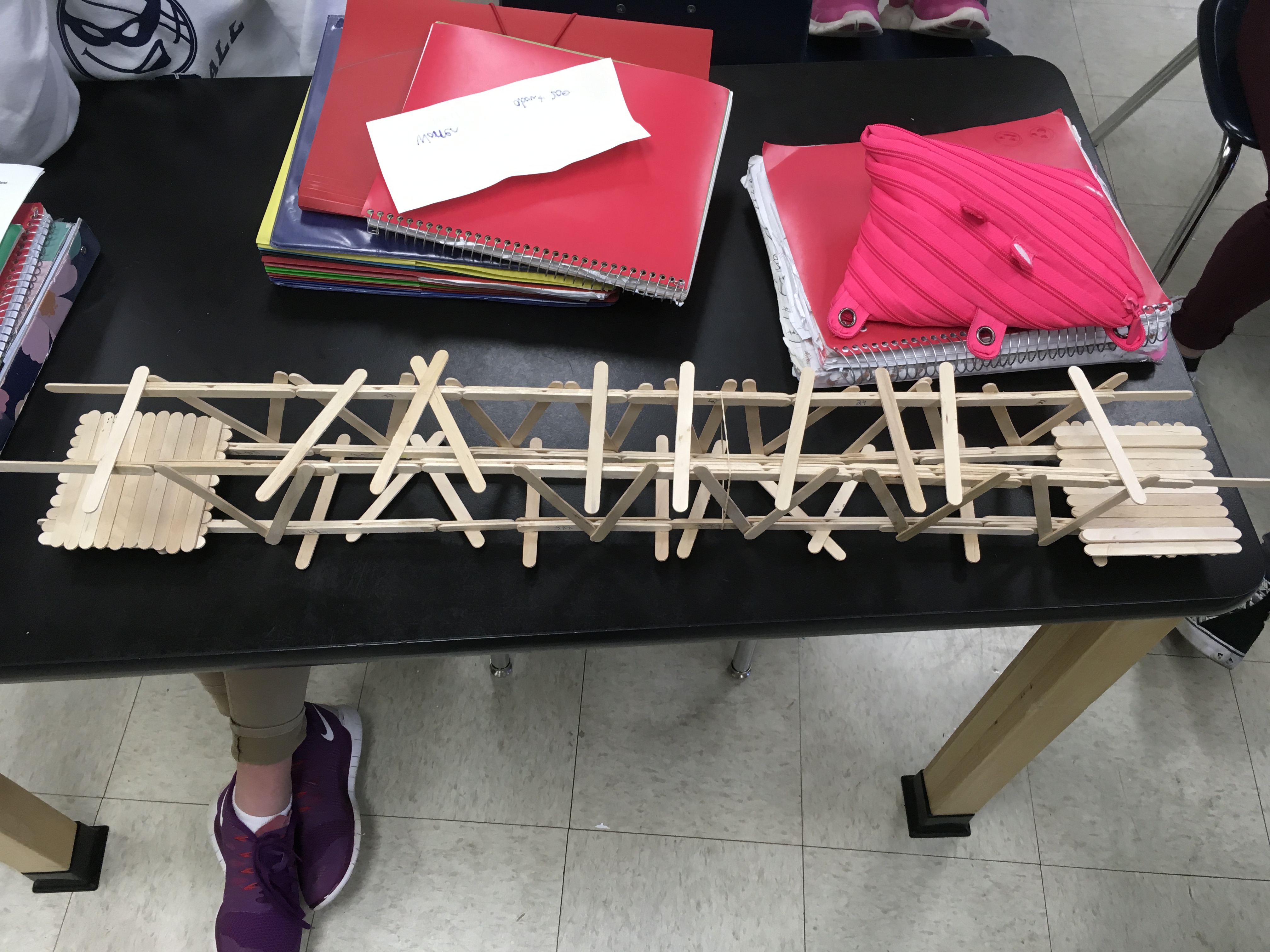 - step 9: continue making triangles along both sides of the bridge (you may consider using paper clips to hold triangles tight to beams so they don't slide around while moving)
