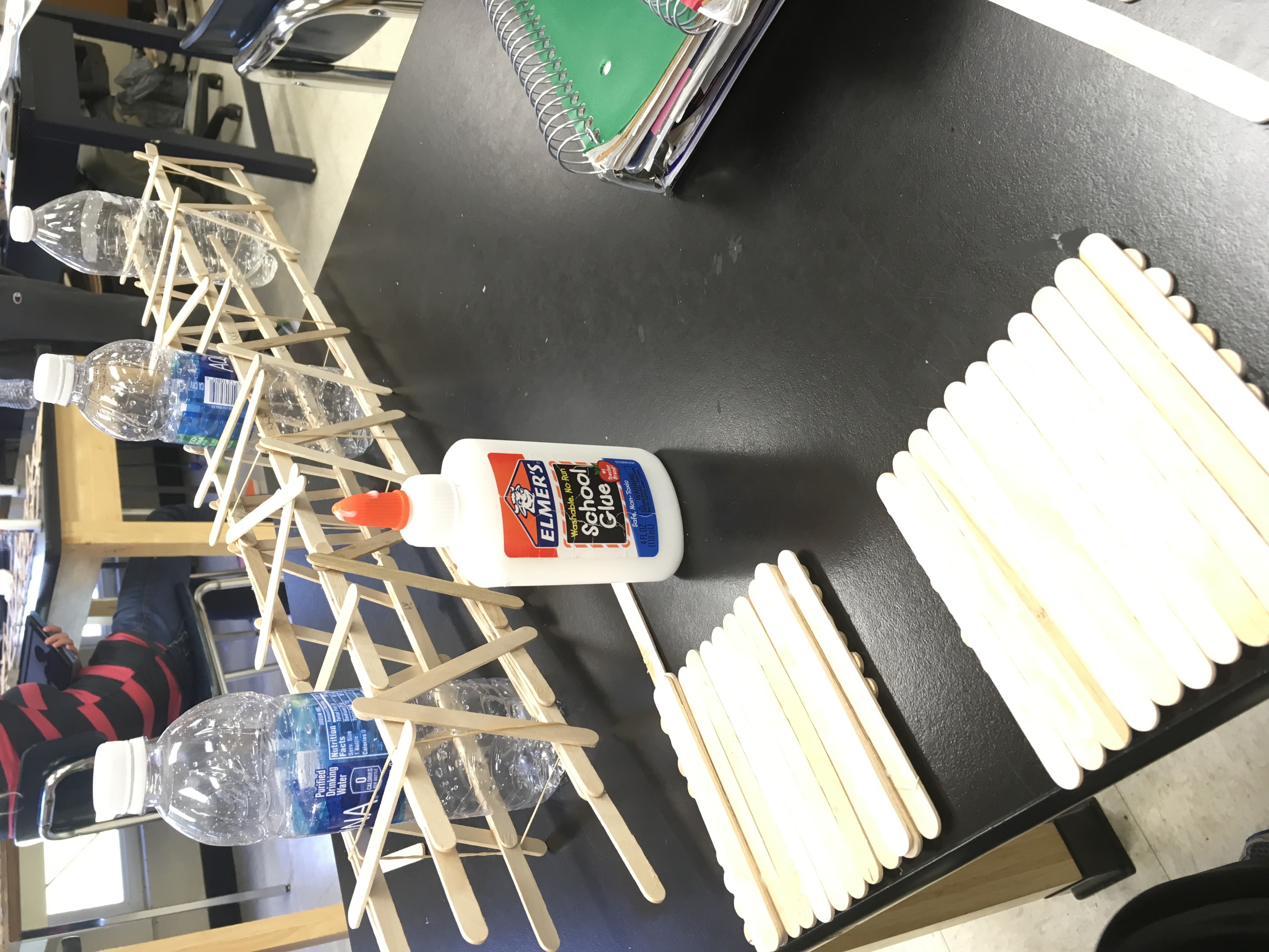 - step 12: use rubber bands and place around both sides of your bridge with water bottles in between, should stand up on its own now
