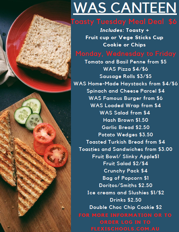 The Canteen has revised the Menu for the remainder of Term 1, please click HERE for more information, or to order please log into flexischools.com.au.