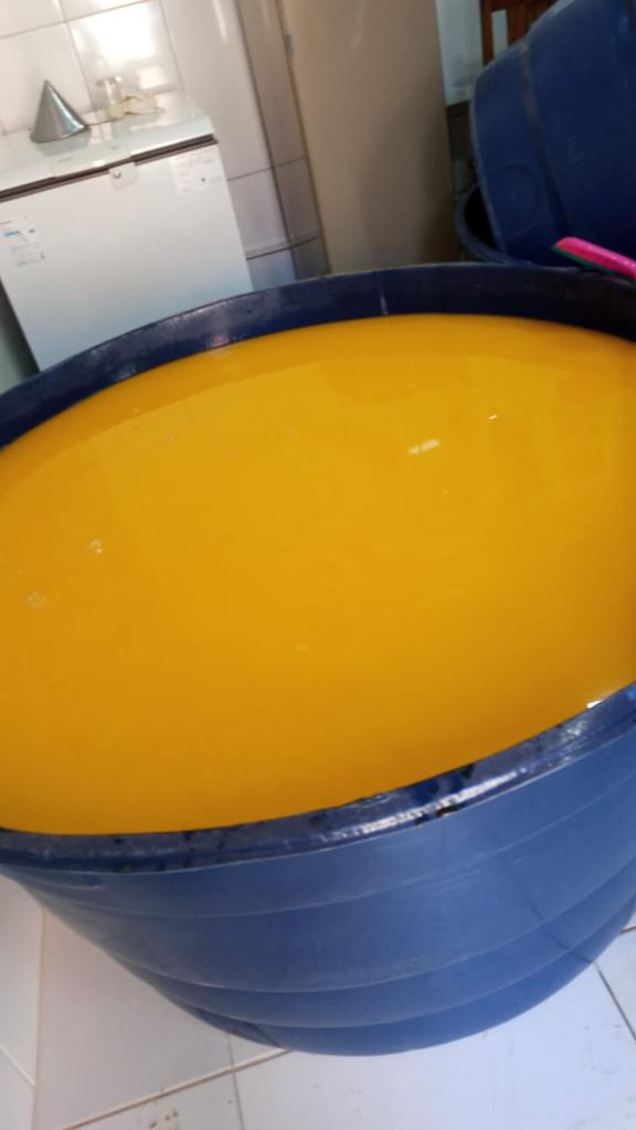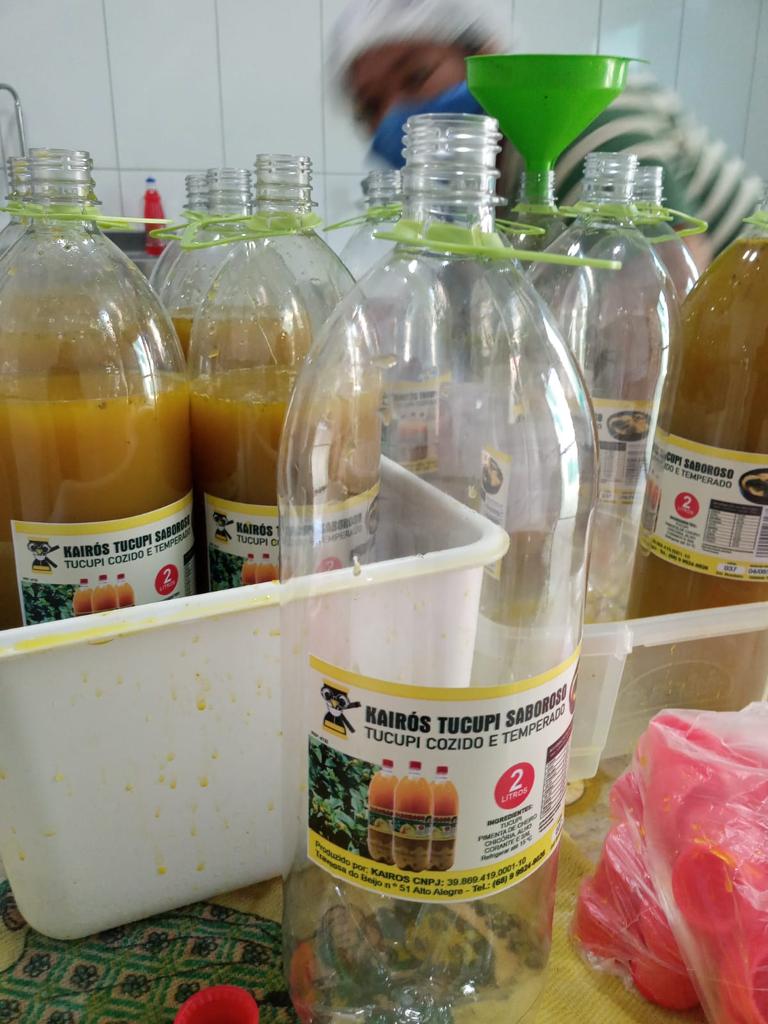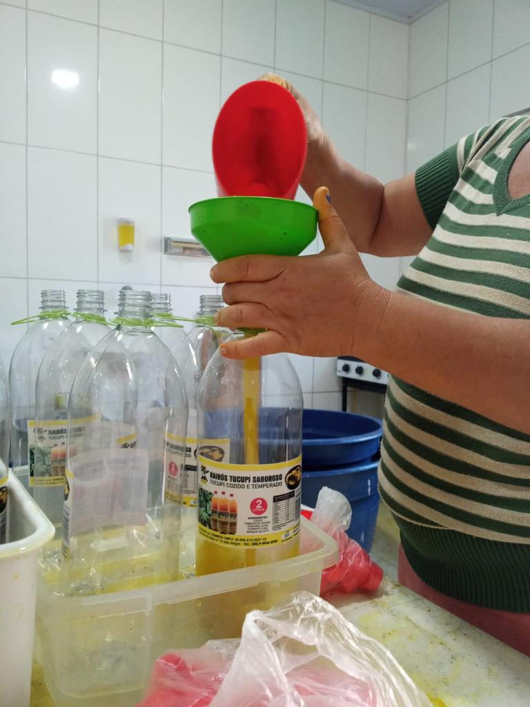 Na cozinha industrial montada no bairro Alto Alegre, em Rio Branco, o tucupi fica entre 4 e 5 dias acurando até ficar bem azedo. Depois, é colocado pra ferver e temperar com uma mistura de alho, chicória e pimentinha de cheiro.