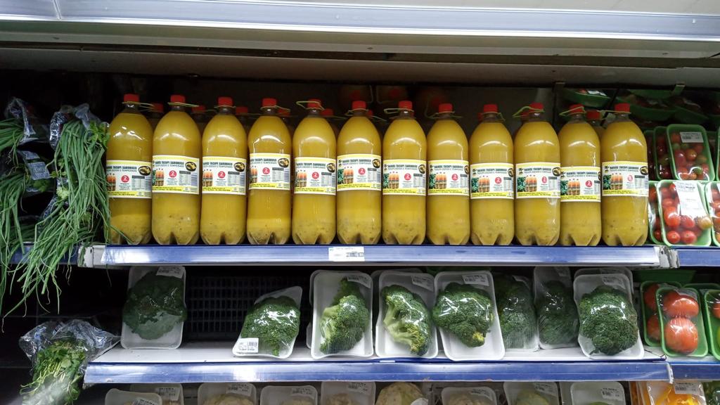 O tucupi, feito da própria mandioca que Maura planta, é vendido bem temperadinho e pronto pro consumo!