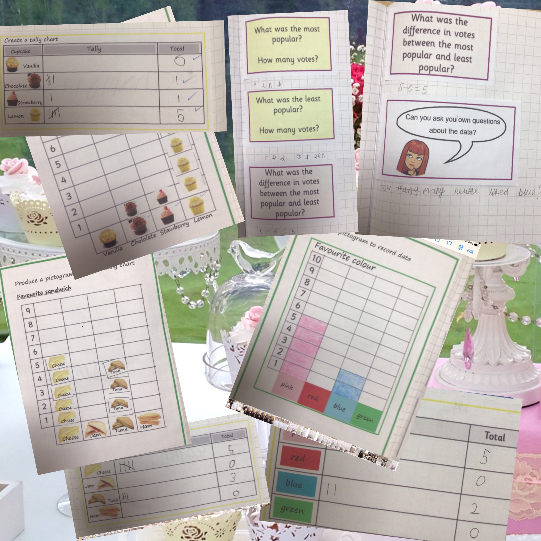 We did some research in maths, asking simple questions and tallying and comparing data to help us find out what cupcakes the dinner ladies like and what their favourite colours are. We then used this information to influence our product designs.