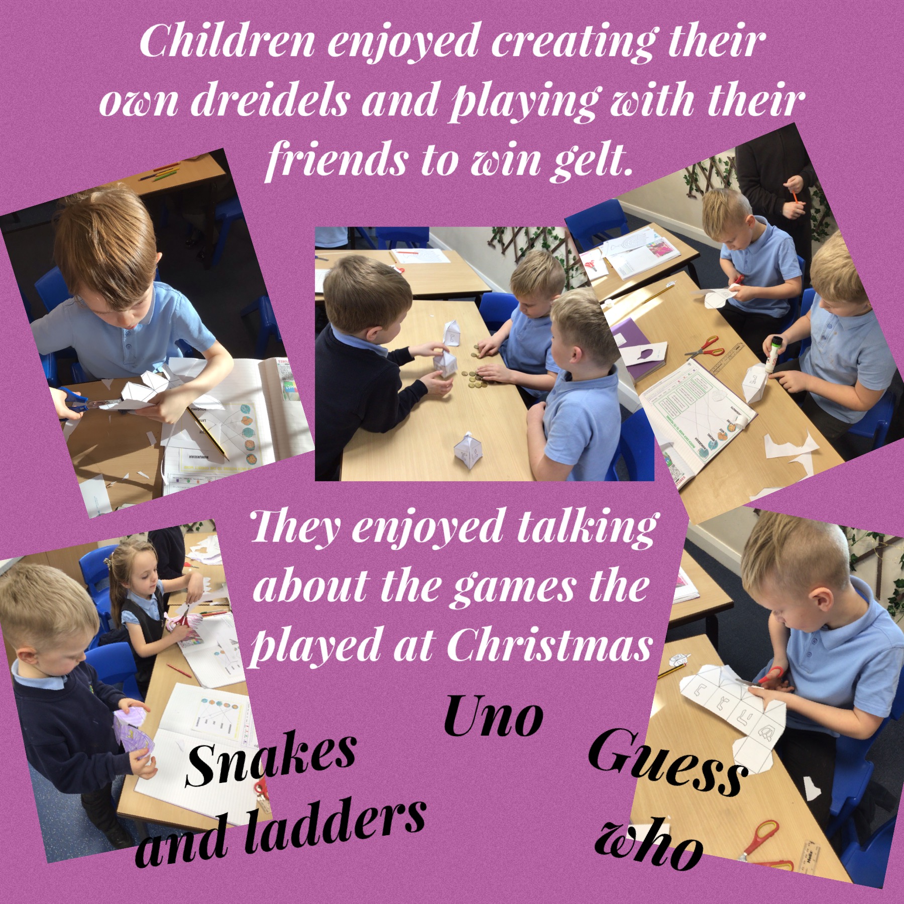 We looked at the Jewish festival of Hanukkah and enjoyed making our own dreidels and playing the game with our friends.