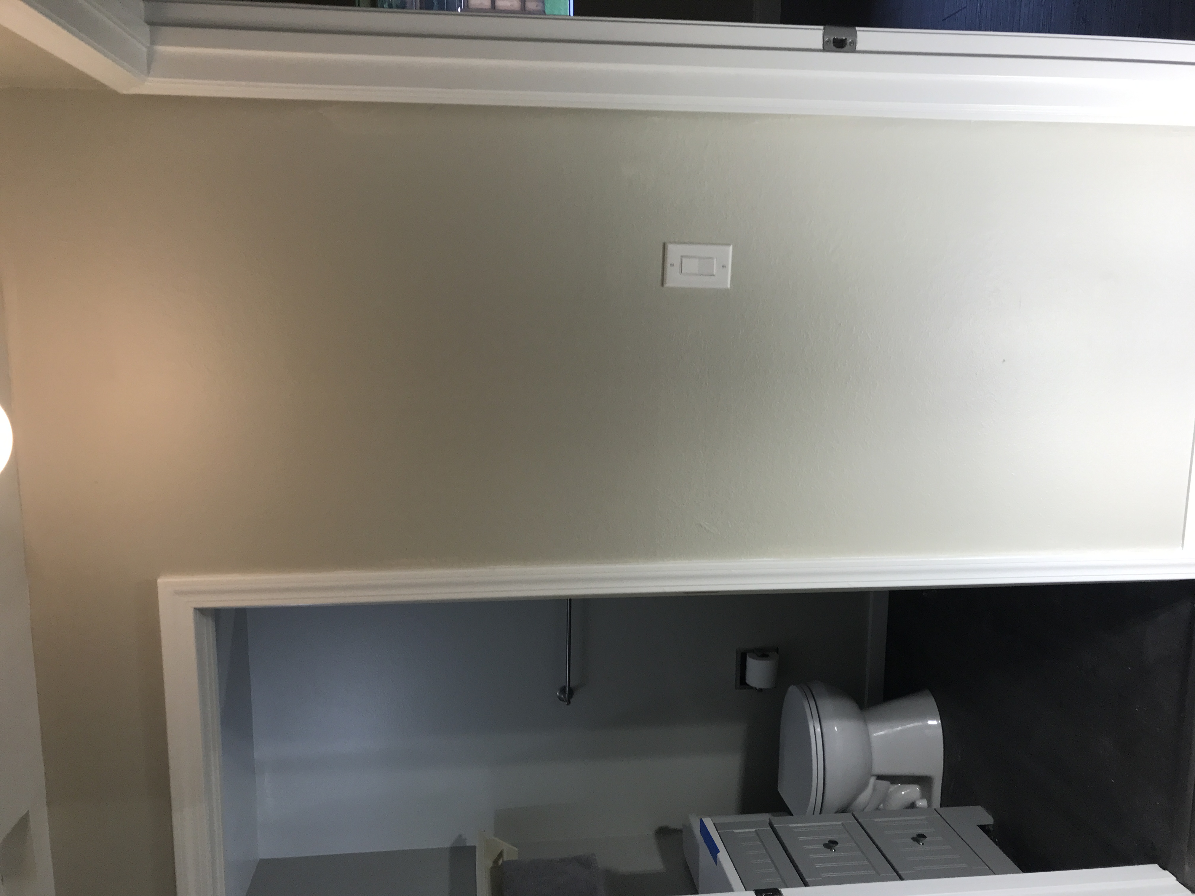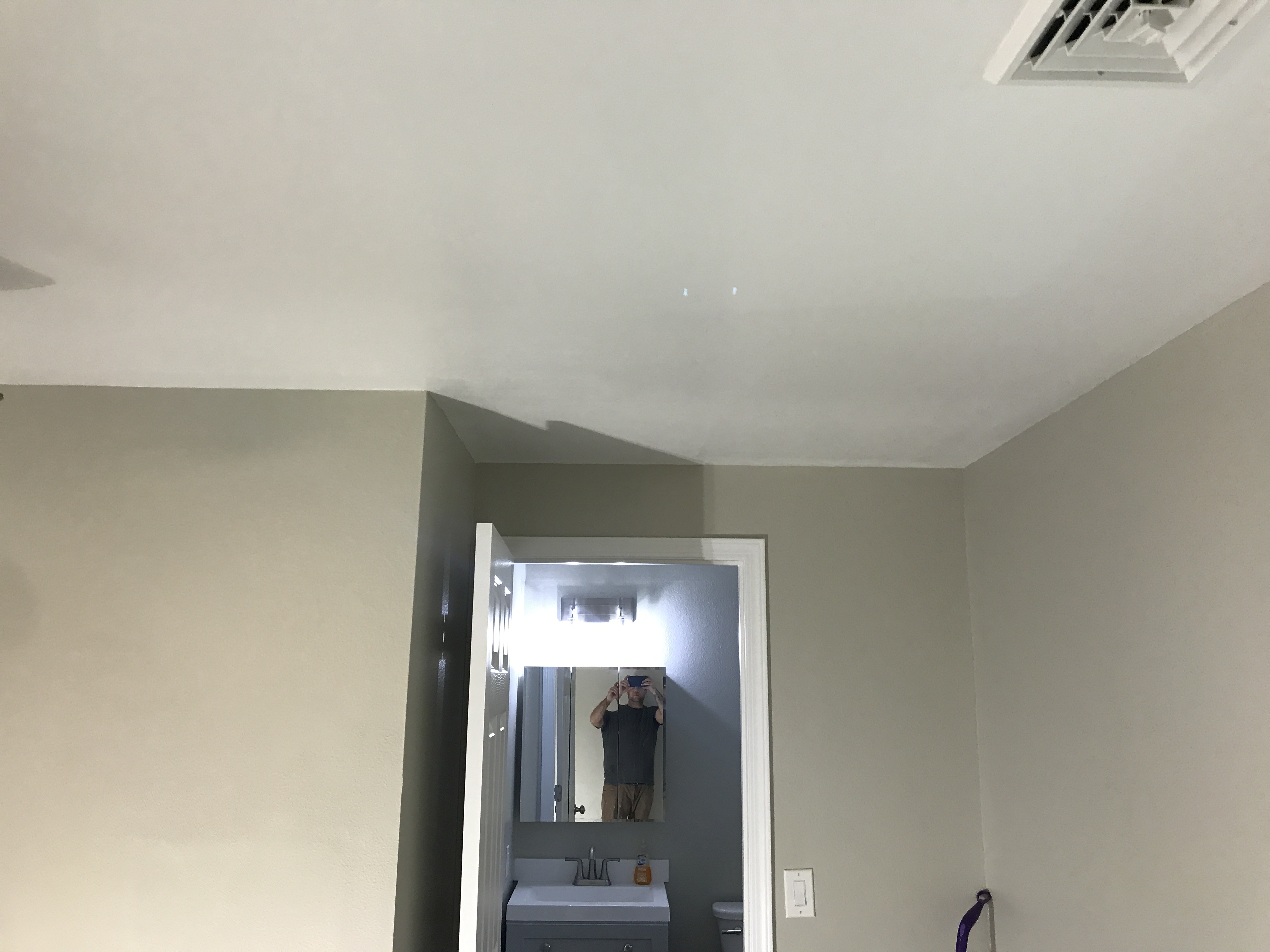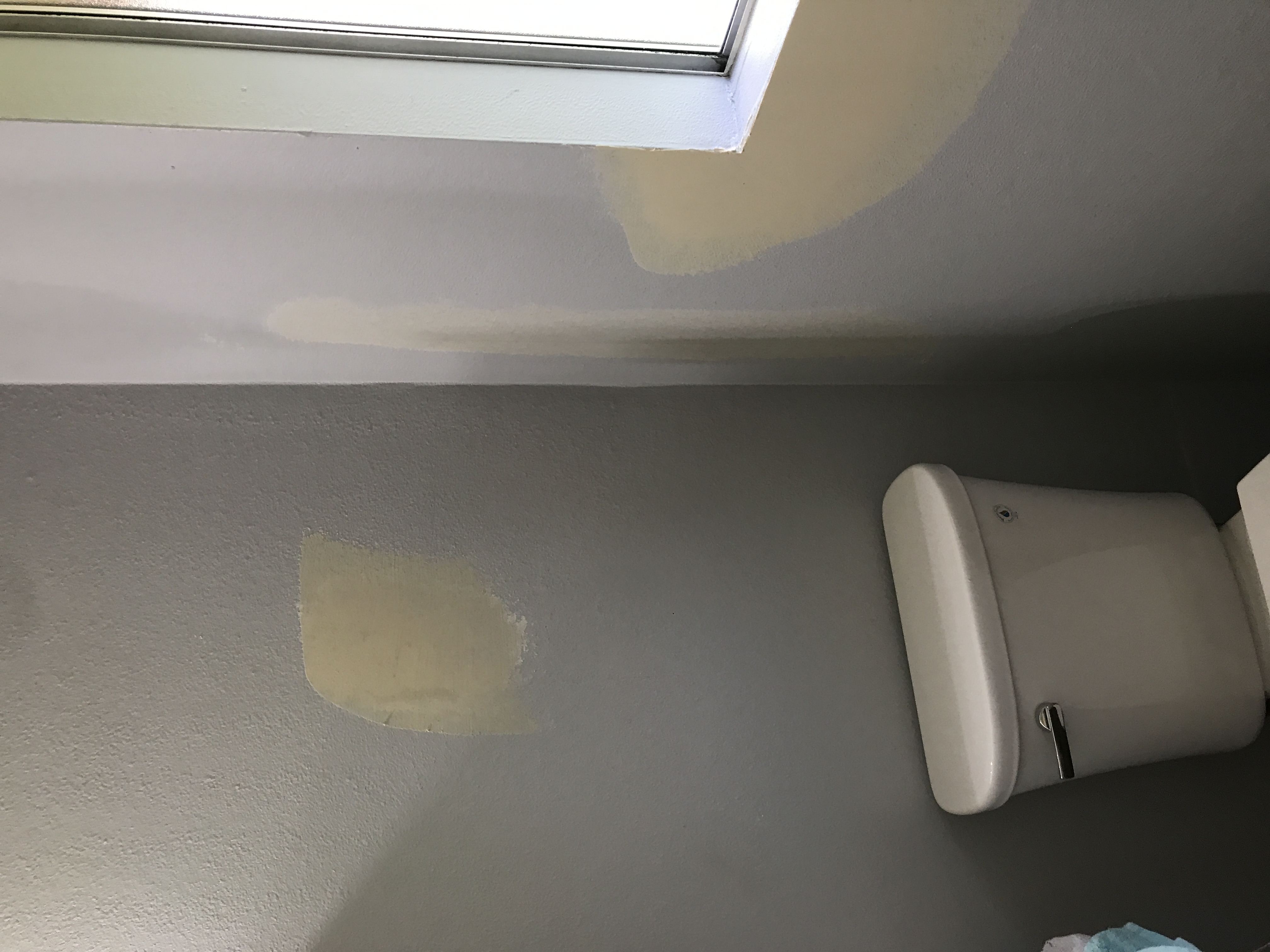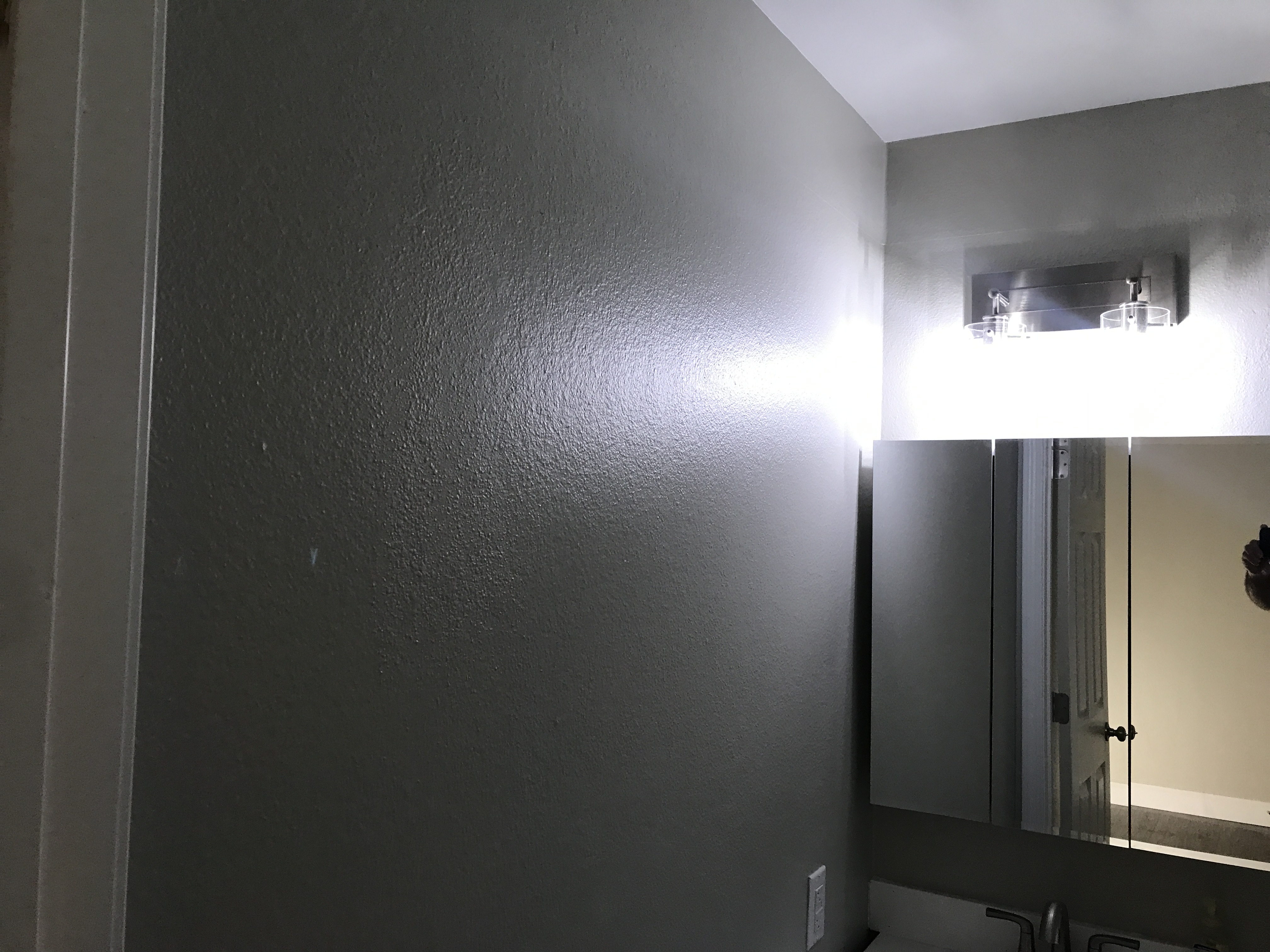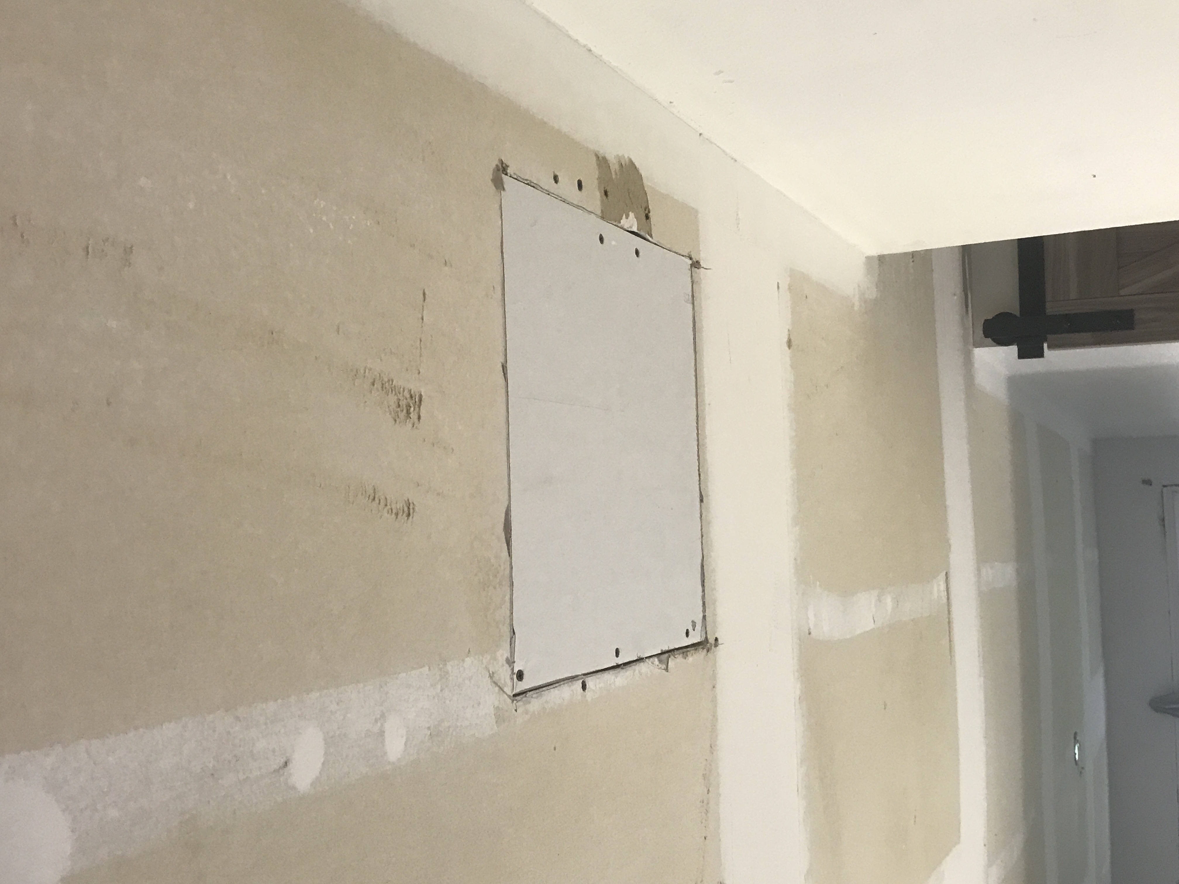 Master bathroom patch - wall is painted wallpaper left on wall - doing our best to match texture on the wall