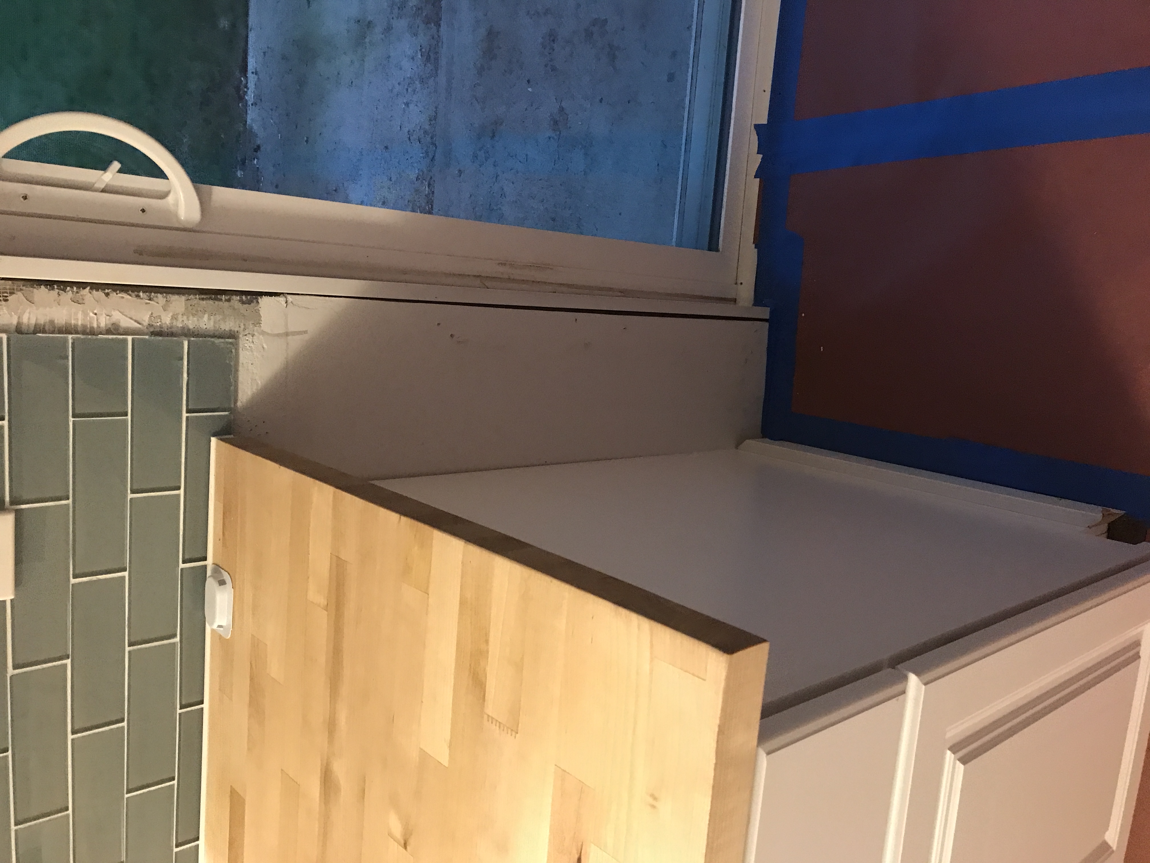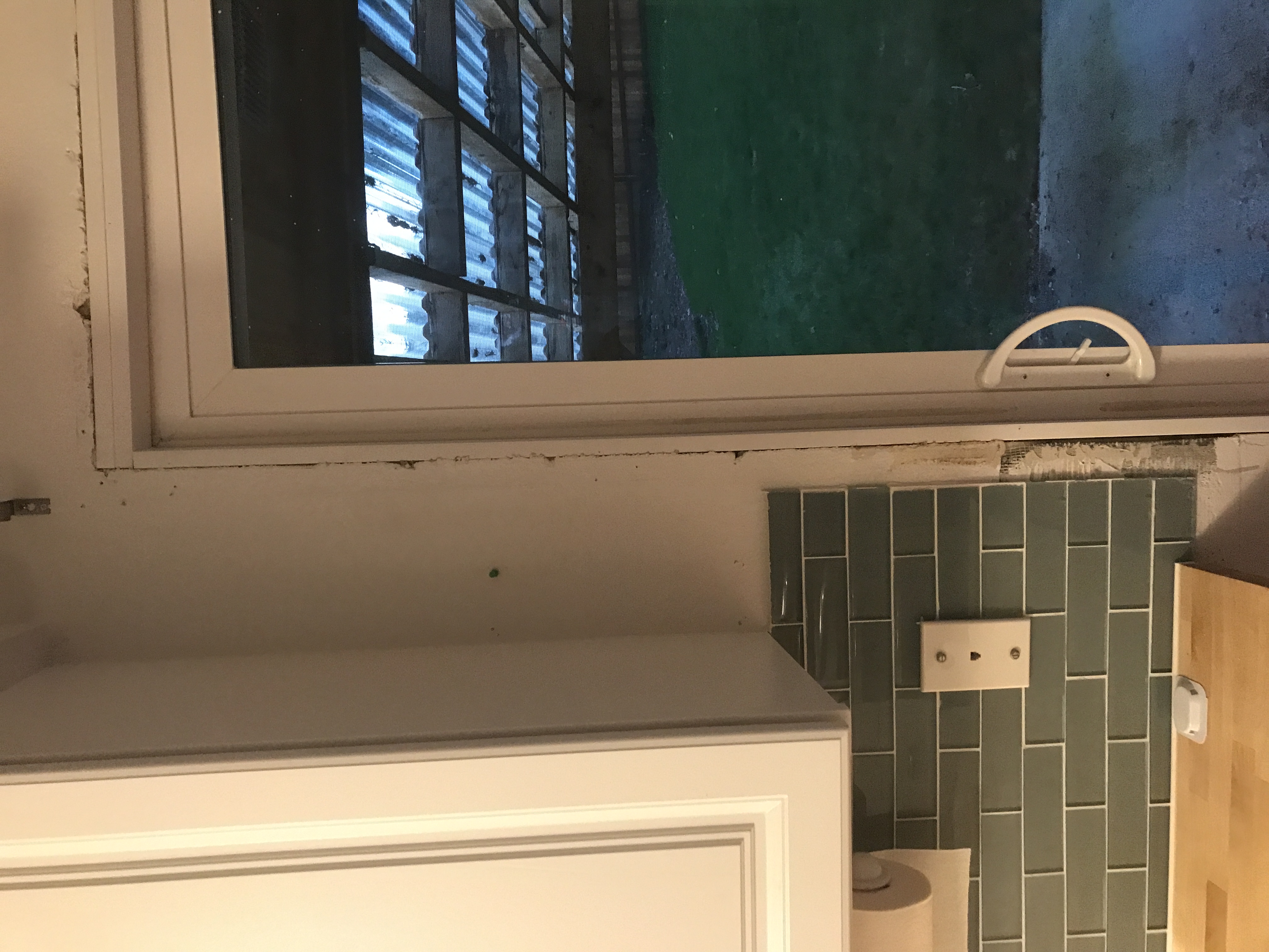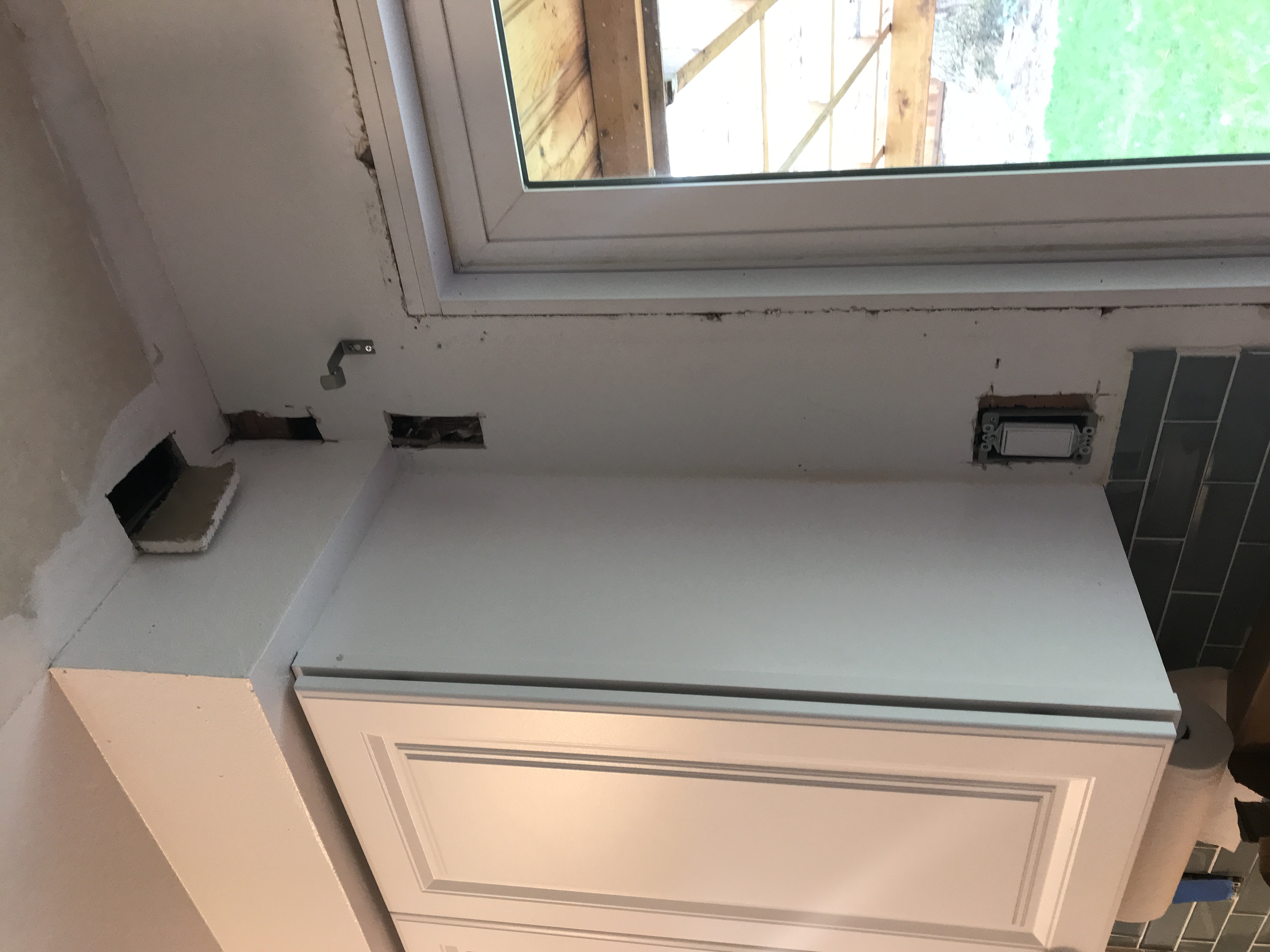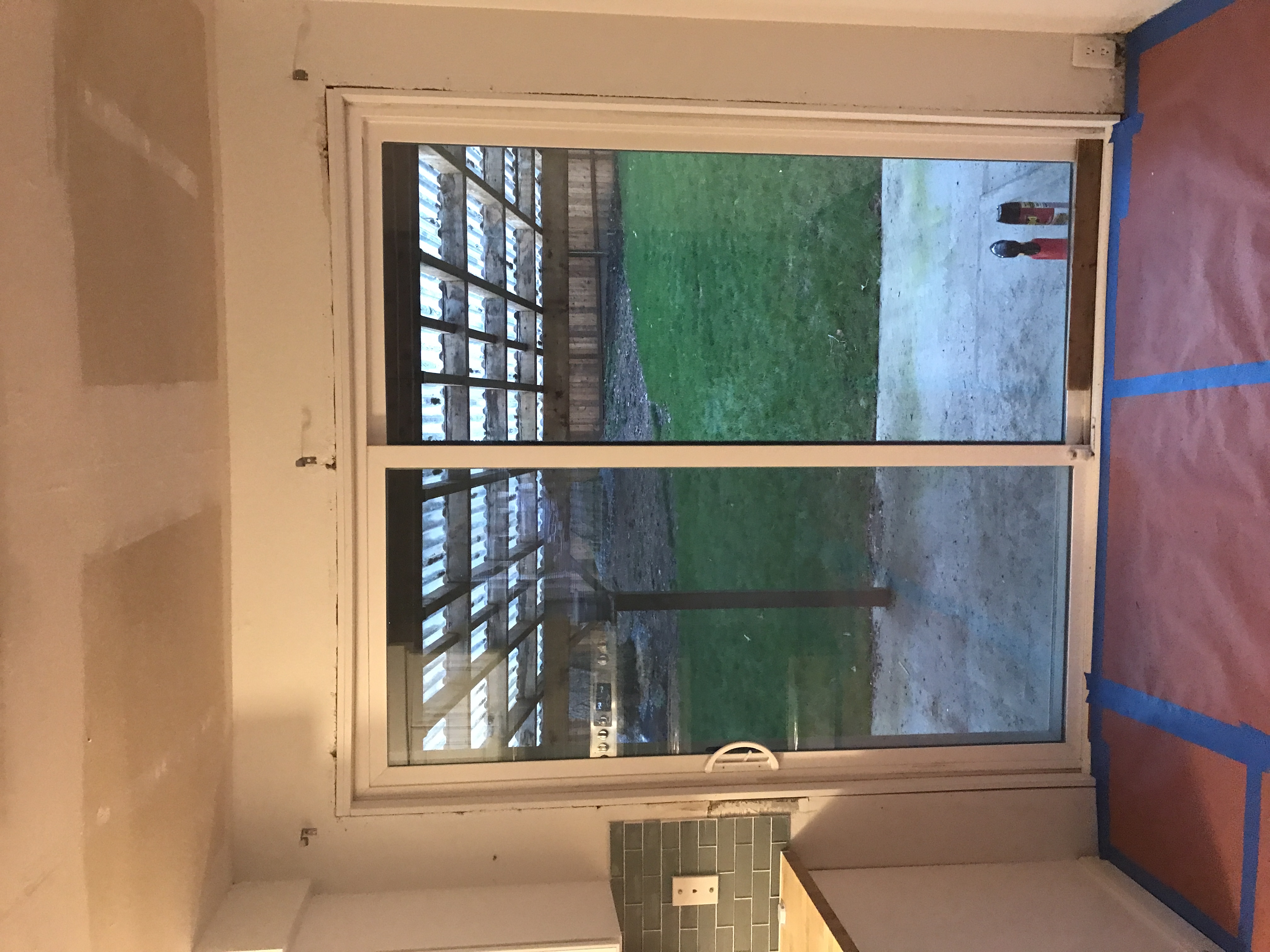 New kitchen Window Installed with inside sill trimmed out and drywall taped and drywall mud finished tight to the window