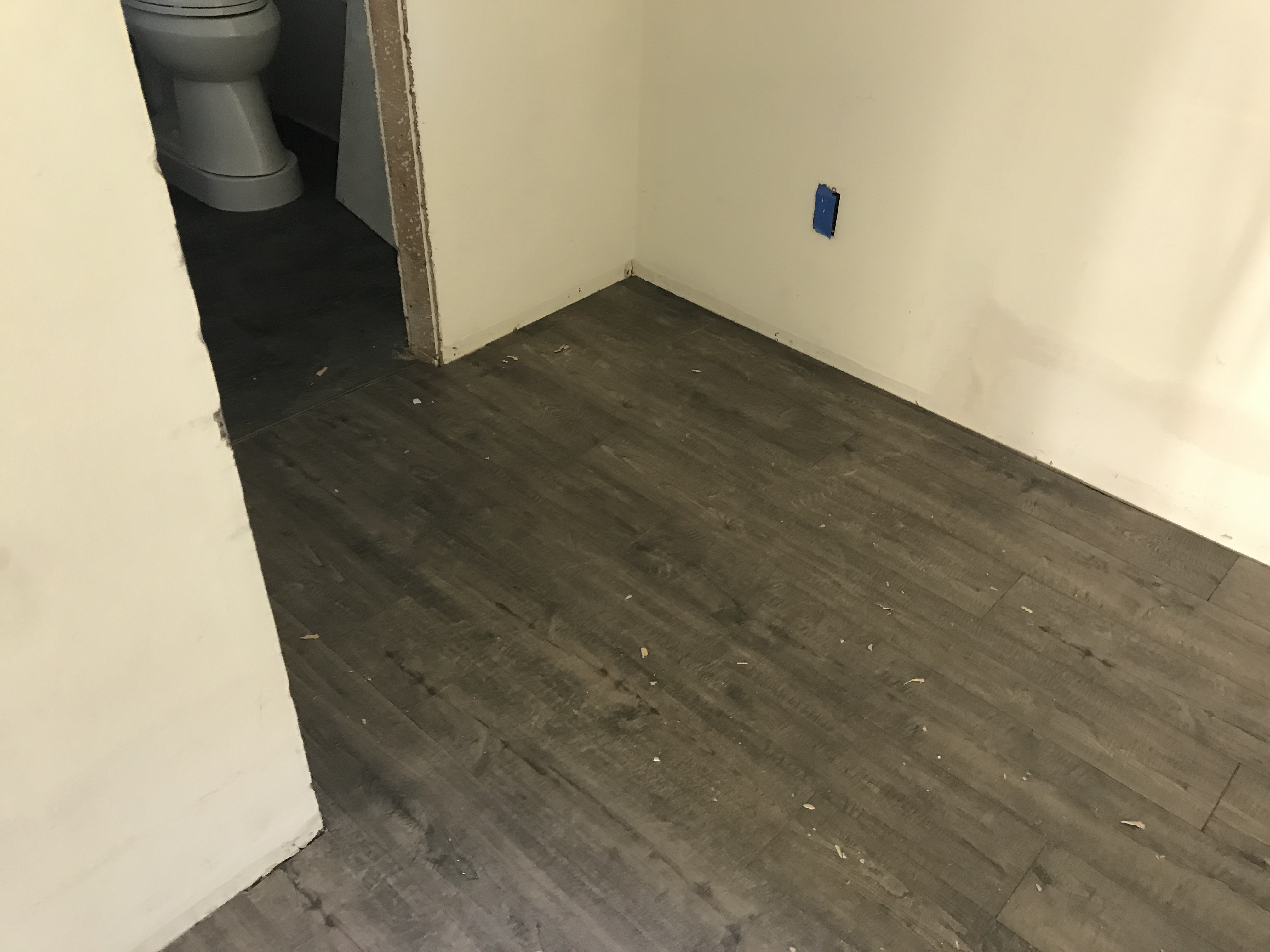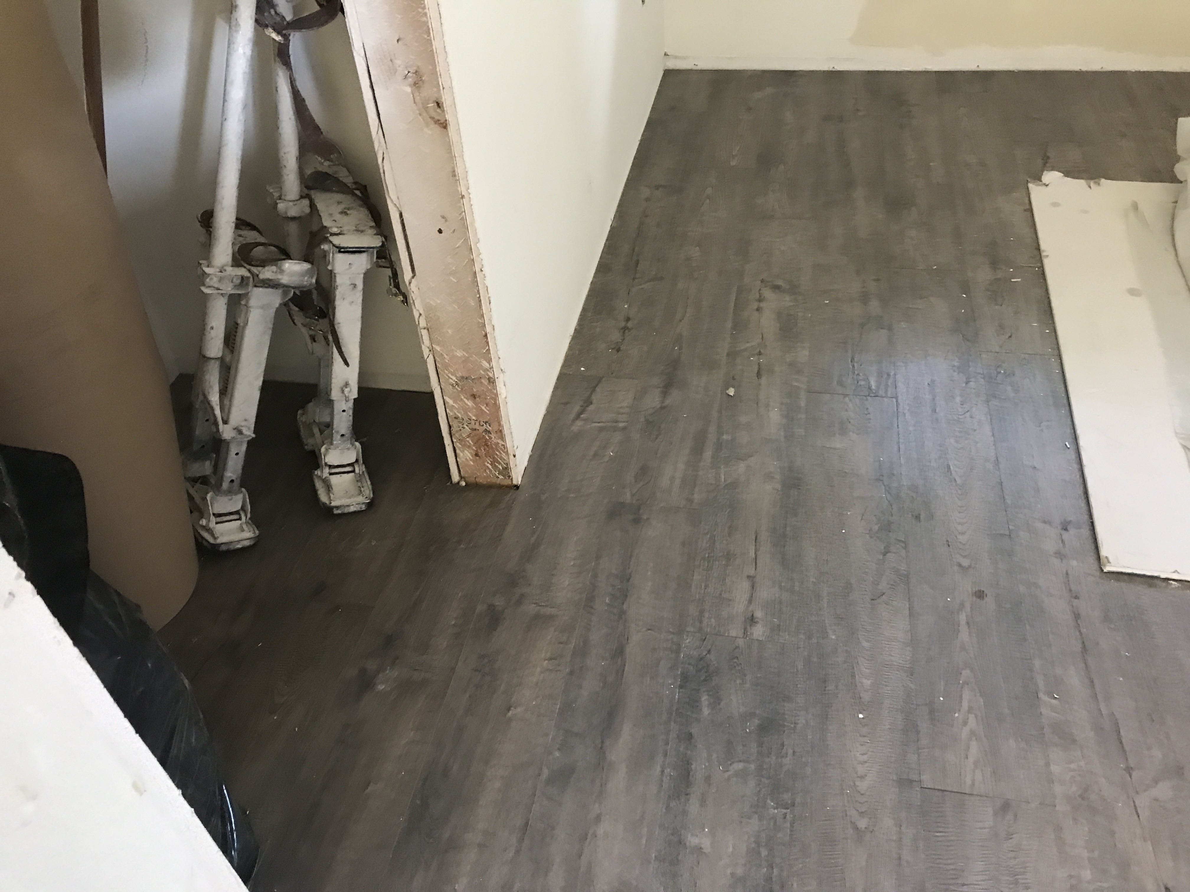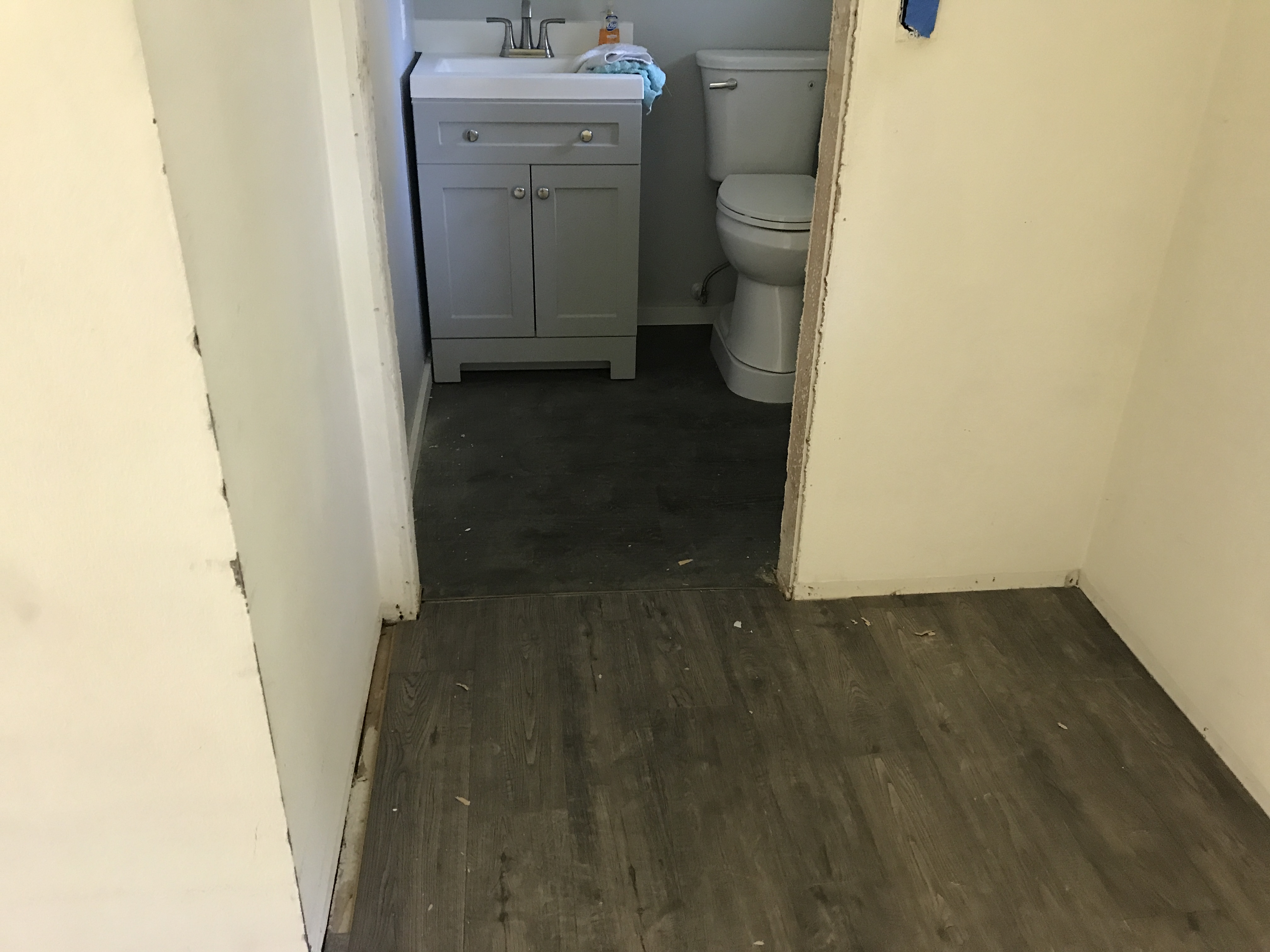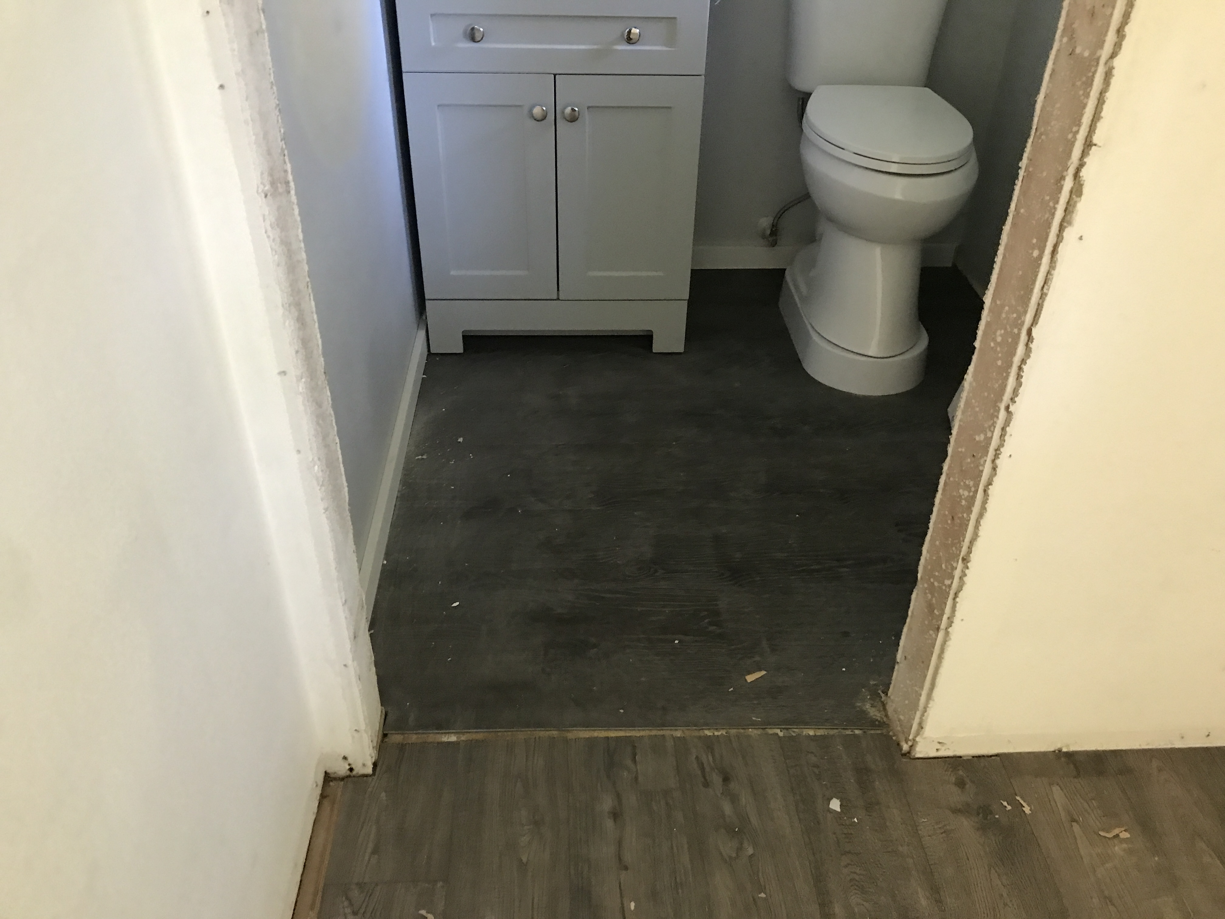 Vinyl Laminate Wood Flooring installation tying into existing flooring in bathrooms and kitchen