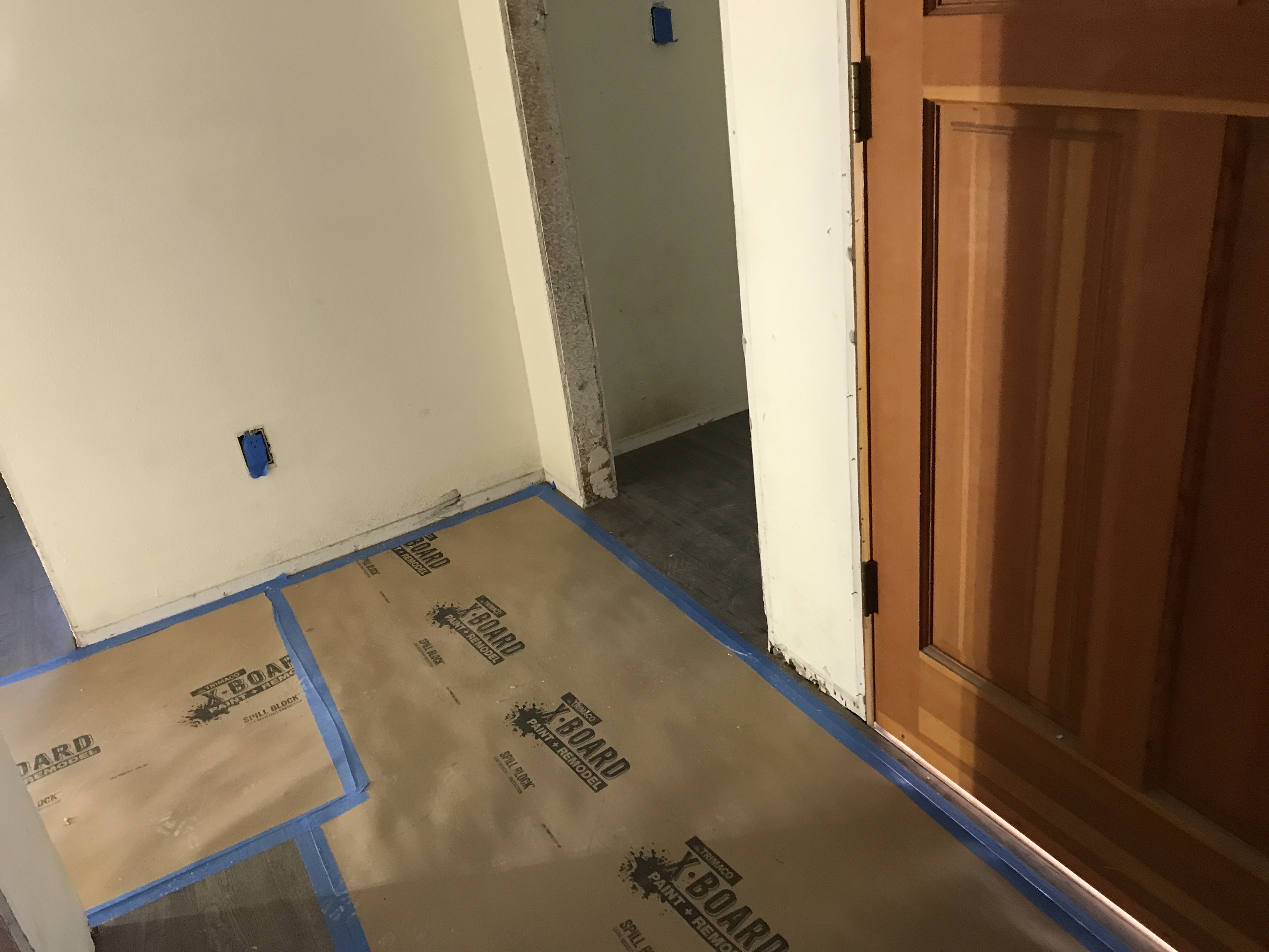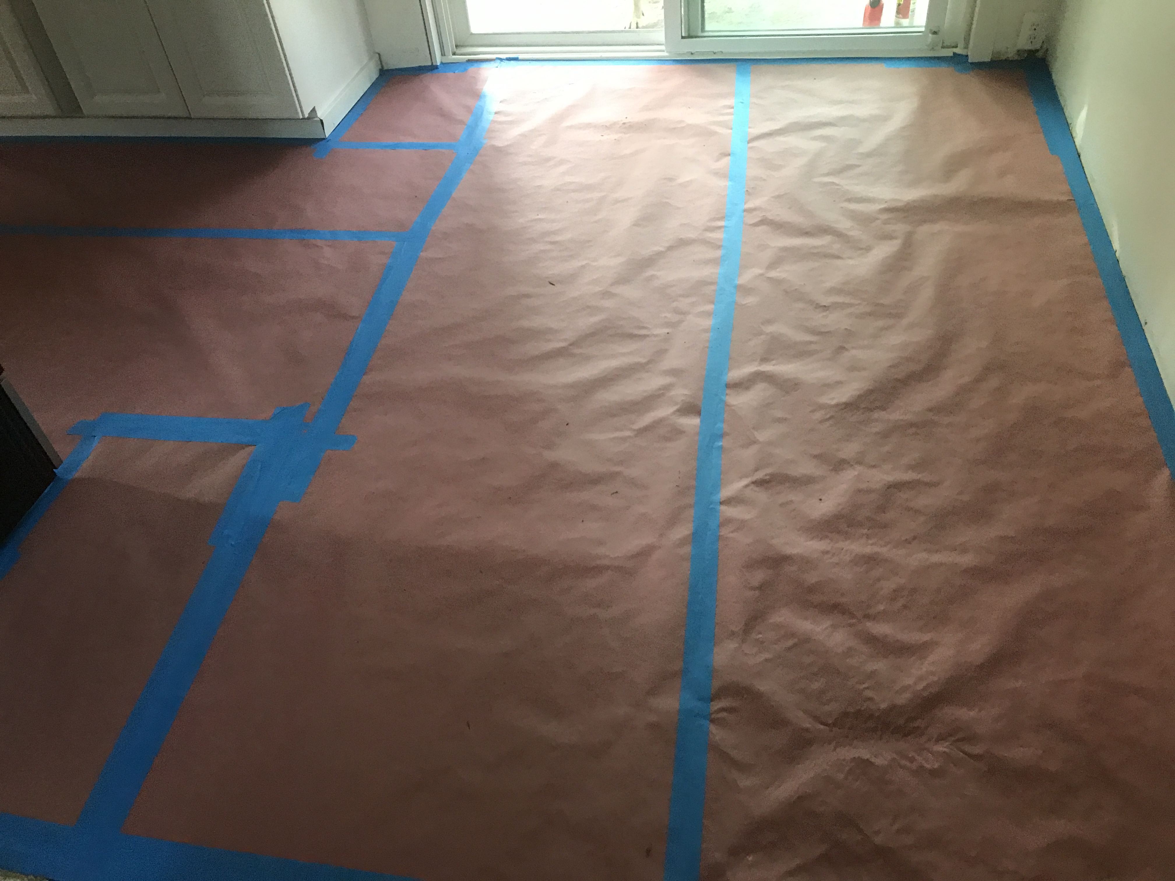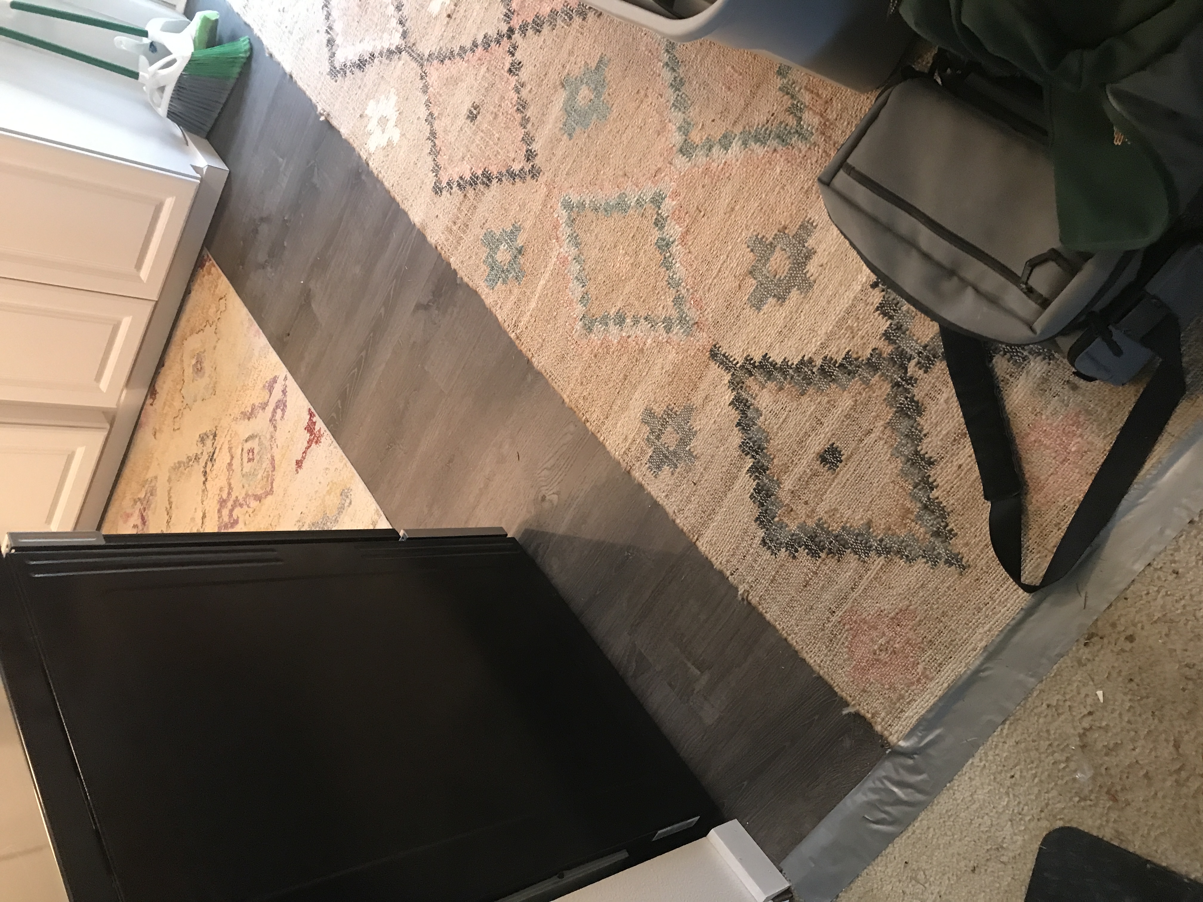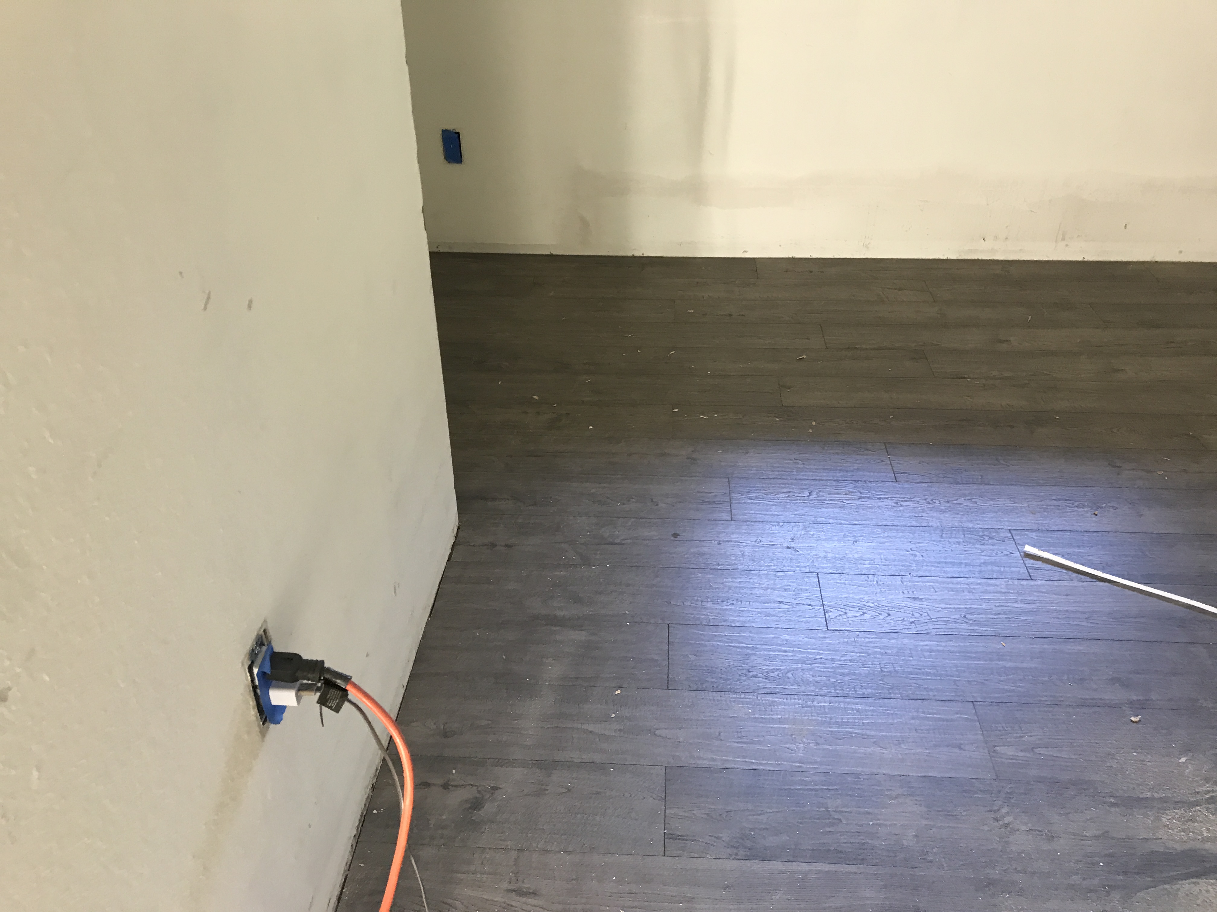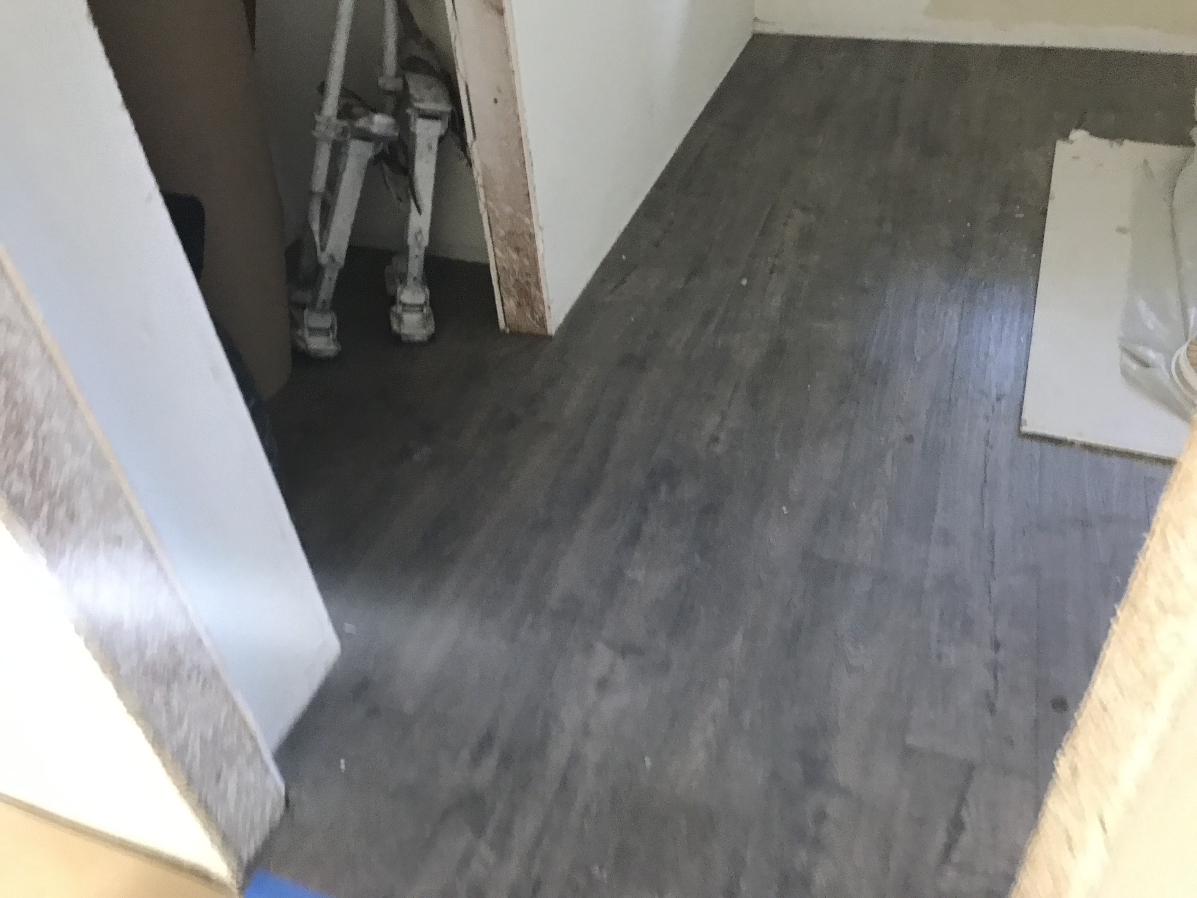 Vinyl Laminate Wood Flooring installation tying into existing flooring in bathrooms and kitchen