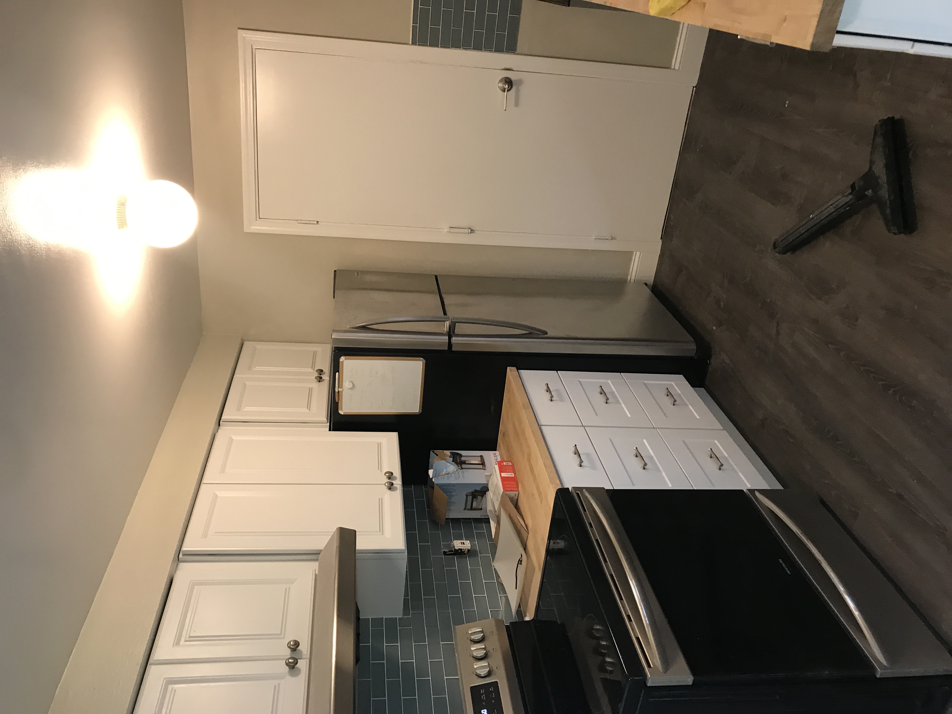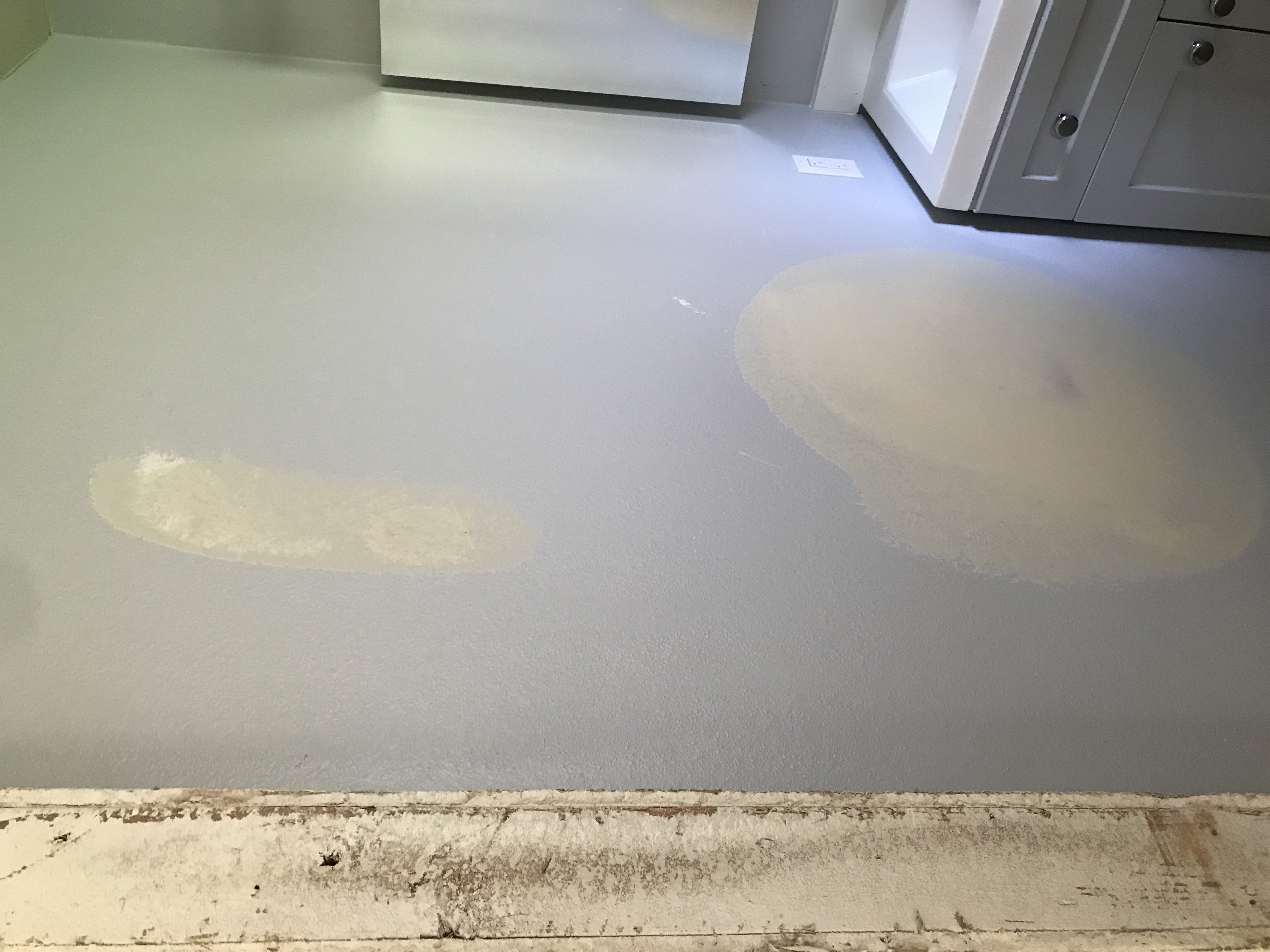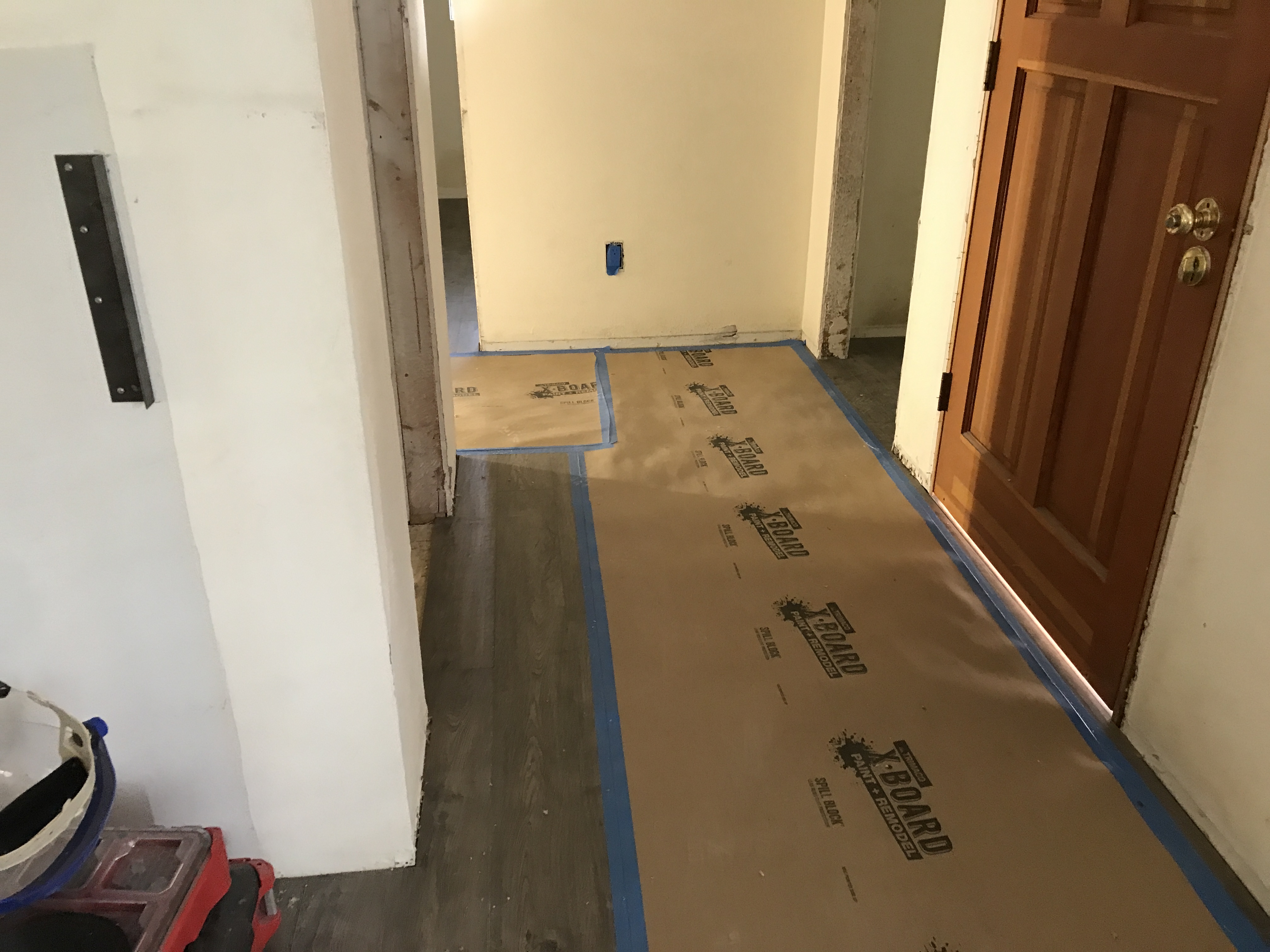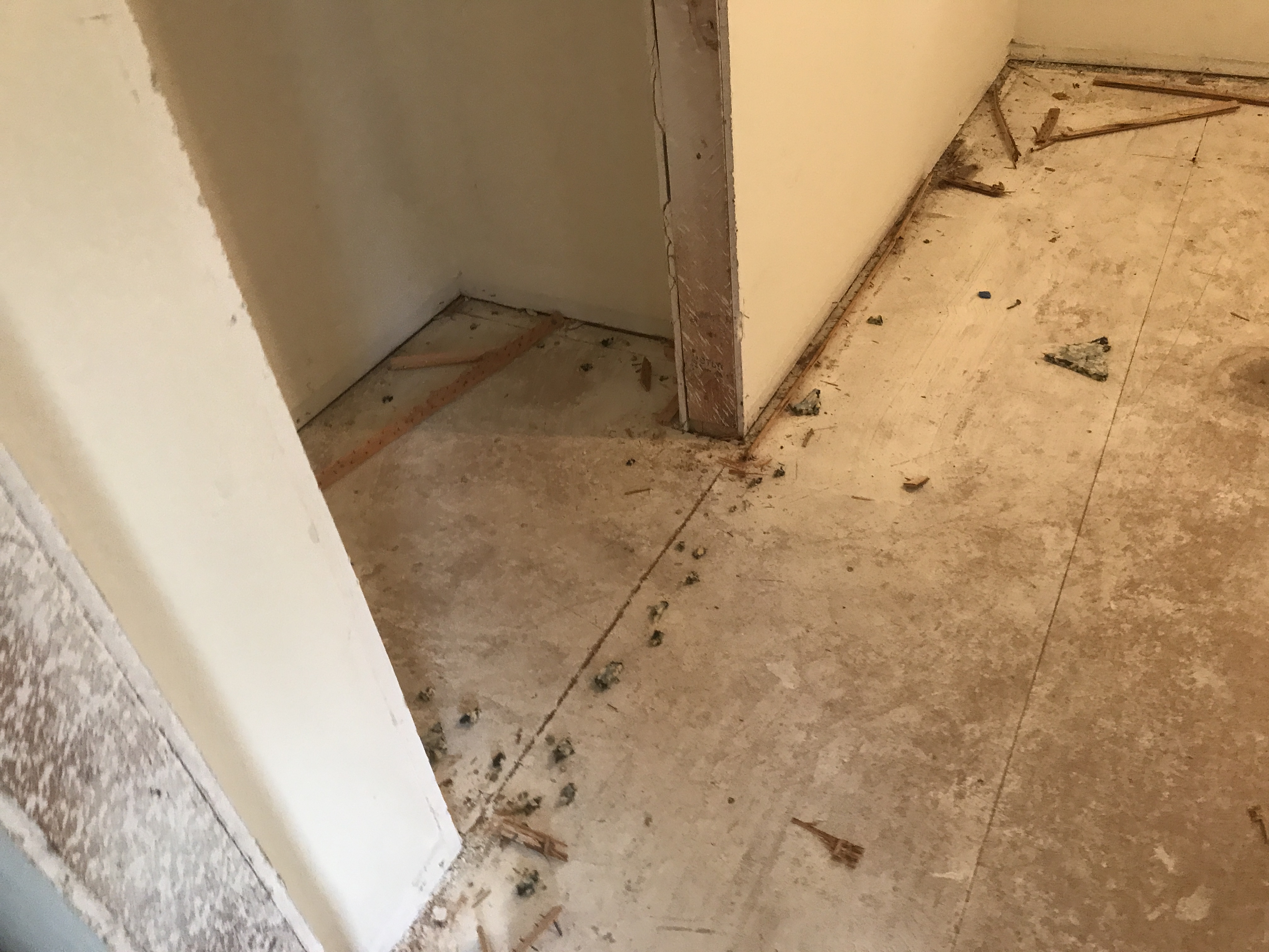 Vinyl Laminate Wood Flooring installation tying into existing flooring in bathrooms and kitchen