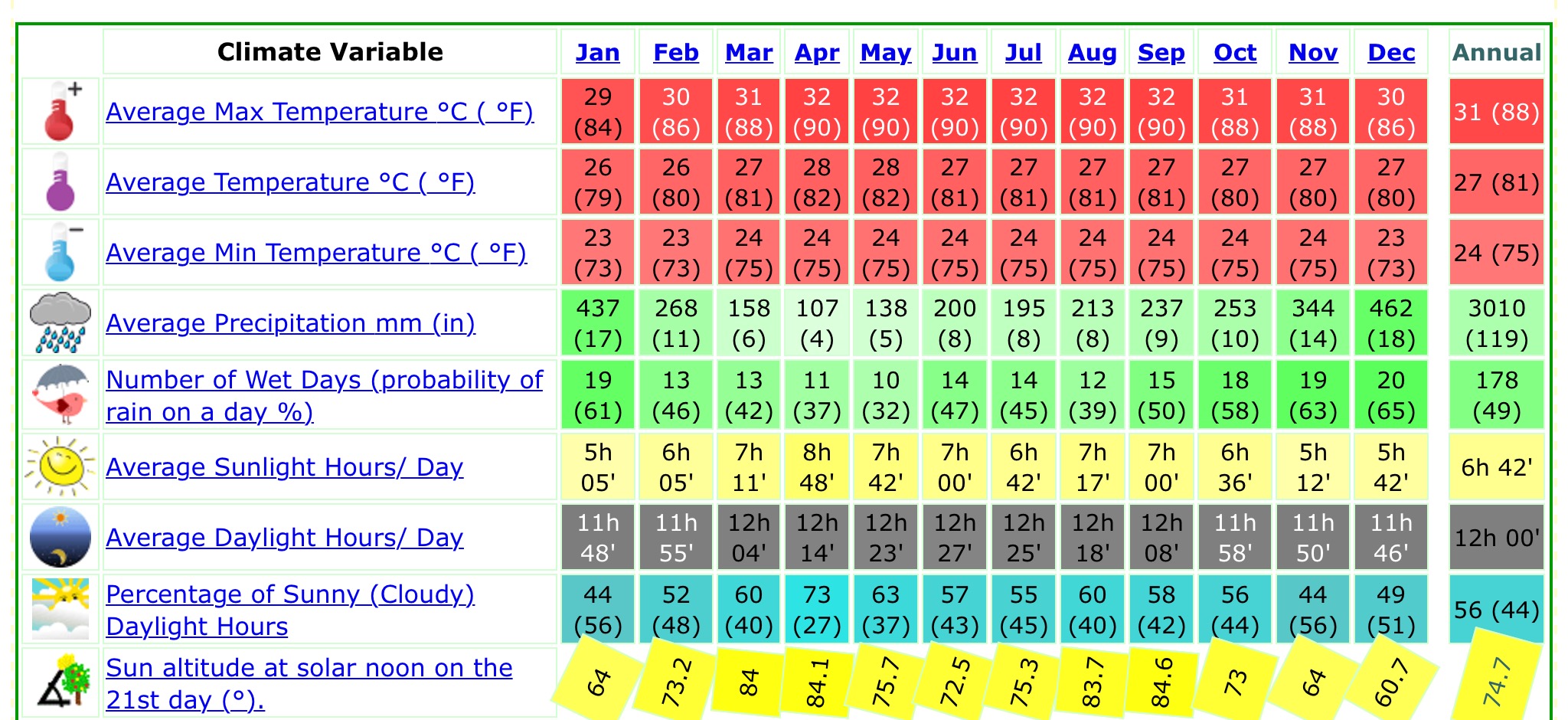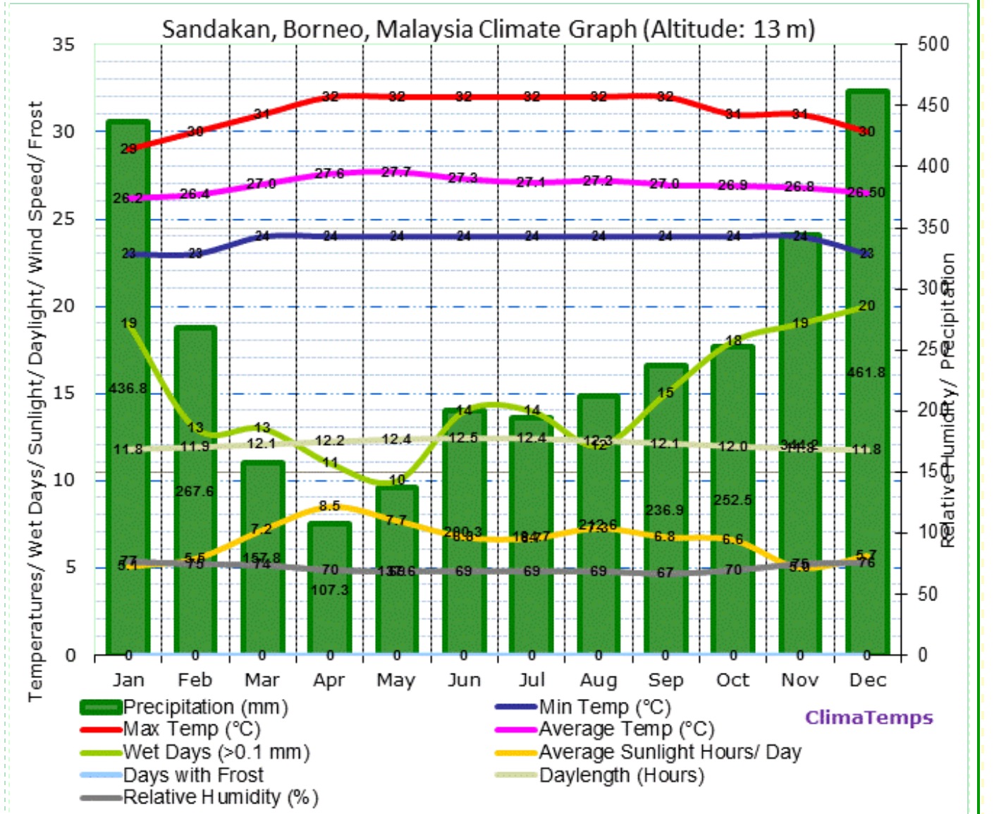 "Sandakan, Borneo Climate & Temperature." Sandakan, Borneo Climate Sandakan, Borneo Temperatures Sandakan, Borneo Weather Averages. N.p., n.d. Web. 01 Apr. 2016. <http://www.borneo.climatemps.com/>.