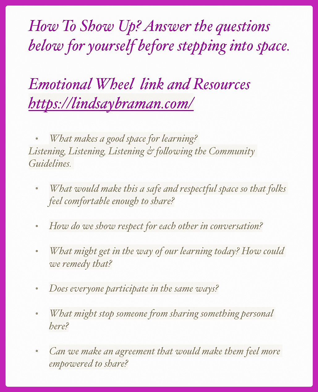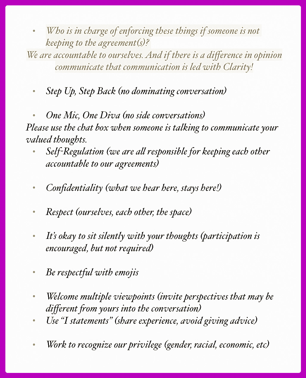 What would make this a safe and respectful space so that folks feel comfortable enough to share?