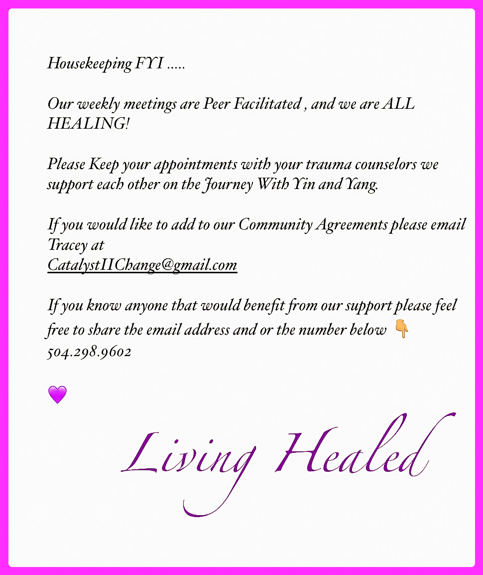 Please Keep your appointments with your trauma counselors we support each other on the Journey With Yin and Yang.