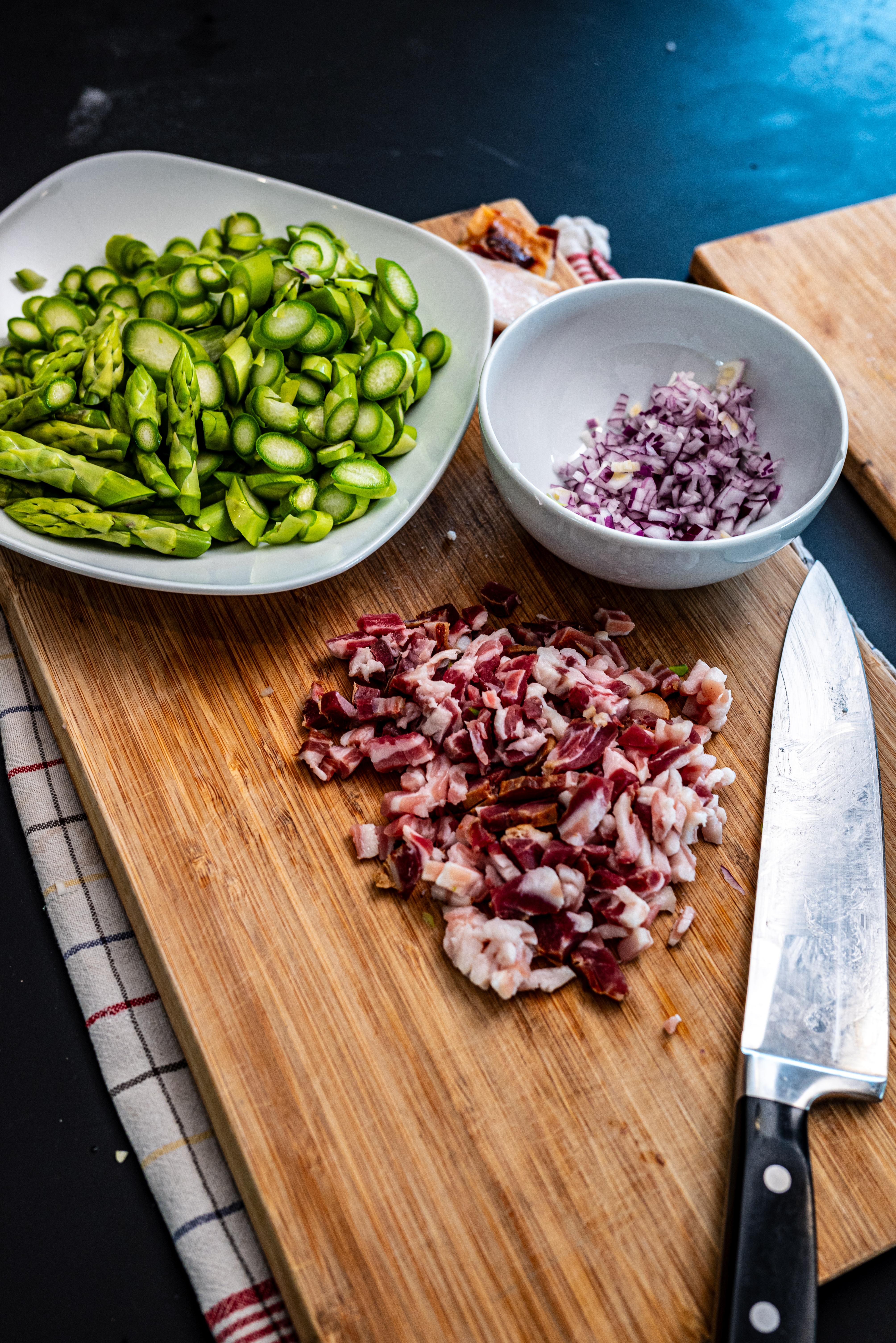 Beim grünen Spargel könnt ihr einfach die unteren, holzigen Enden abbrechen. Dazu könnt ihr den Spargel biegen, dabei merkt ihr dann, wo der Spargel fest bzw. holzig ist und brecht den Teil einfach ab. Den Spargel dann einfach in feine Scheiben schneiden. Die Schwarte vom Speck abschneiden und ihn dann in kleine Würfel schneiden. Die Zwiebel auch in kleine Würfel schneiden.