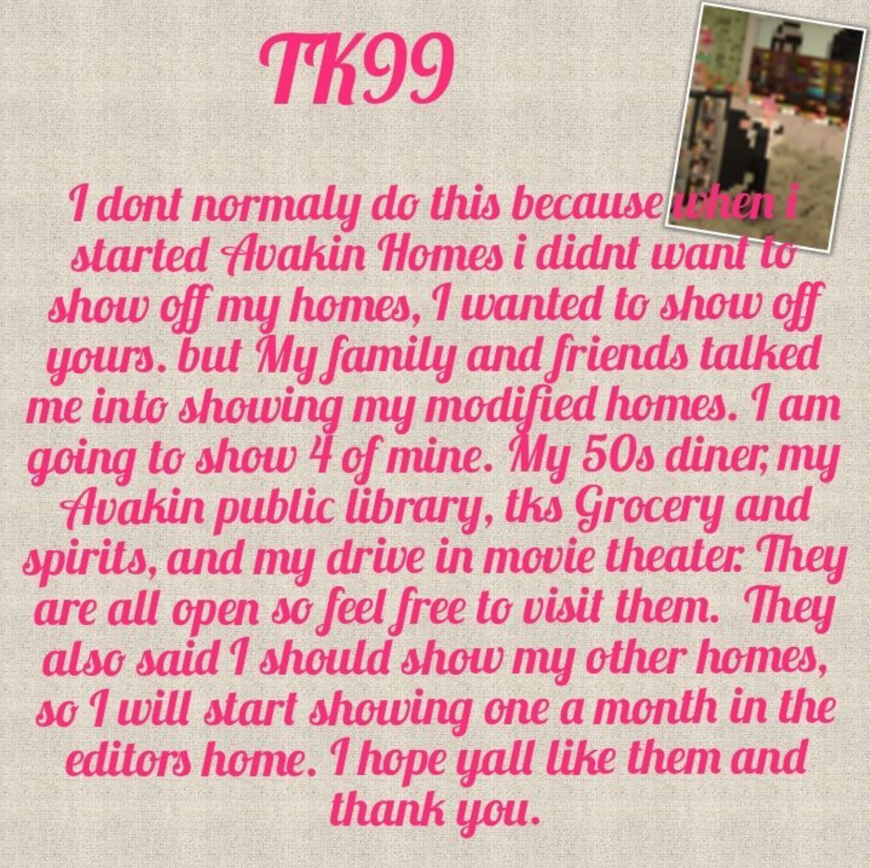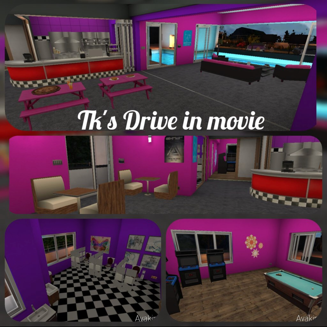 In this week’s edition of Avakin Homes, Tk99 shows us around some of her own amazingly themed decorative designs, including a 50’s Diner, Library, Grocery and Spirits store, and a Drive-In Movie Theatre.