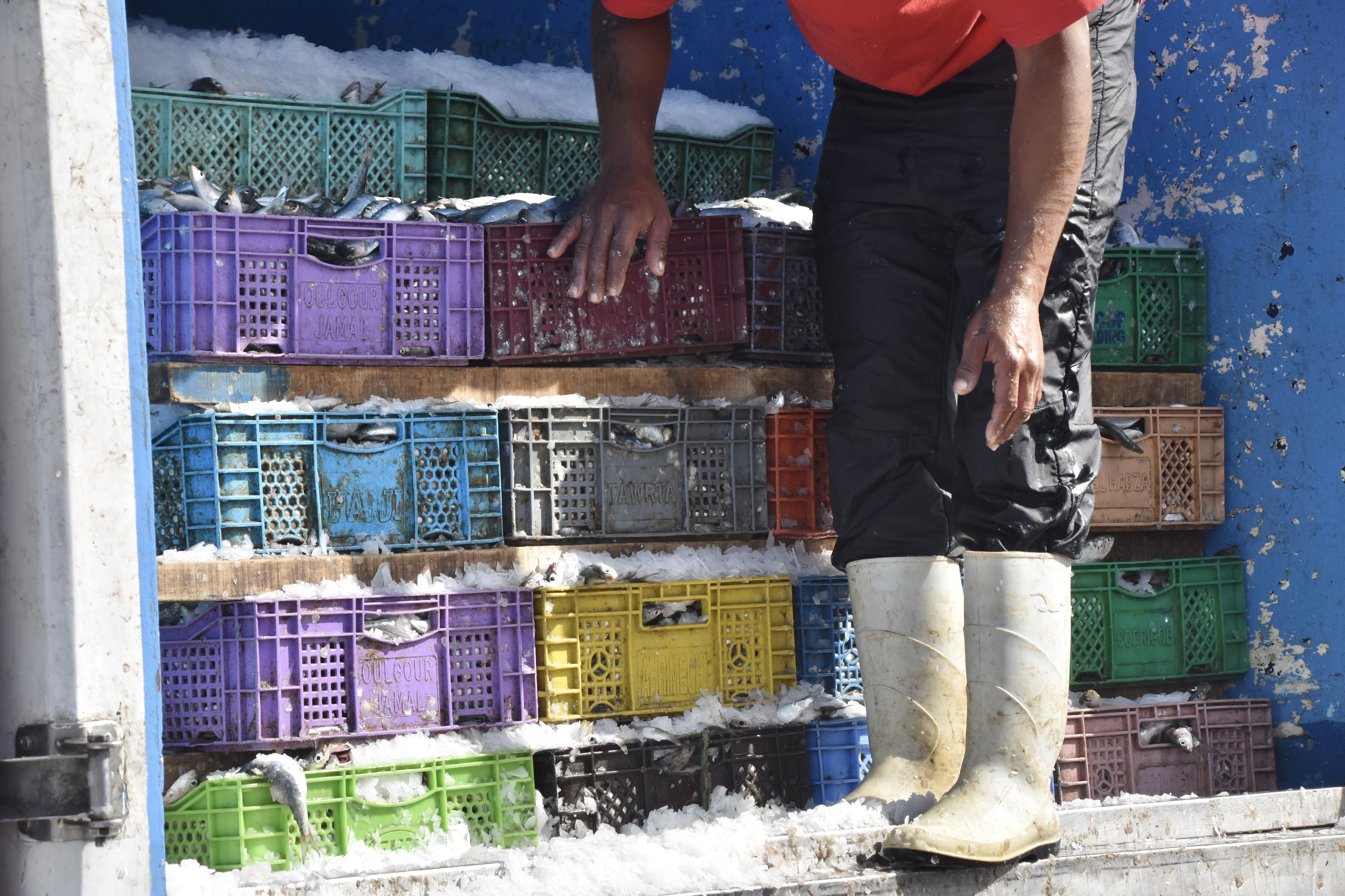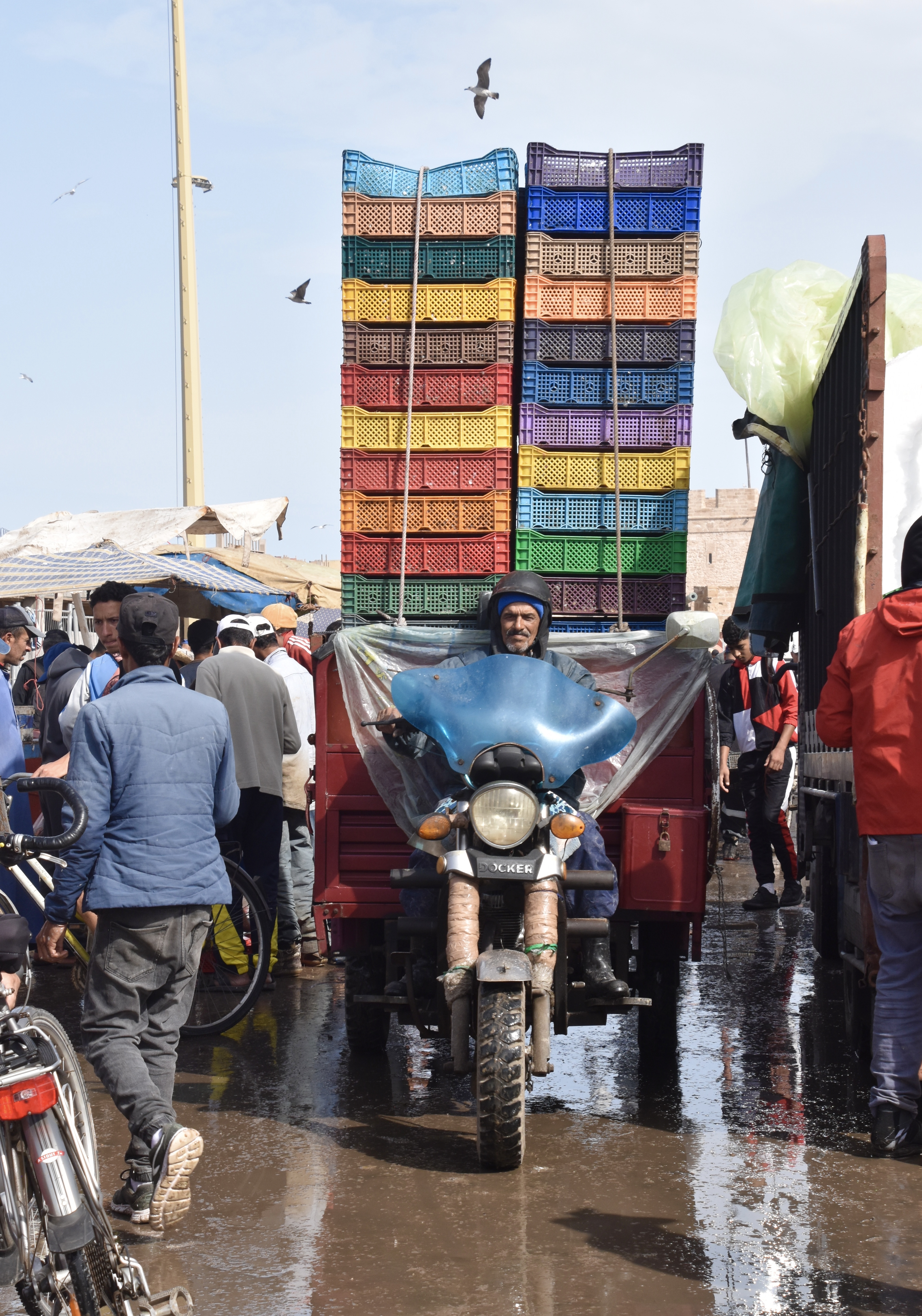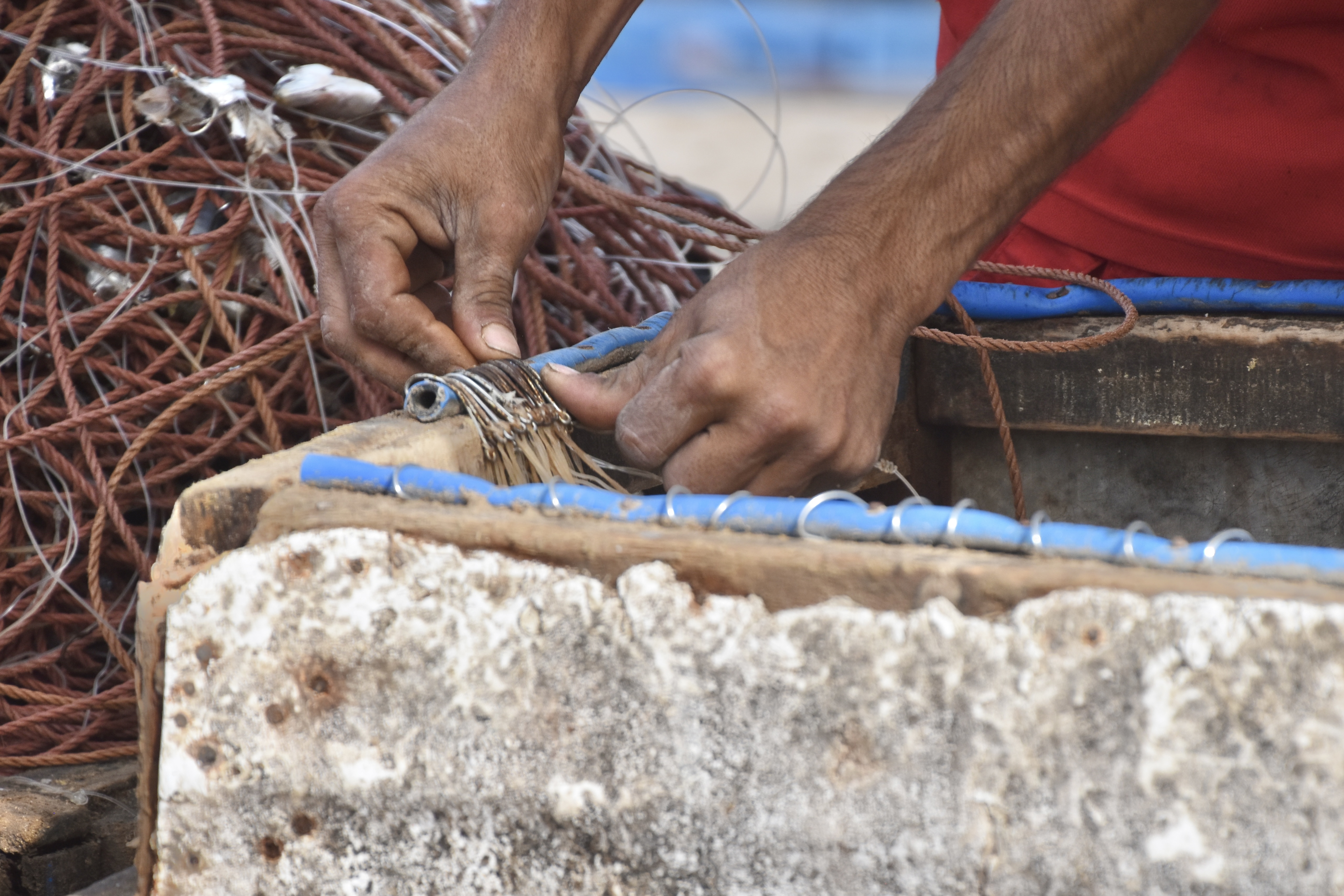 Promenade matinale dans le port et ses travaux divers : vider les poissons pour le plus grand bonheur des goélands et des chats, vider les bateaux pour le malheur de peintres amateurs obligés de fuir. Mais aussi préparer les filets pour la pêche suivante.