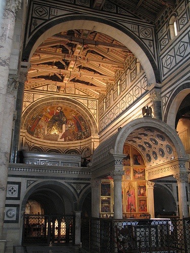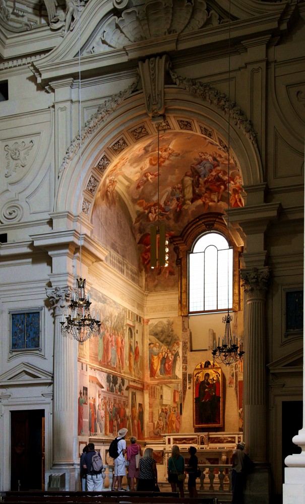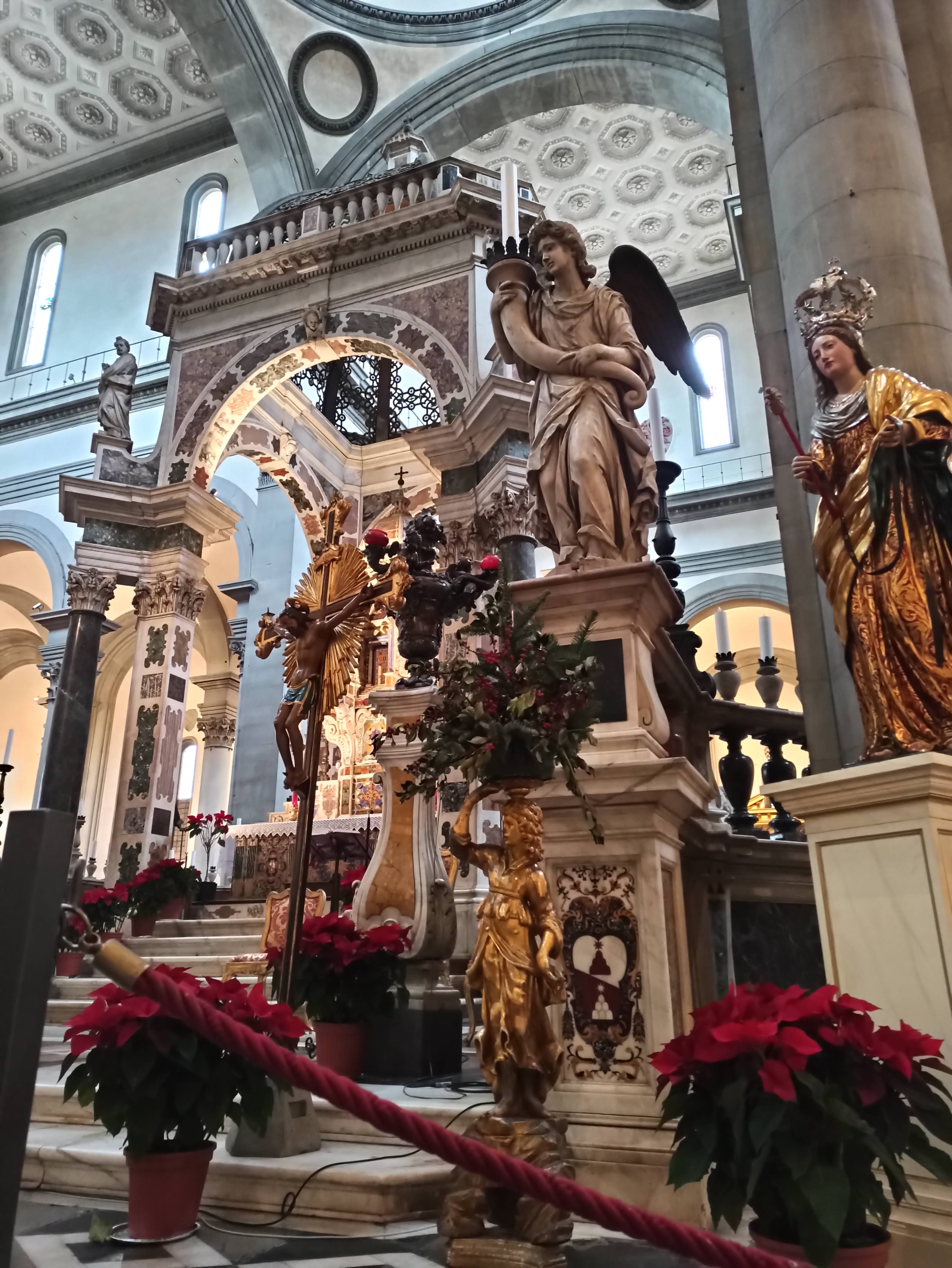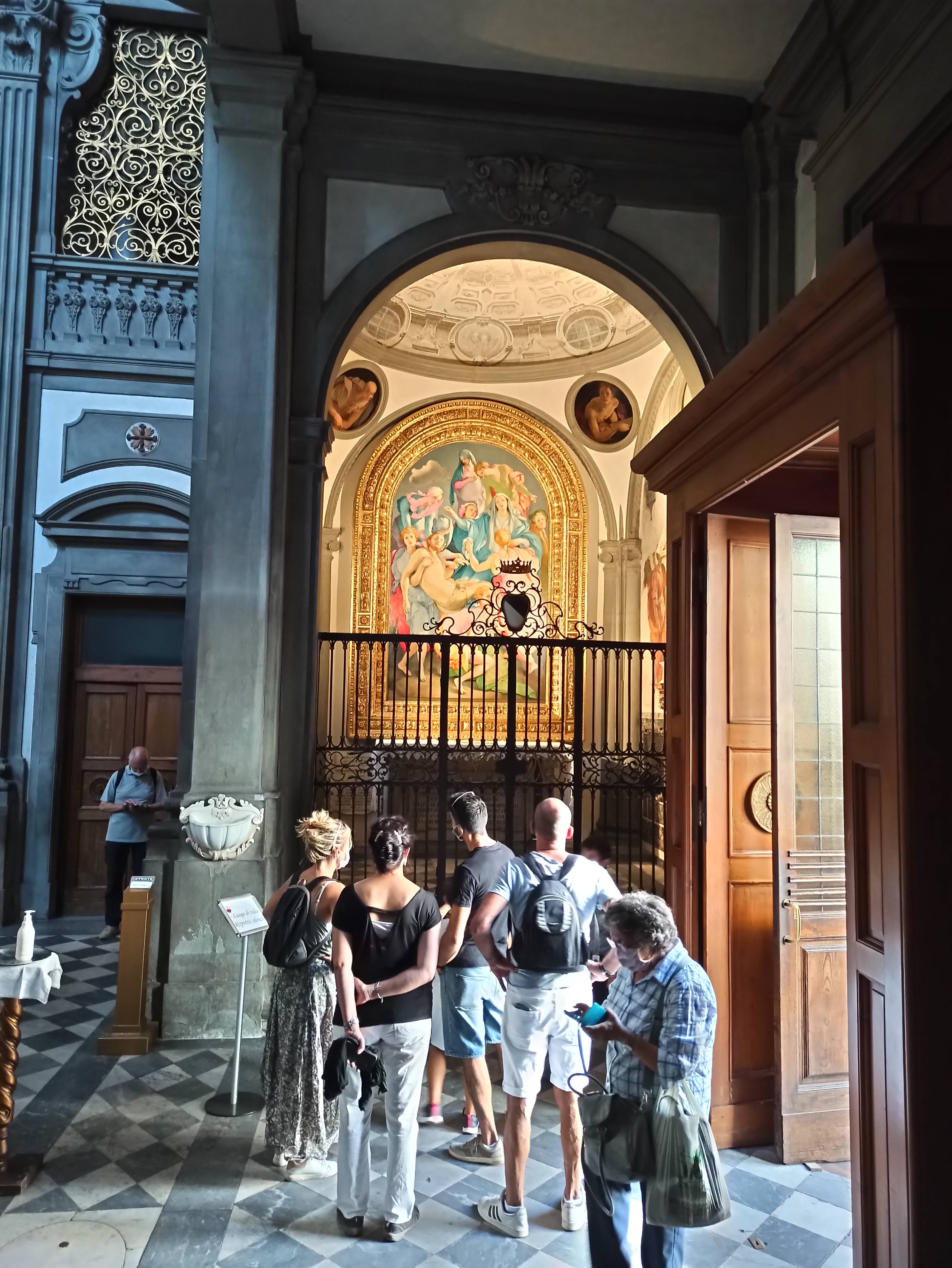 Долгое время церковь принадлежала бенедиктинским монахиням, периодически усмирявшим свою плоть затворничеством. В такие моменты удаления от мира, они могли присутствовать на мессе в зарешеченных лоджиях, высоко над центральным небом. Справа от входа в церковь, находится Капелла Каппони. Она хранит, над маленьким алтарем, редкой красоты сокровище — трехметровую икону, выполненную в 1528 году художником-бунтарем Якопо Понтормо.