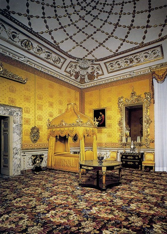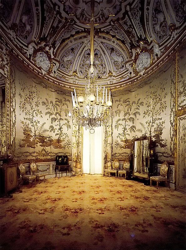 Если семья герцога Медичи жила в левом крыле Дворца Питти, то пришедшие им на смену Лотаринги-Габсбурги, поселились в правом крыле. Для создания хоть какого-то уюта, в проходных комнатах дворца, новые жильцы затянули стены шелком. Это стало возможным благодоря многовековому производству шелка в Тоскане. И речь не идет о ткани, к которой мы сегодня привыкли. Сложнейшая техника парчи предусматривает две основы: фон и рисунок. На сочном фоне золотые цветы и птицы переливались в отблесках свечей огромных люстр. В тон стен каждой залы была обита мебель и заказывались соответствующие платья.