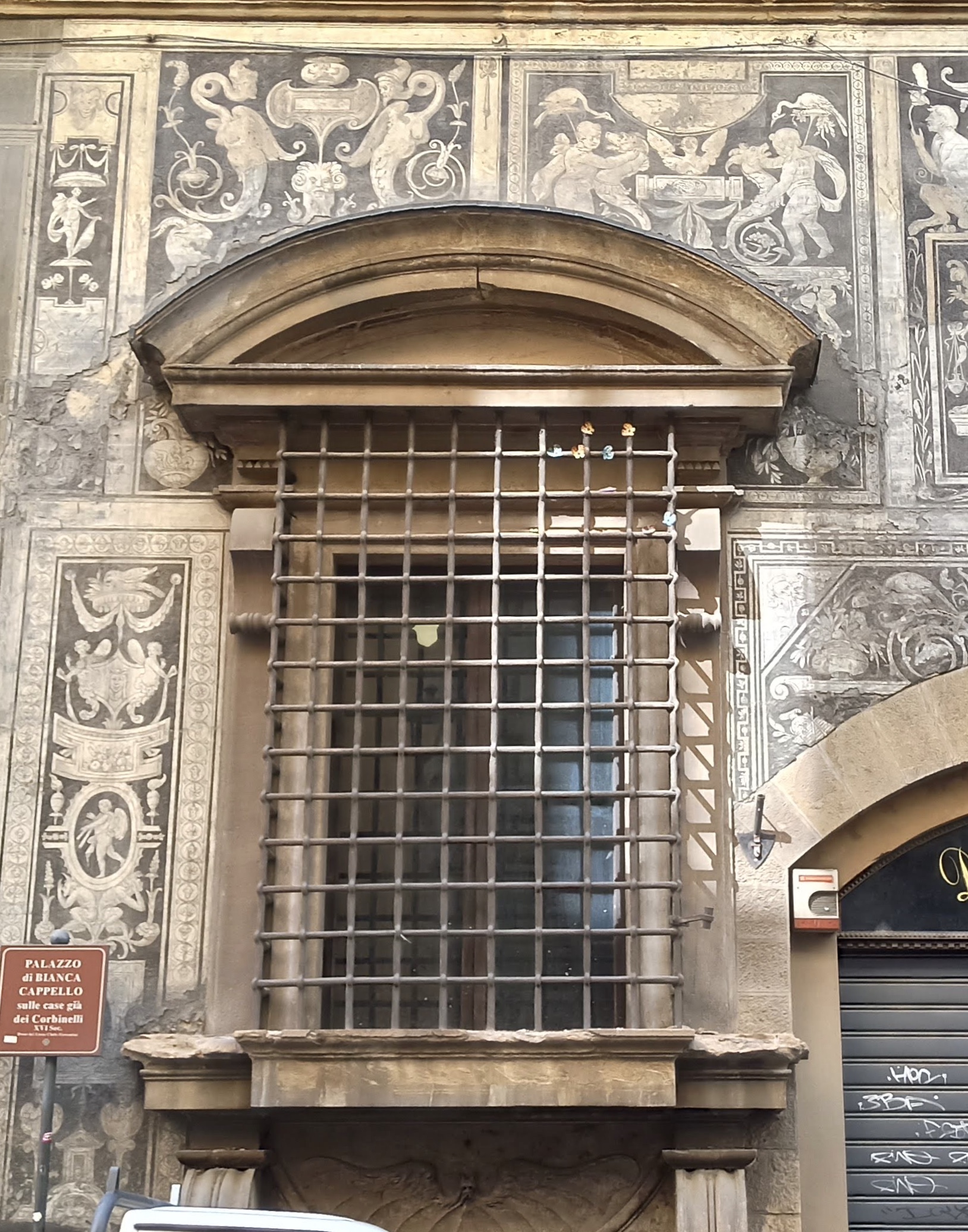 От моста Святой Троицы уходит прямой стрелой в Заречье via Maggio. Самым диковинным домом на этой улице является Палаццо Бьянки Капелло, легко узнаваемый по монохромным графитам. Художник Почетти не просто расписал фасад гротескными, но вложил в каждый фрагмент тайный эзотерический смысл.