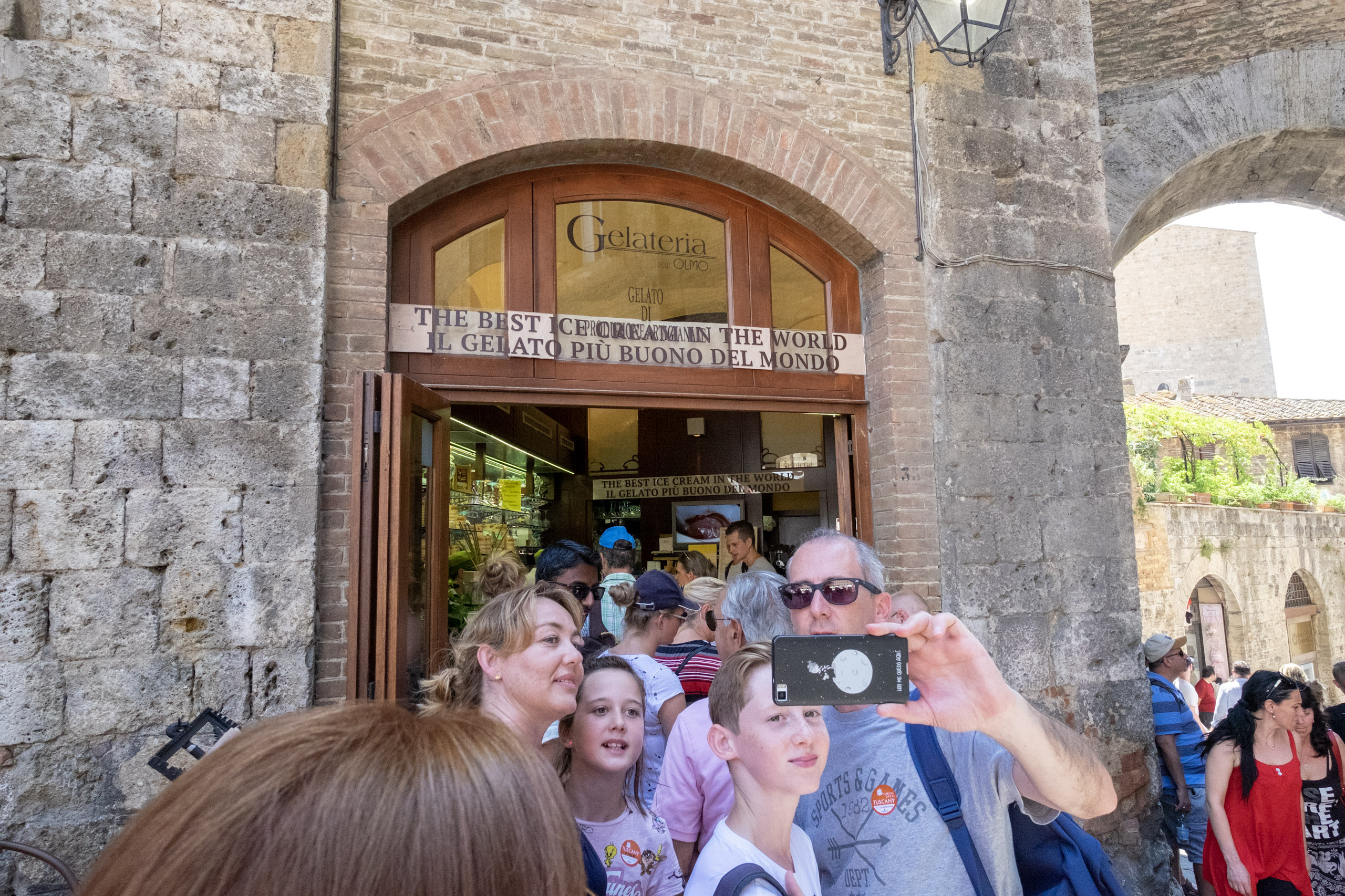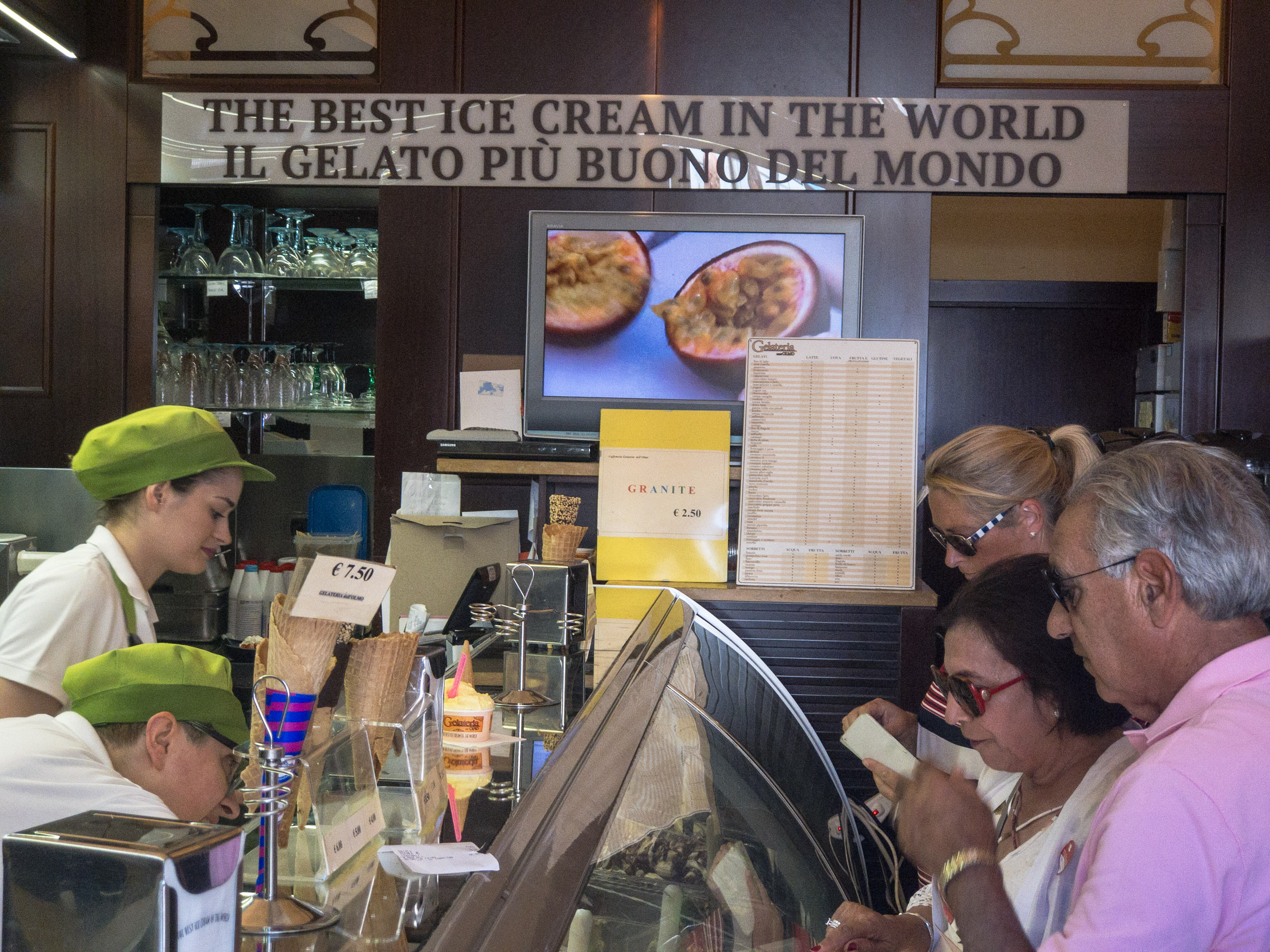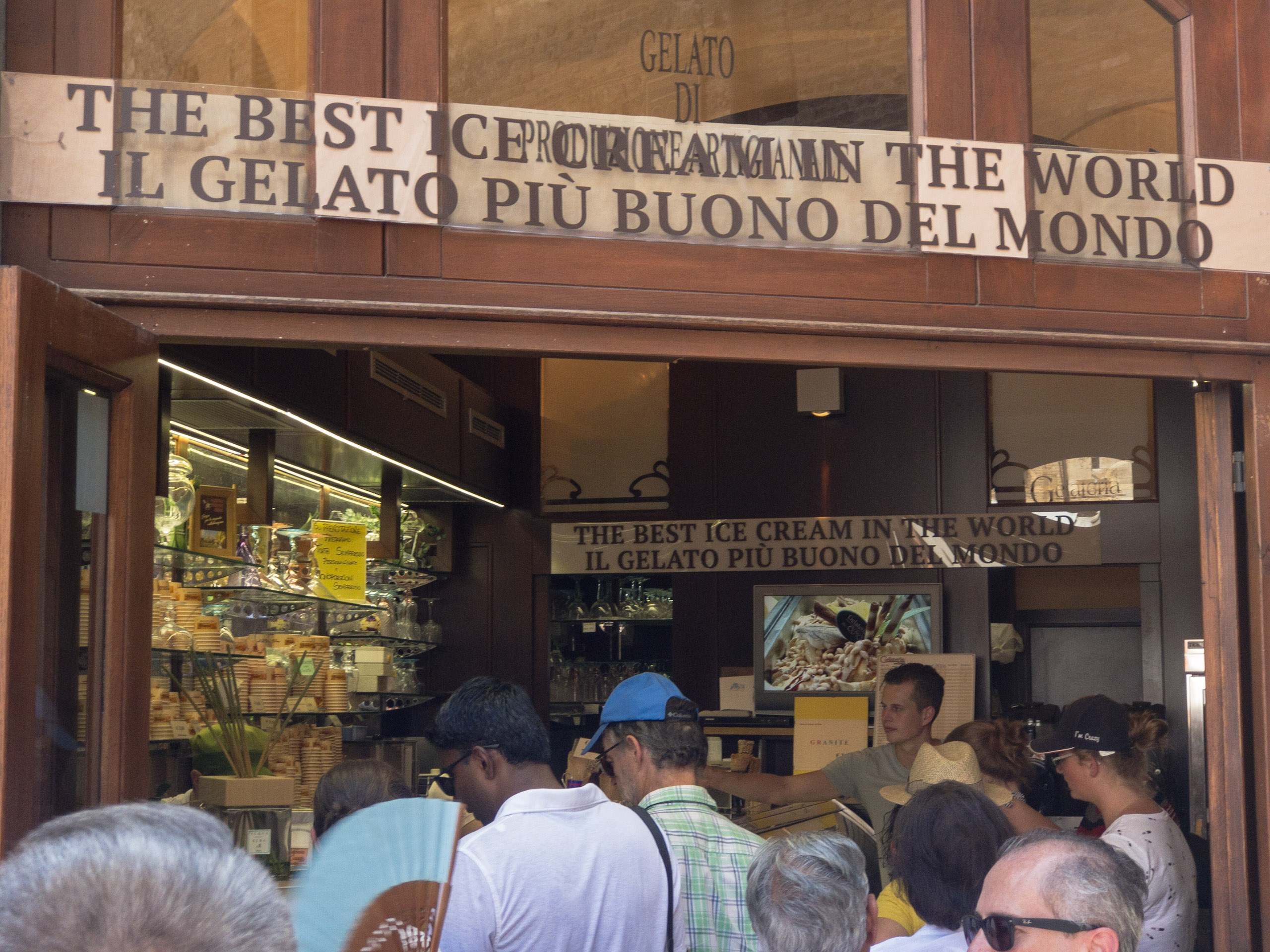 Our guide treated all in our party to gelato from a repeat “World Champion” of Gelato. Their own sign succinctly notes the achievement, and the photo was taken specifically for a friend who is a gelato devotee.