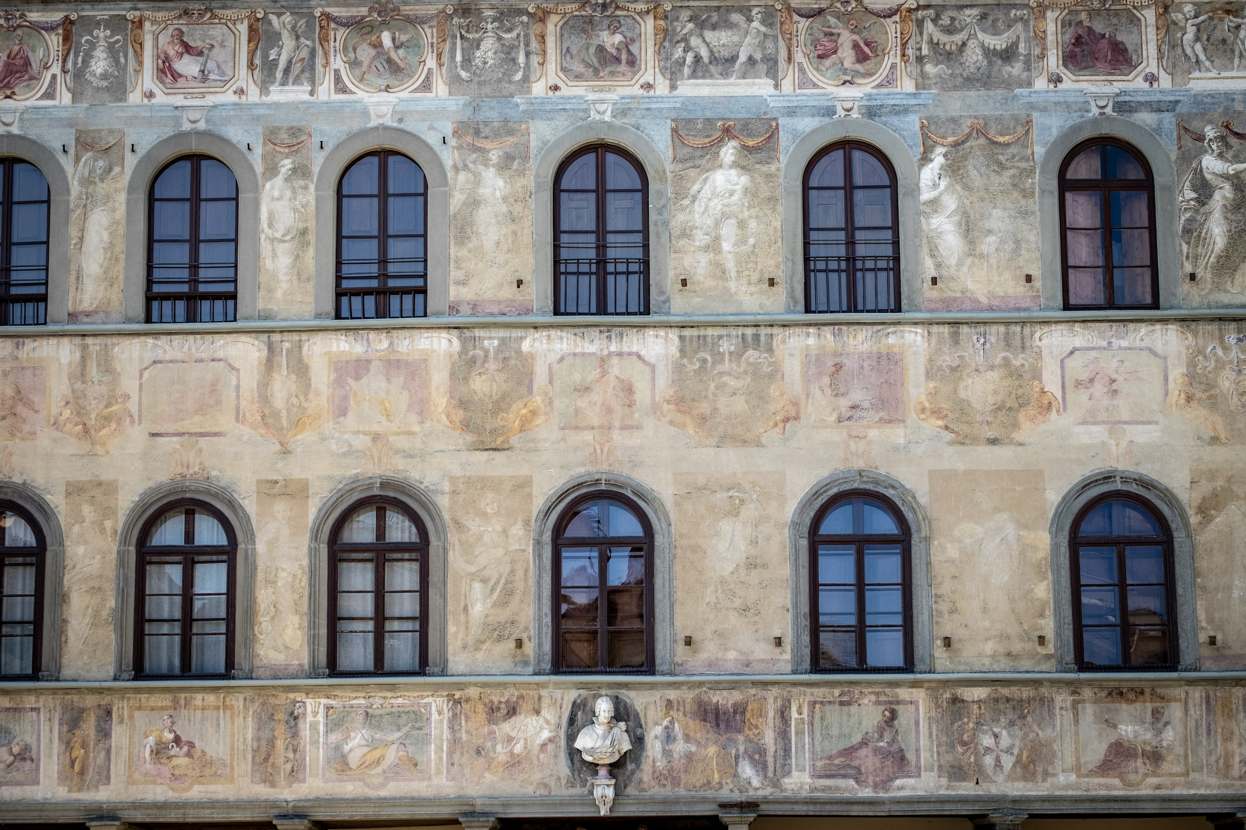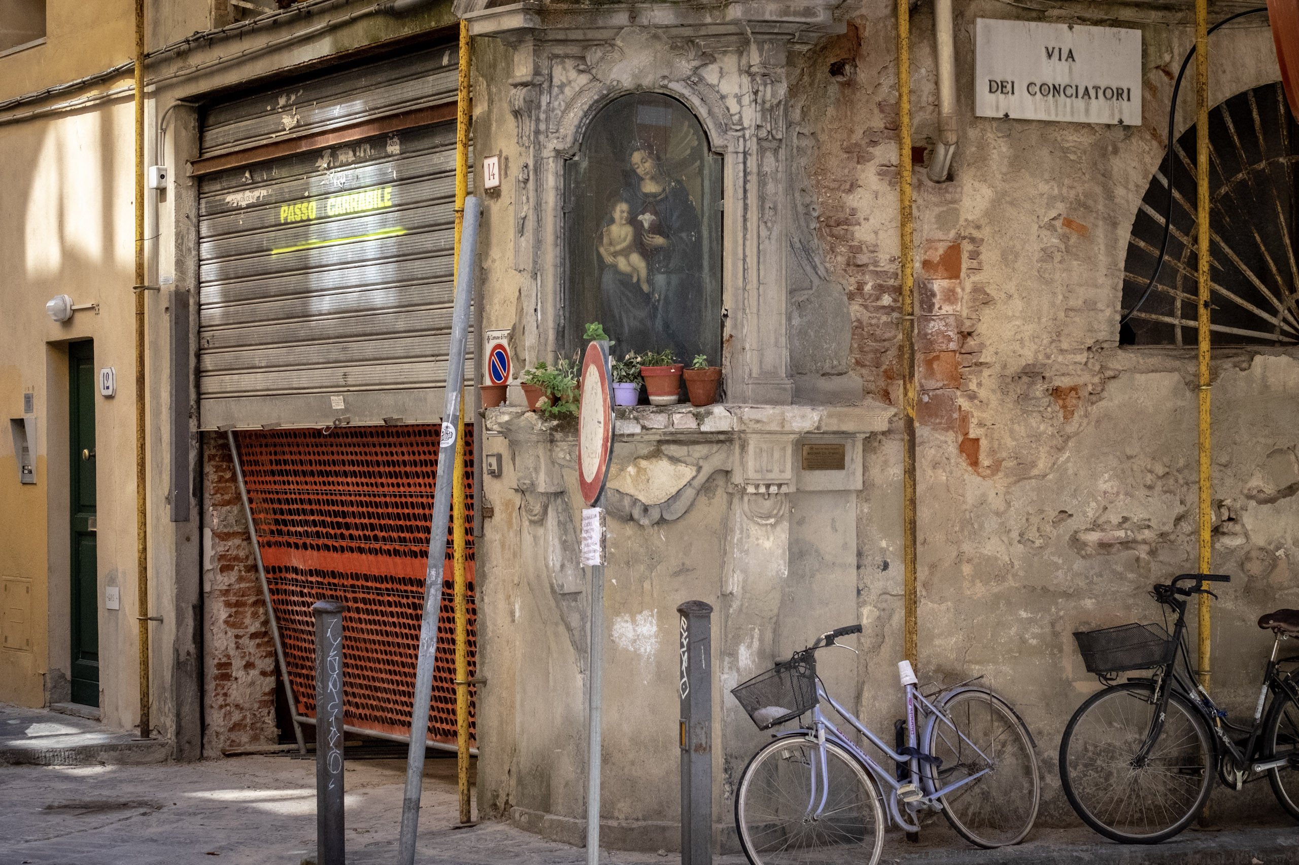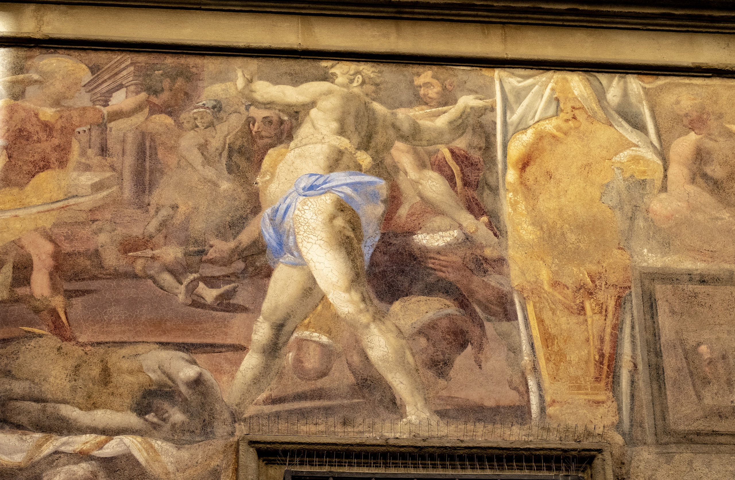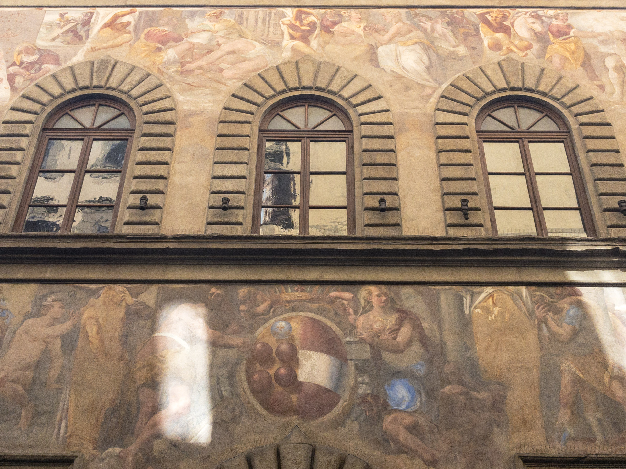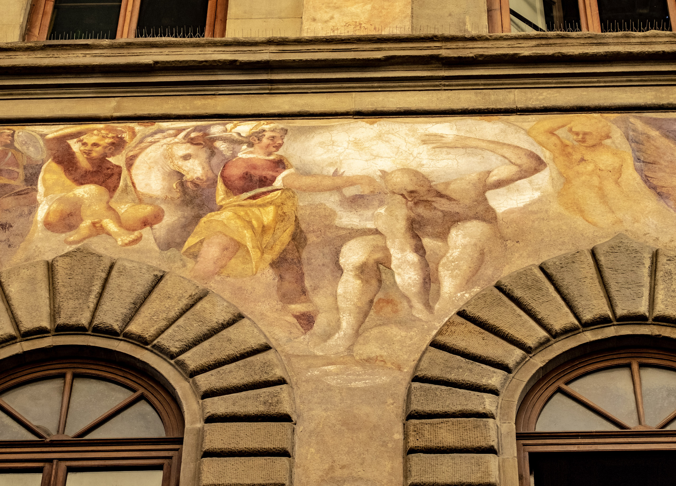 The fresco shown below was discovered by accident, thanks to a pause followed by an upward gaze. It is perilous to take focus from the street in front of you in Italian cities while walking.