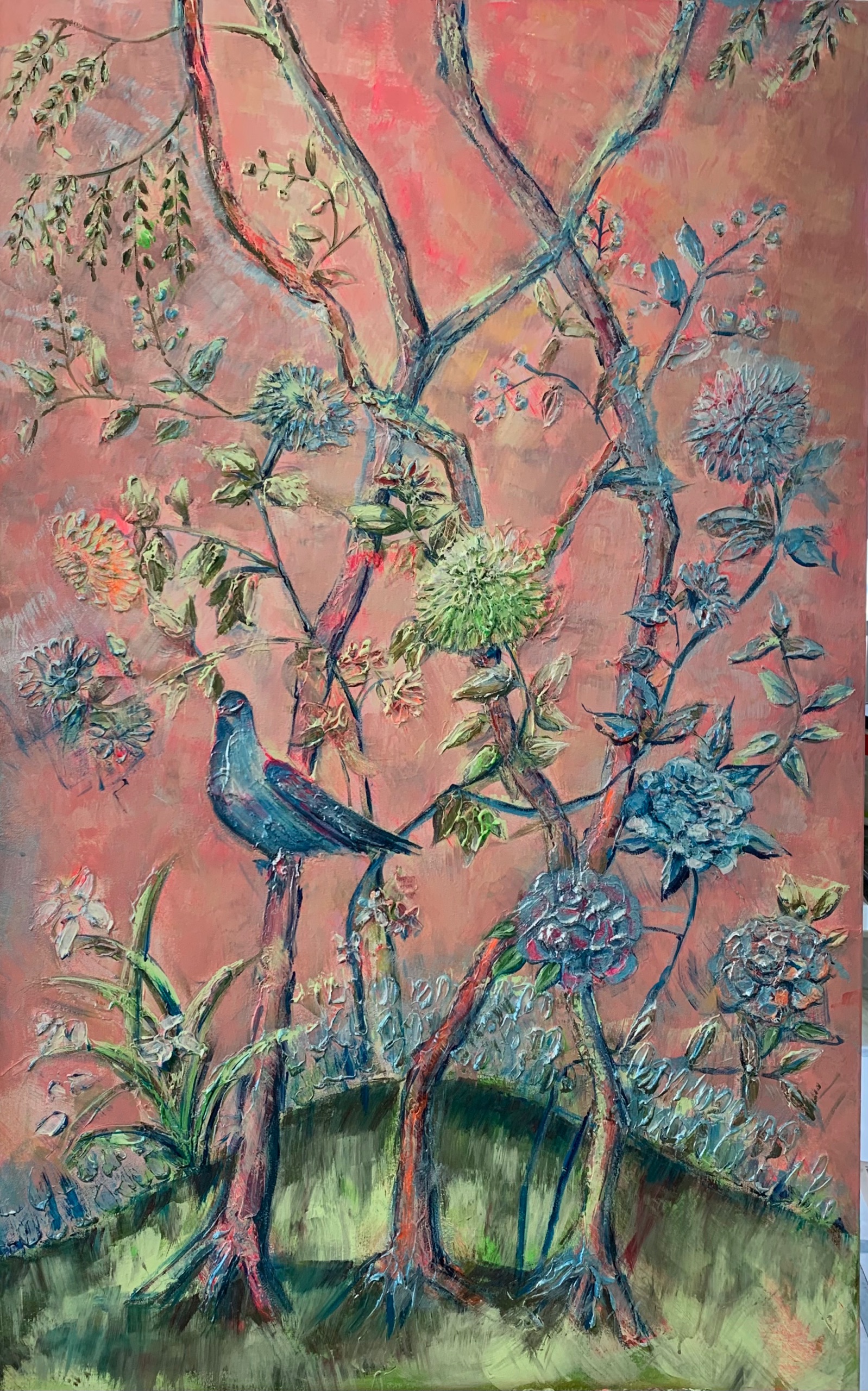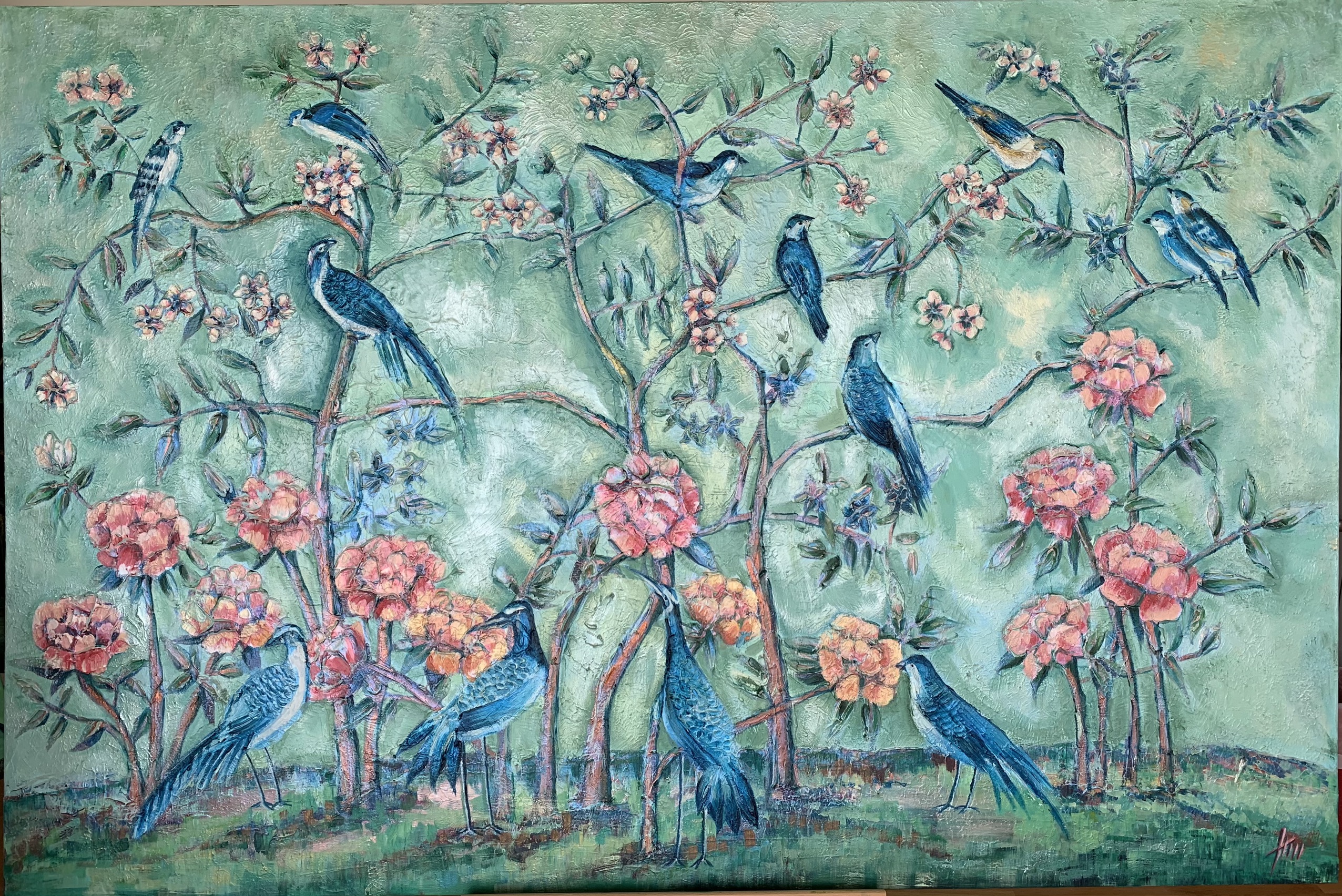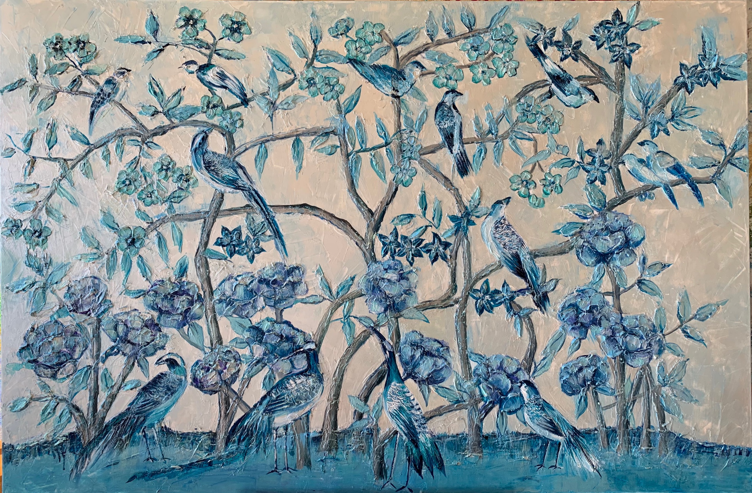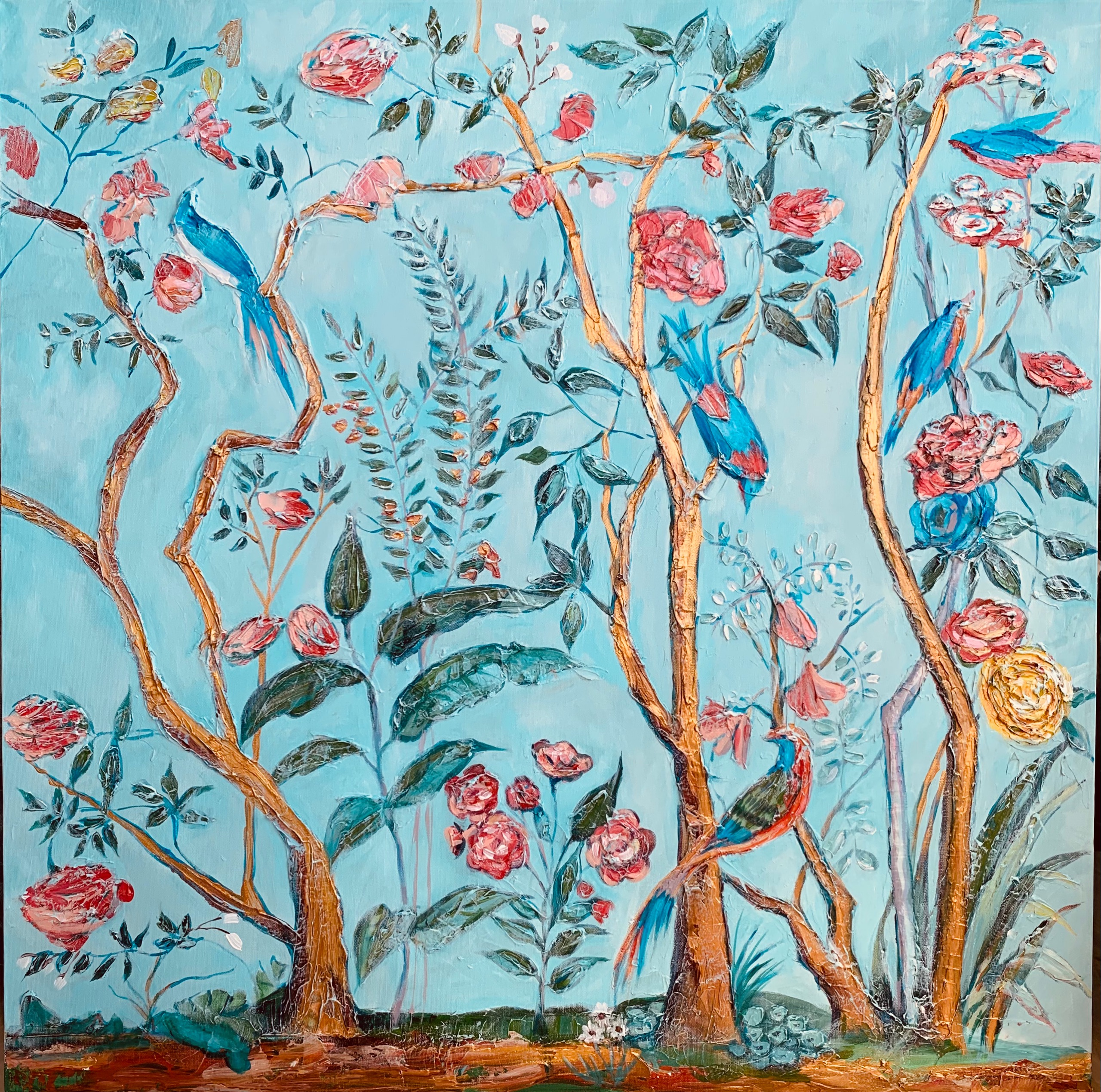 This series of paintings is inspired by the ‘Chinois’ style of the 18th century wallpaper imported from the East that adorned many European drawing rooms. The beguiling realism and symbolic language of the bird-and-flower imagery is recaptured in a unique style, blending bold textures and effervescent colors adaptable to our modern interior decor.