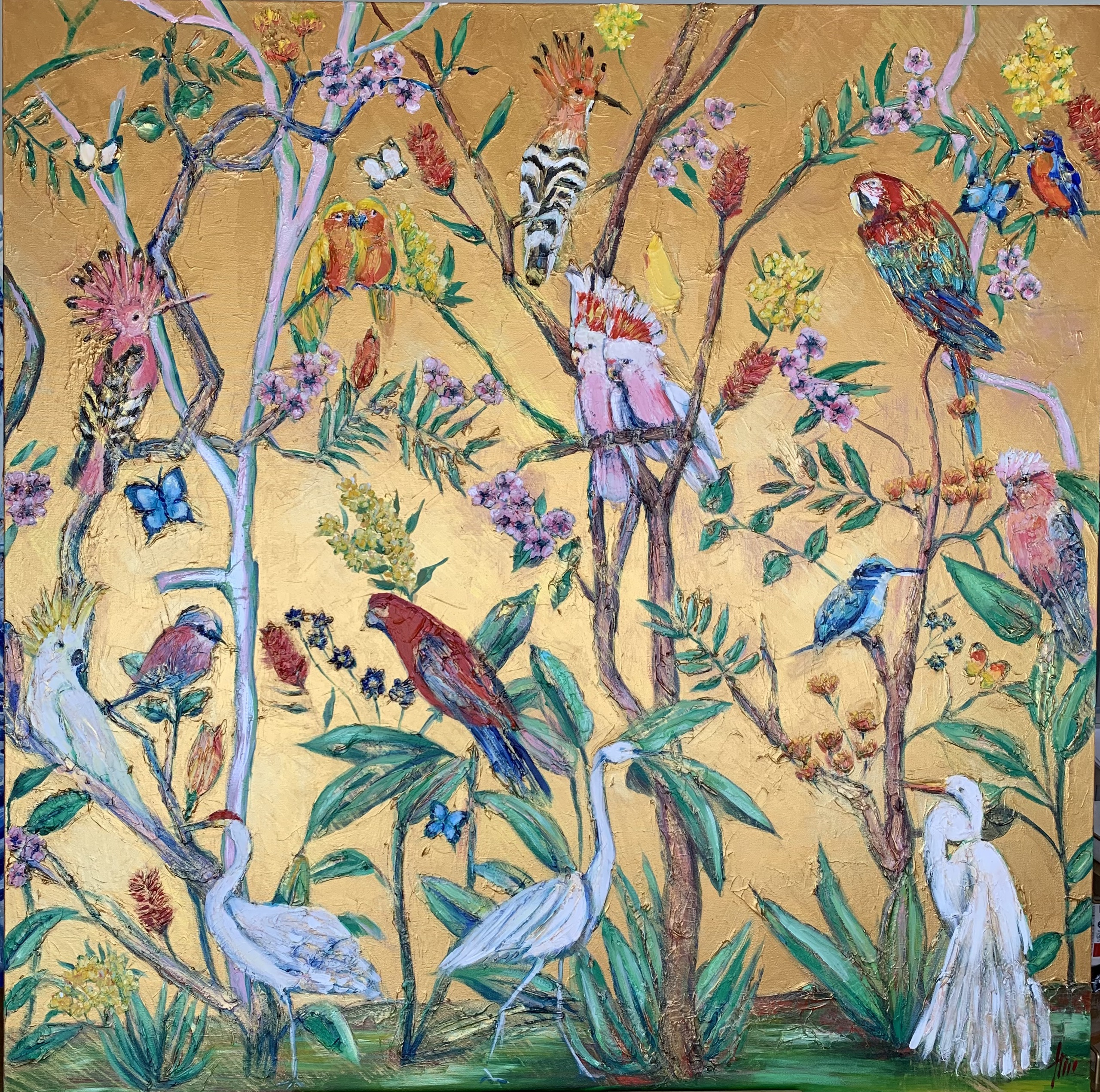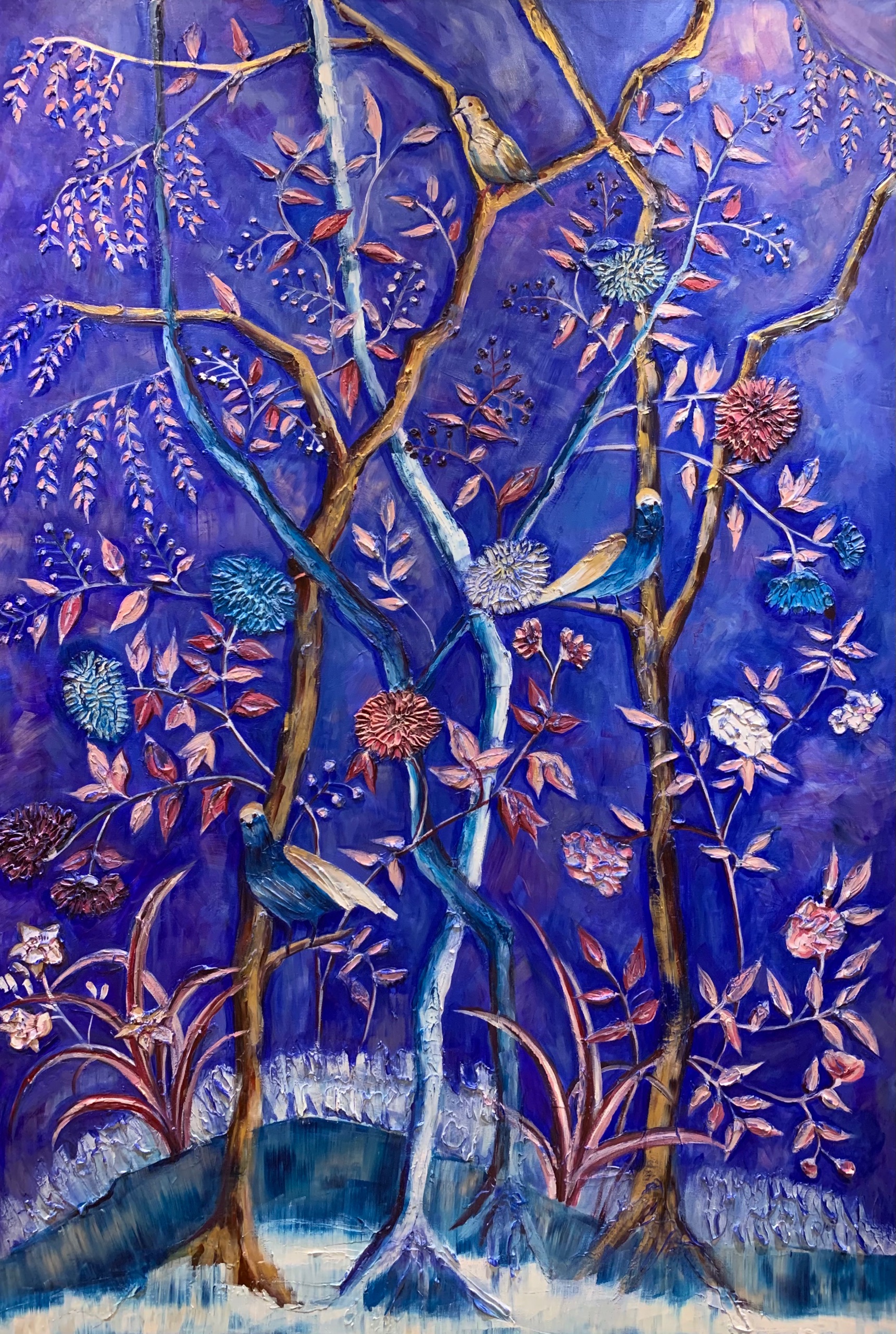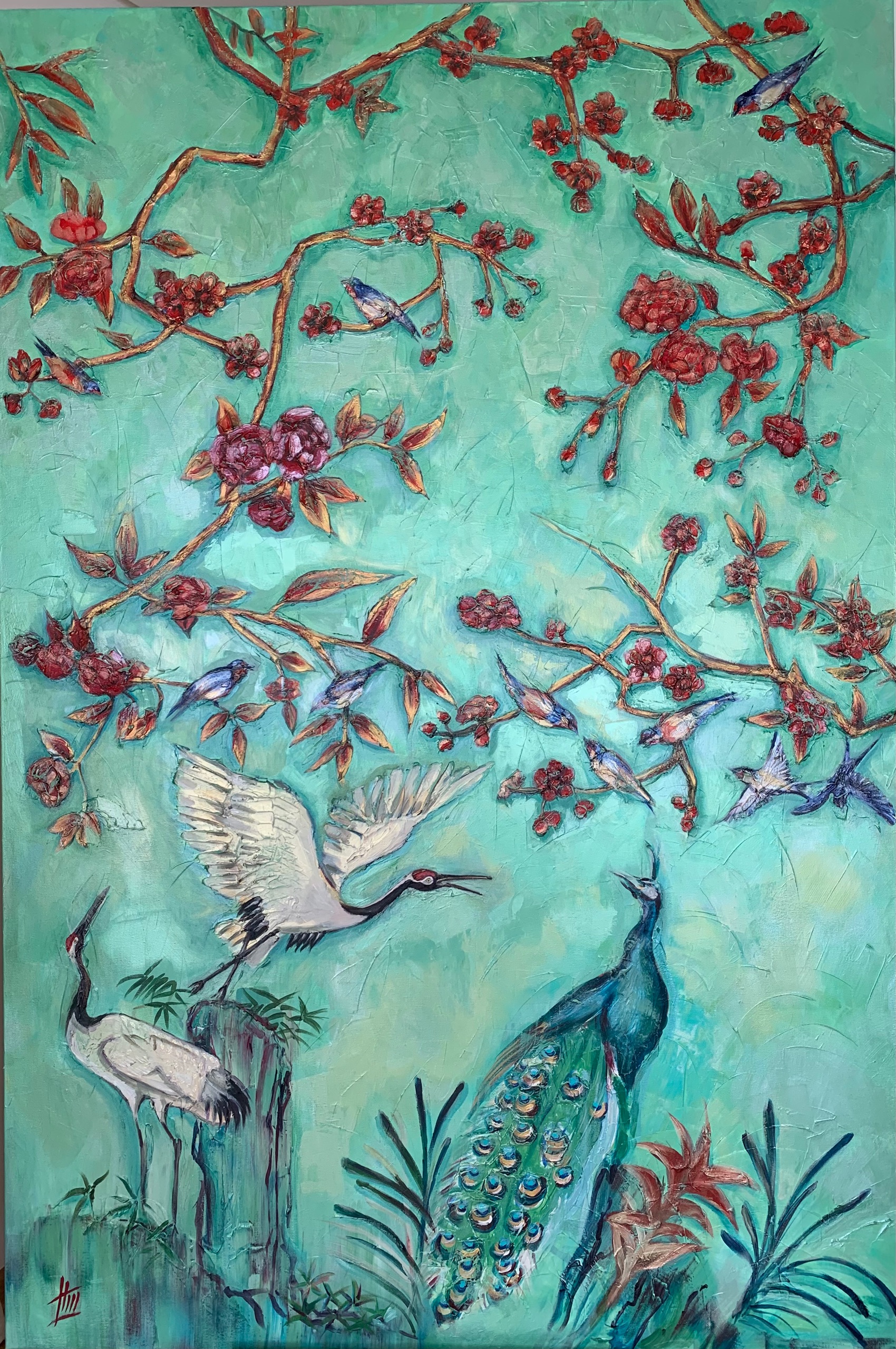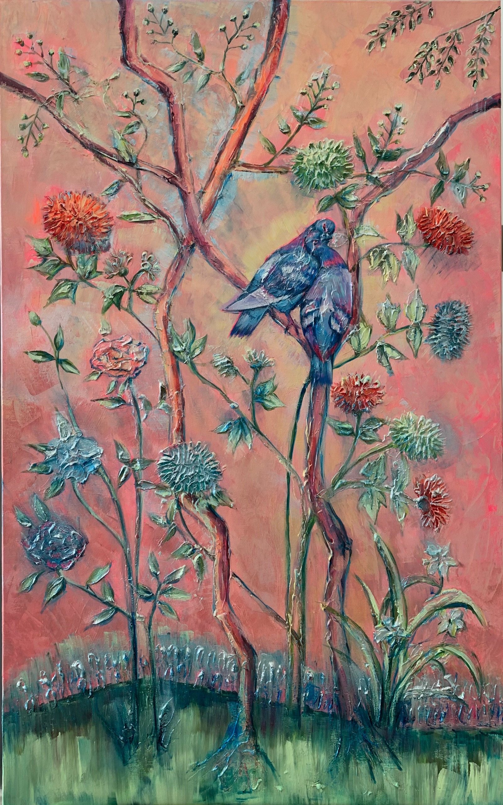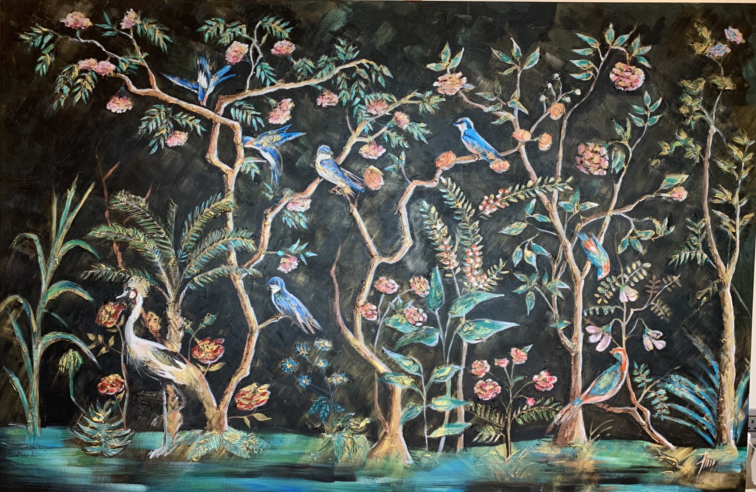 This series of paintings is inspired by the ‘Chinois’ style of the 18th century wallpaper imported from the East that adorned many European drawing rooms. The beguiling realism and symbolic language of the bird-and-flower imagery is recaptured in a unique style, blending bold textures and effervescent colors adaptable to our modern interior decor.