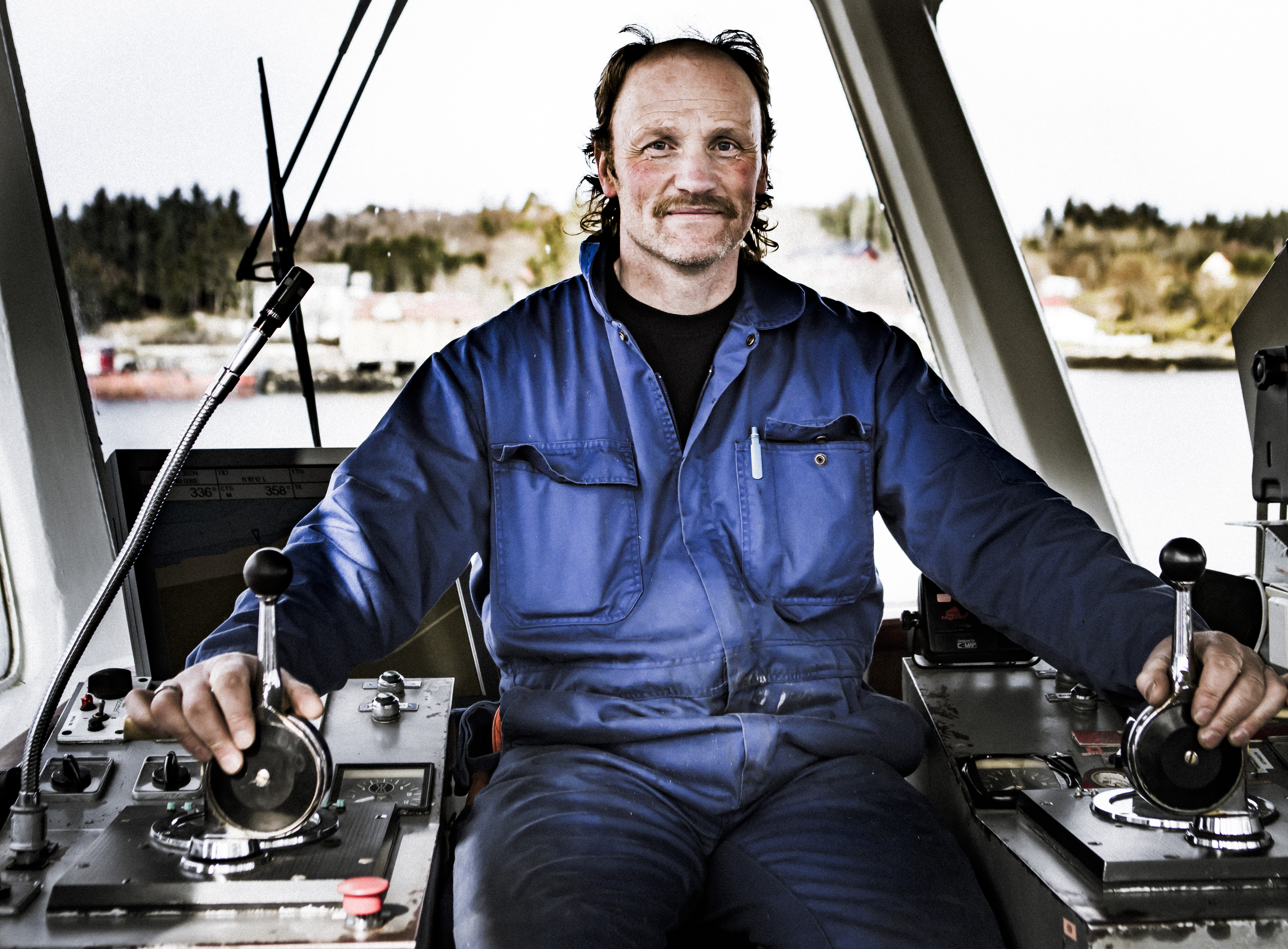 Ole Ivar smiler bredt, og det hersker liten tvil om at dette er et sted han trives. Han lar arbeidsnevene hvile på hver sin styrespak, som om han allerede i tankene er ute på neste taubåtoppdrag.