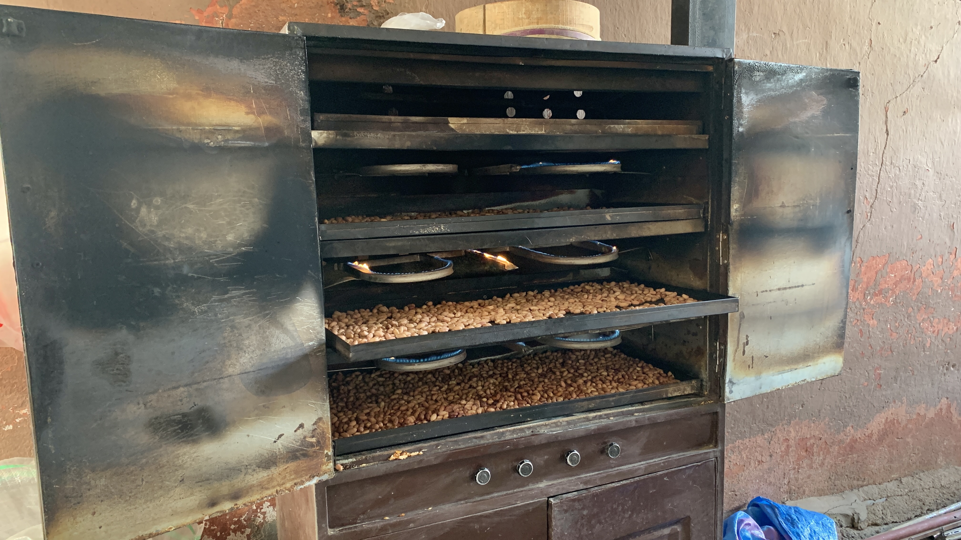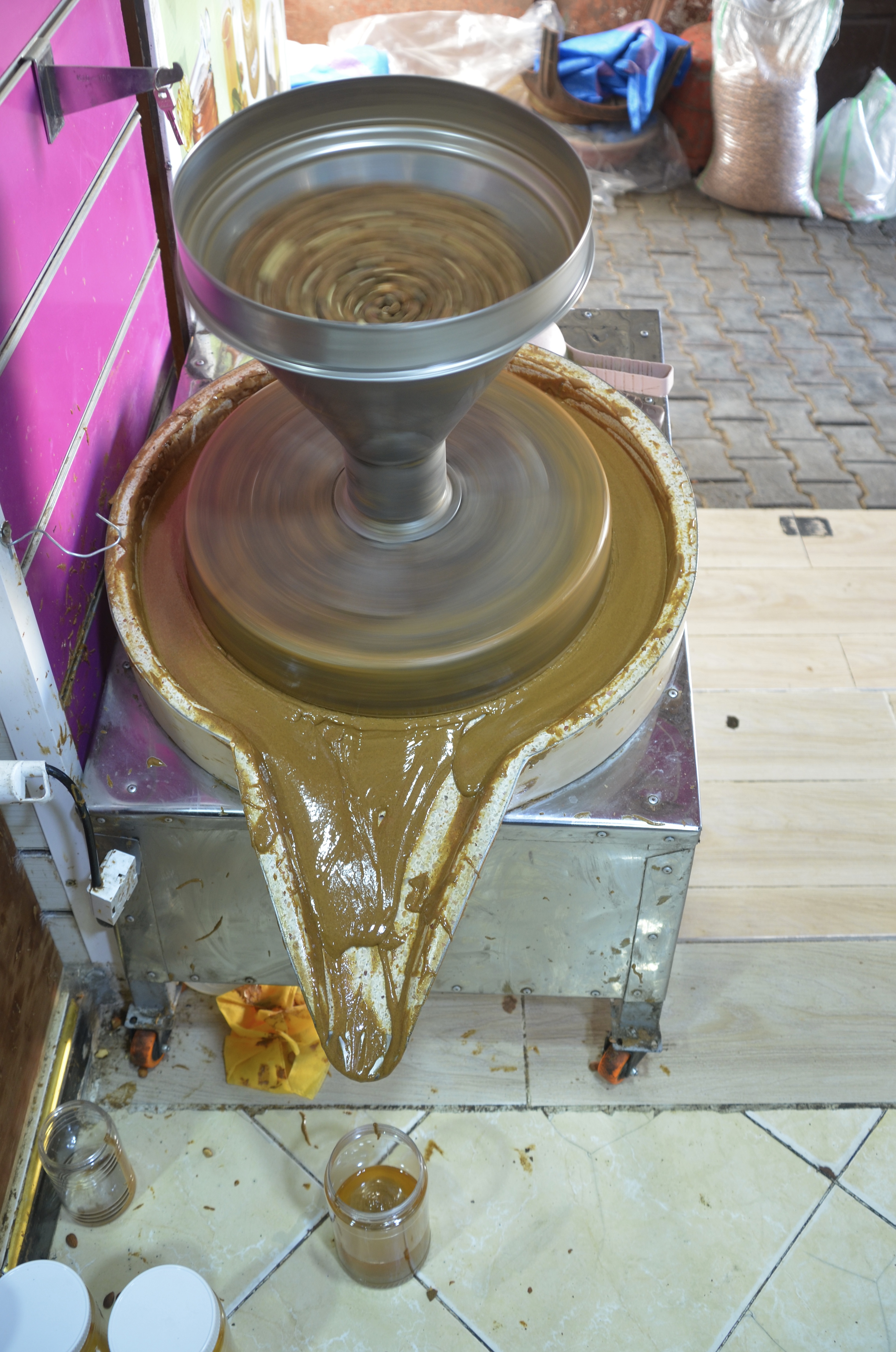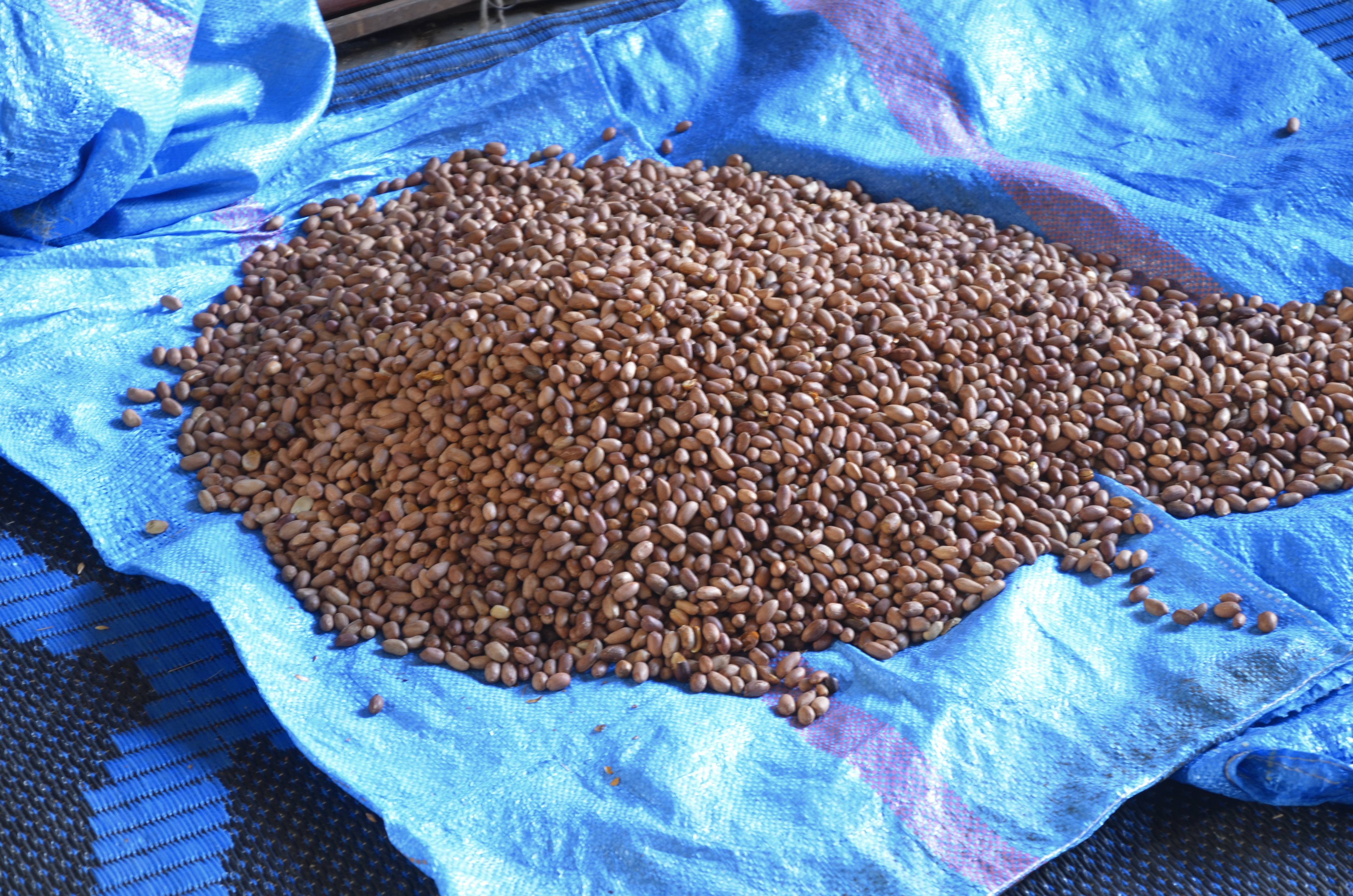 La transformation de la noix d’argan, grillage et pressage, pour récupérer l’huile, puis avec le reste du pressage fabriquer de l’amlou (sorte de pâte à tartiner).