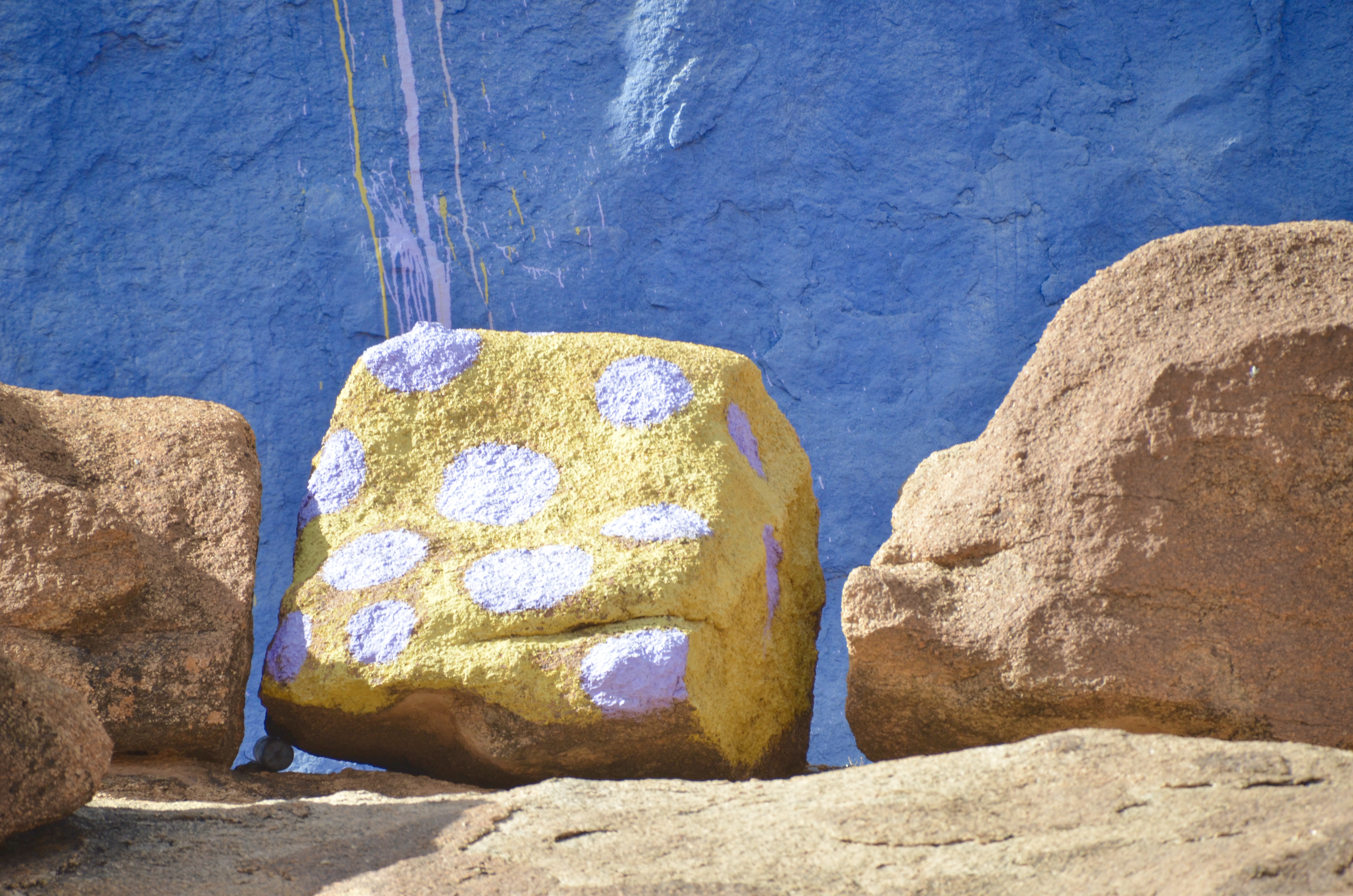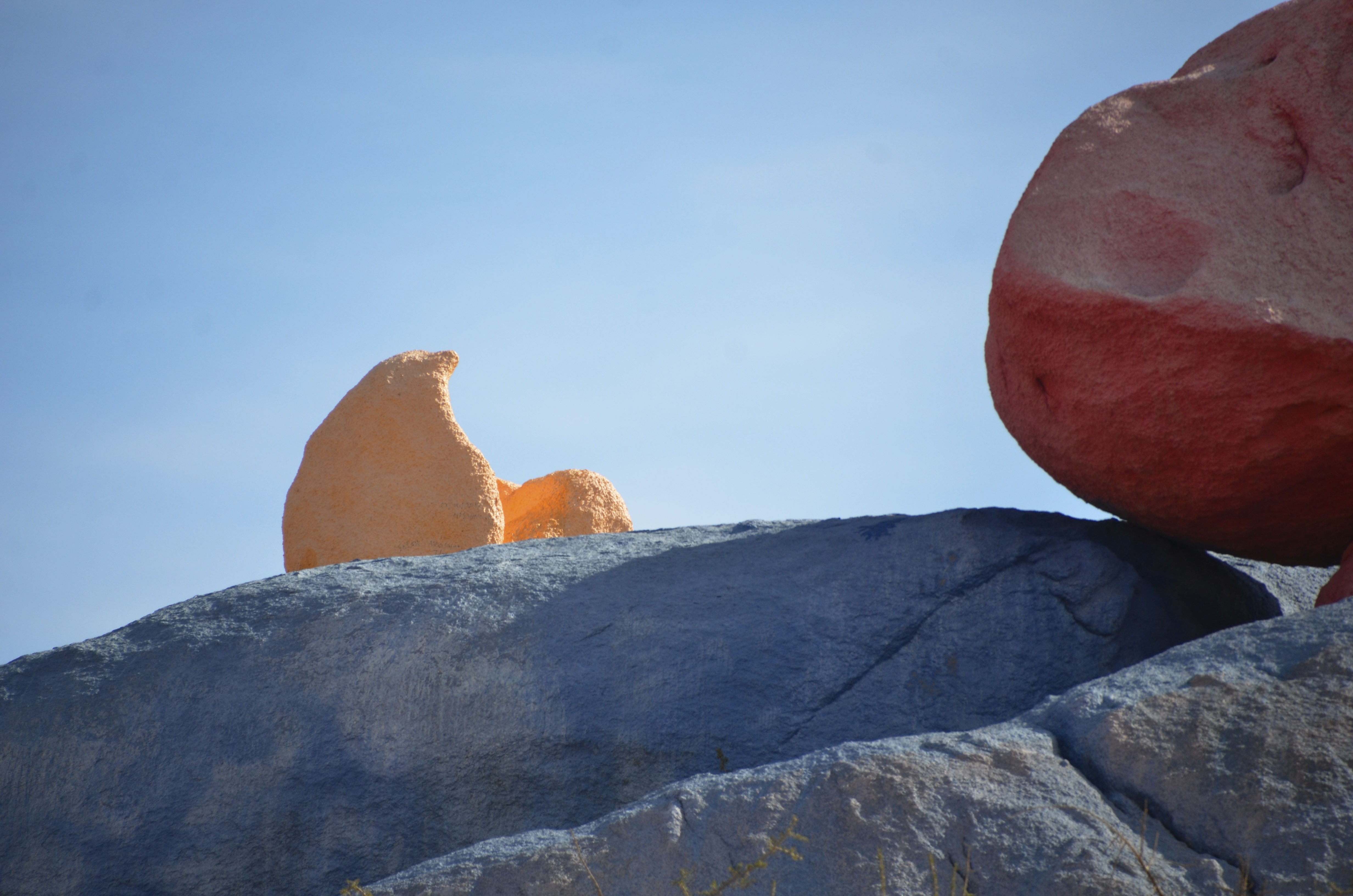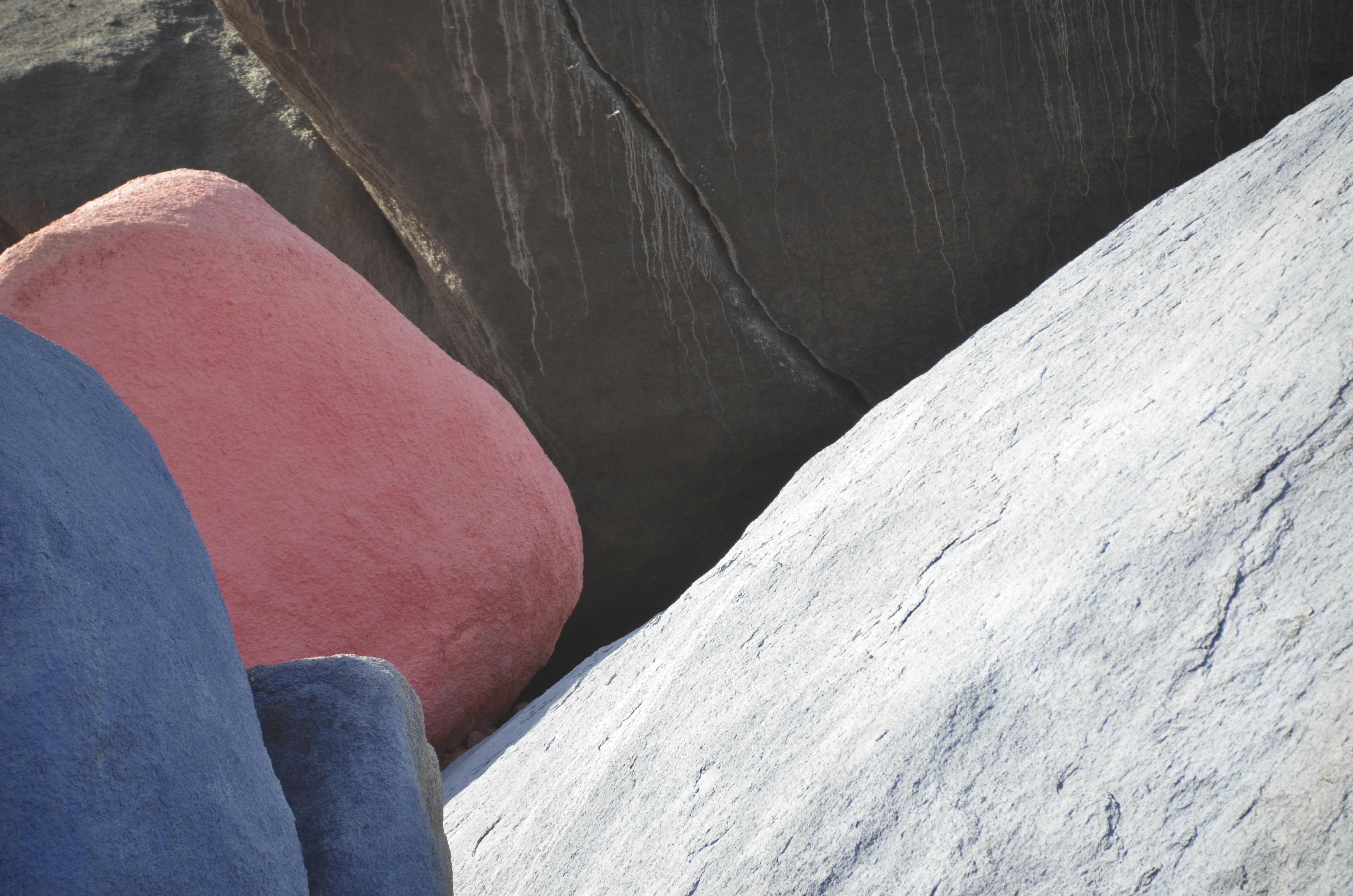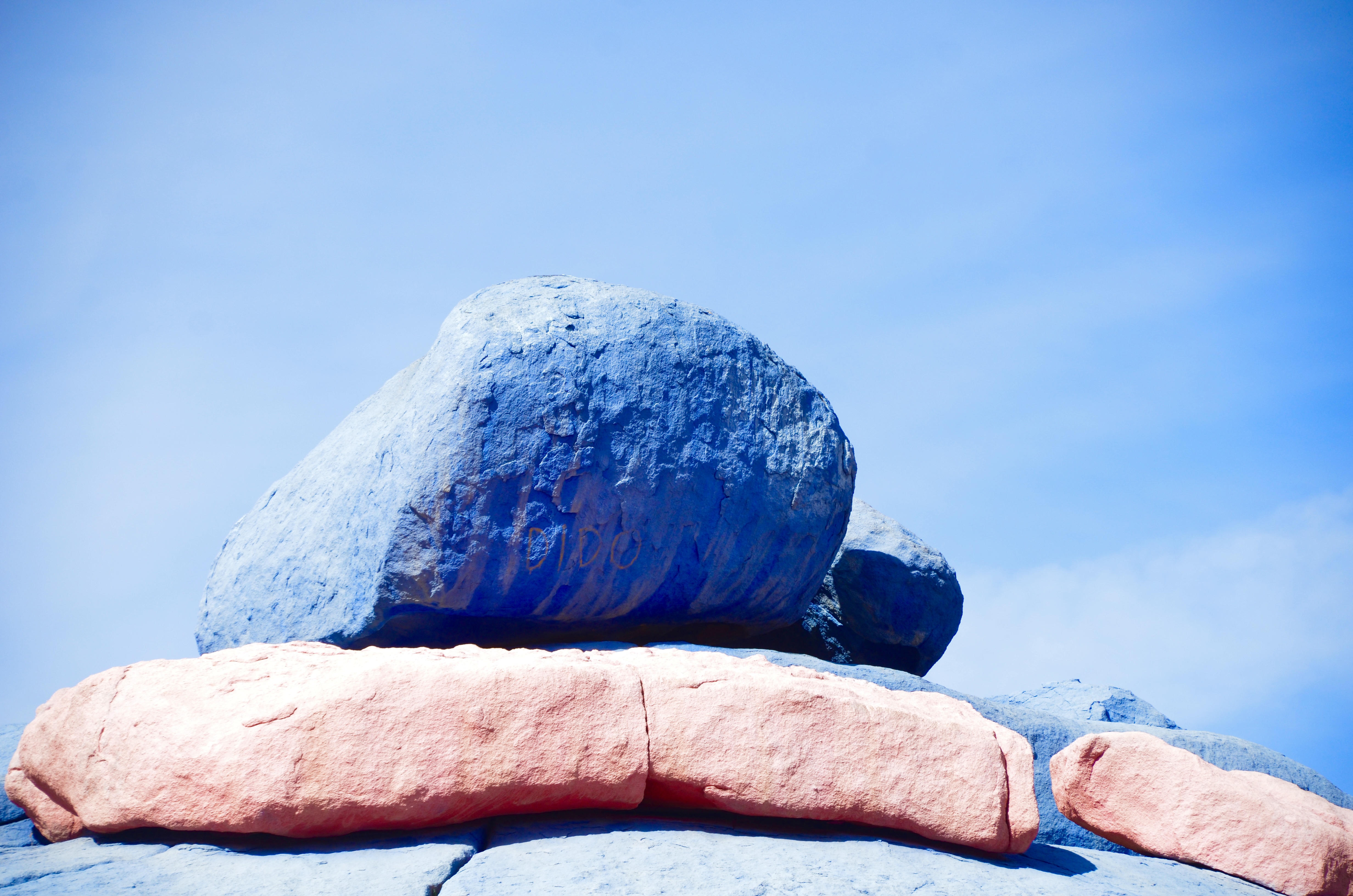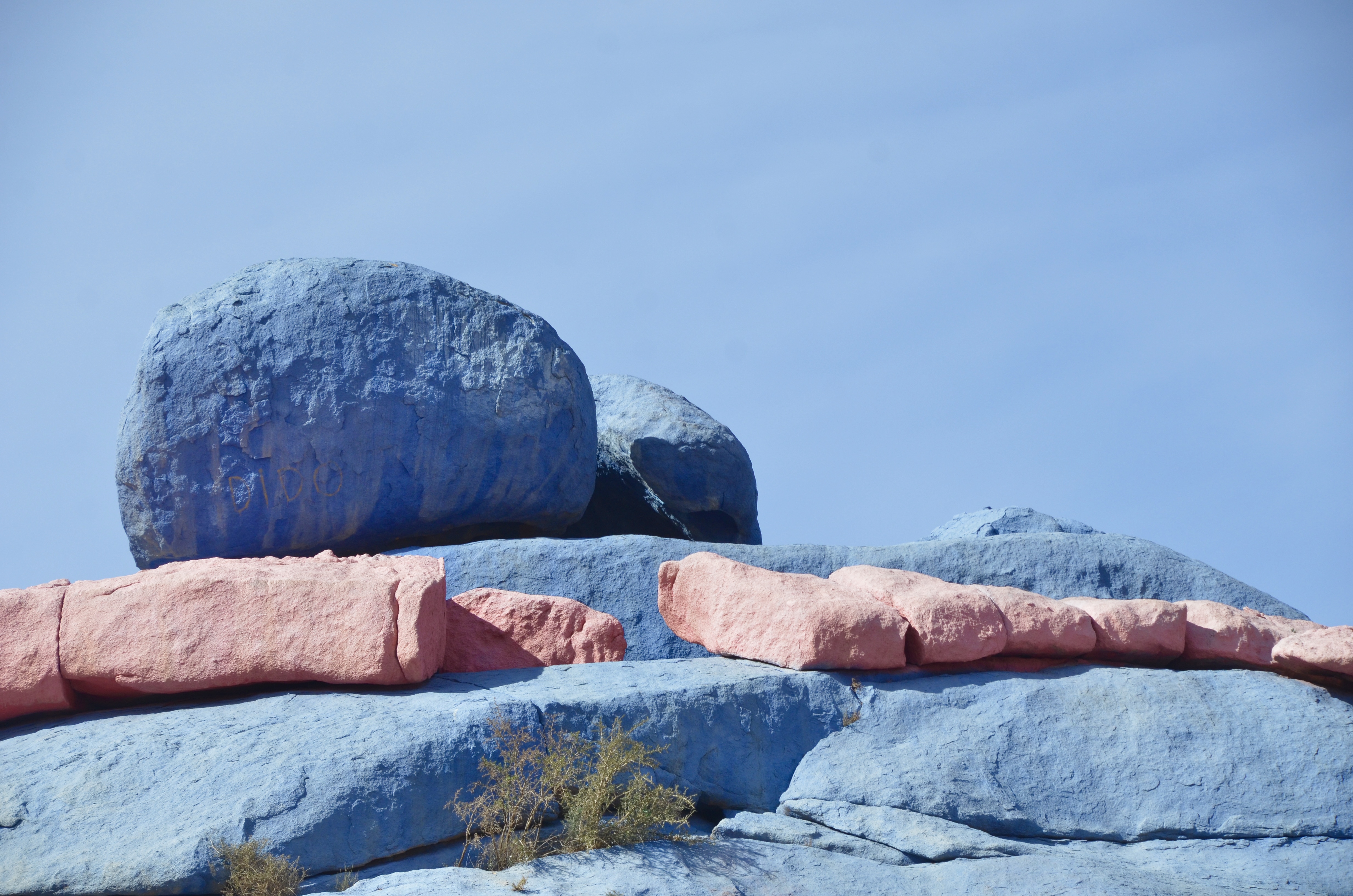Les rochers bleus : en 1984, le plasticien belge Jean Vérame peint en bleu quelques-uns de ces blocs de granit. L’on aime ou pas. De loin cela ne me plaît guère, surtout qu’il y en a beaucoup plus que lors de mon premier passage en 2010, quand même 30 ans après. Mais en s’approchant c’est très graphique et l’adjonction d’autres couleurs assez pastel est du plus bel effet. Le site est bien entretenu, quasi pas de déchets.