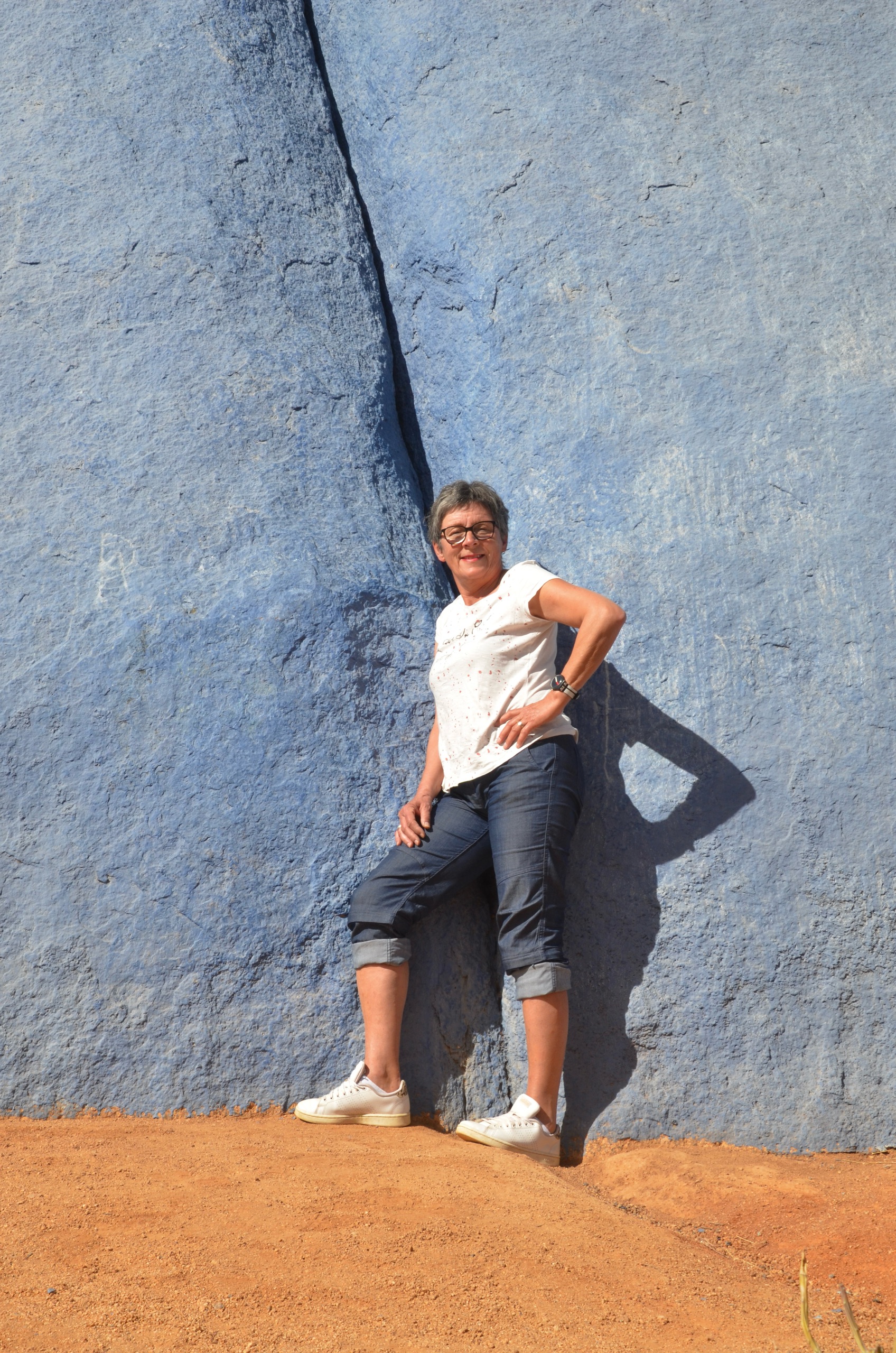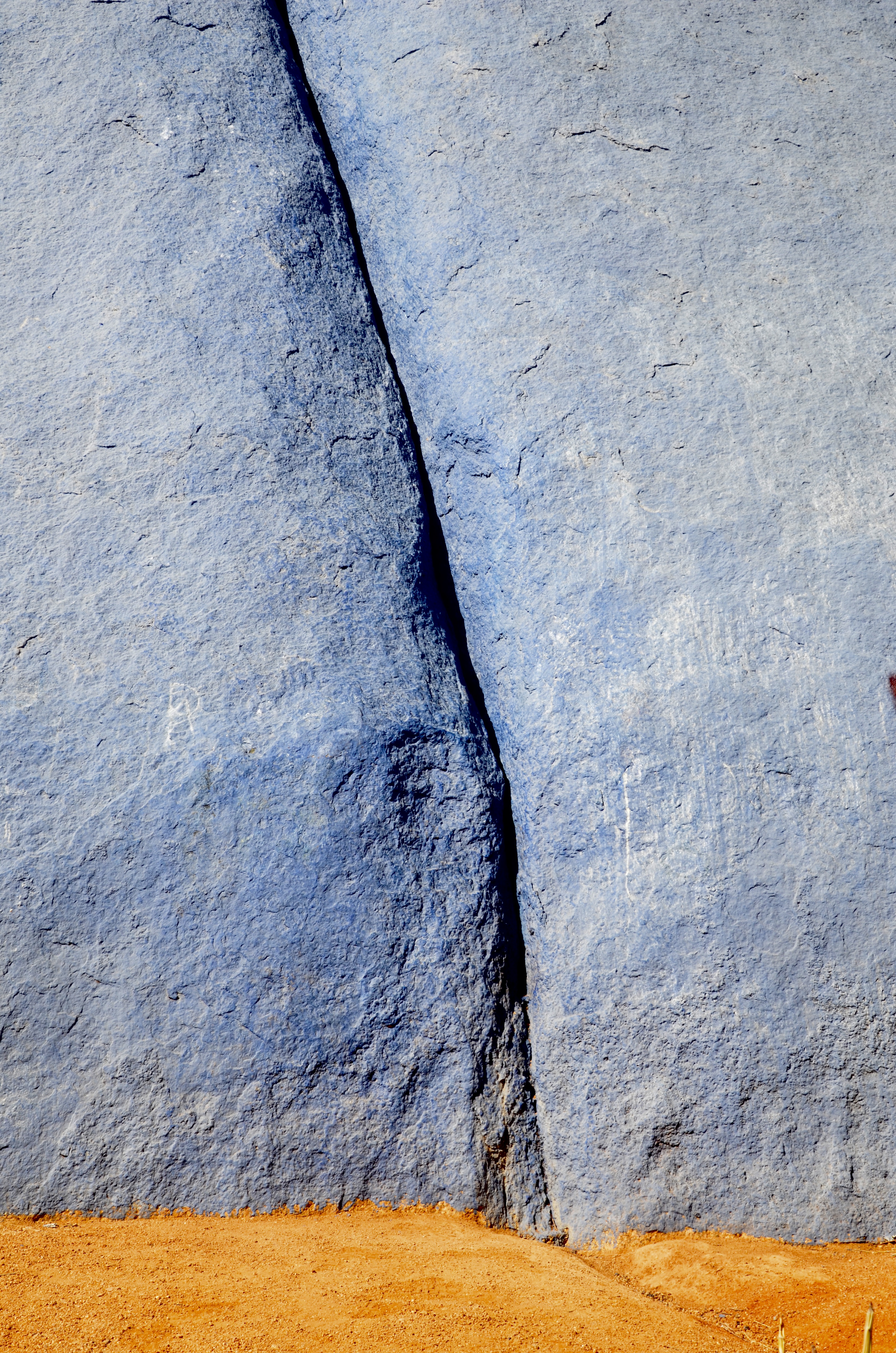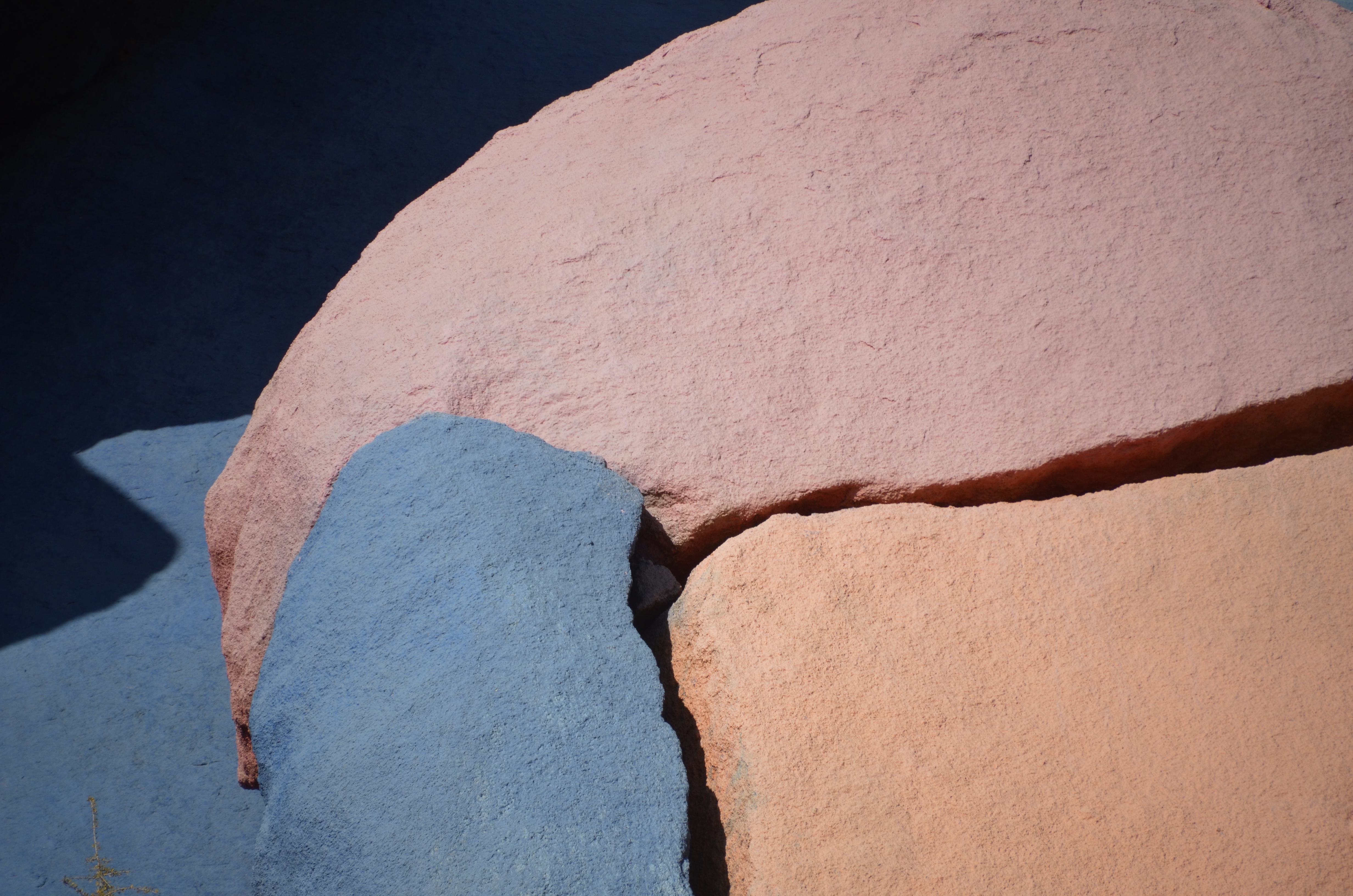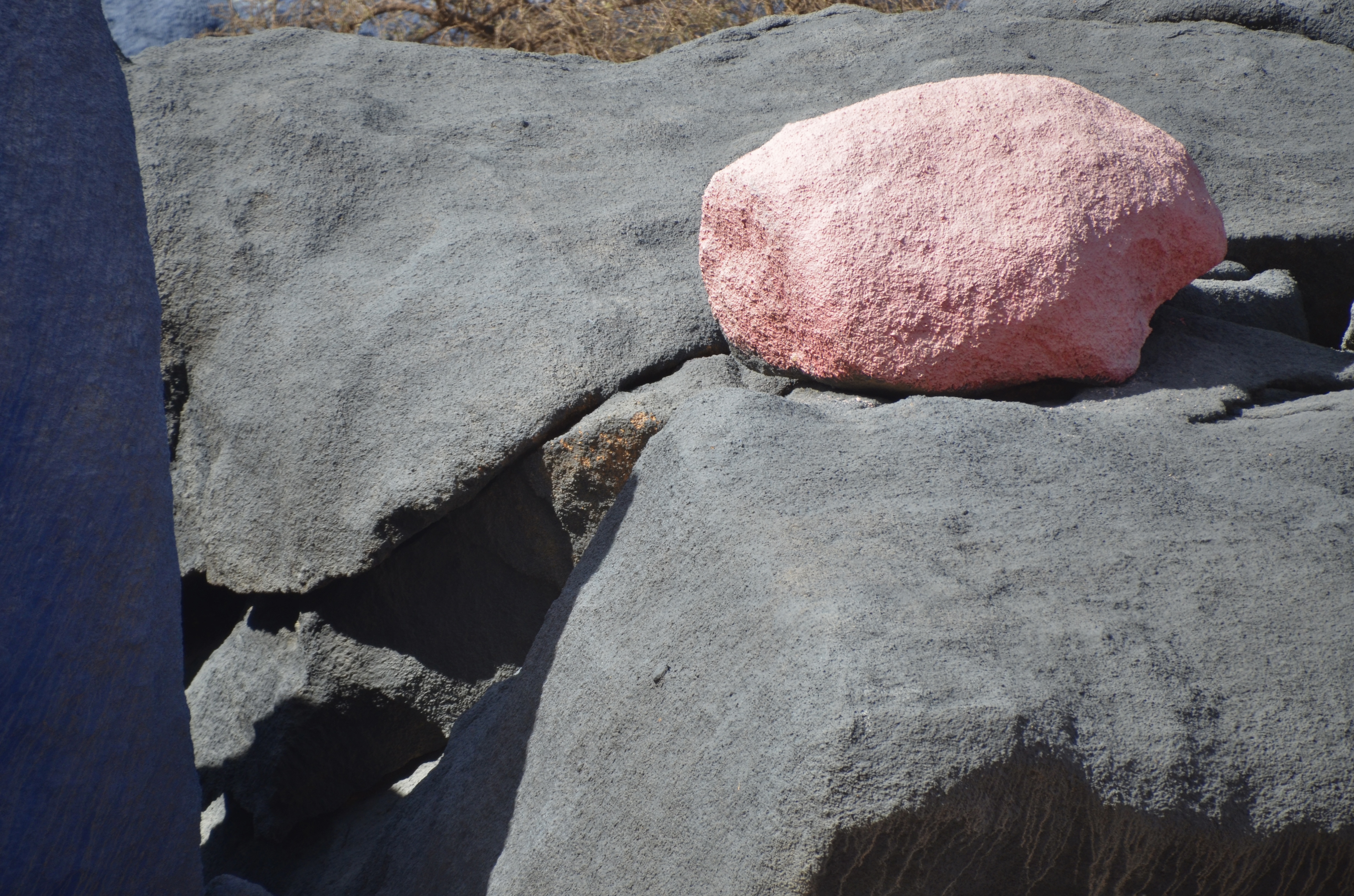 Les rochers bleus : en 1984, le plasticien belge Jean Vérame peint en bleu quelques-uns de ces blocs de granit. L’on aime ou pas. De loin cela ne me plaît guère, surtout qu’il y en a beaucoup plus que lors de mon premier passage en 2010, quand même 30 ans après. Mais en s’approchant c’est très graphique et l’adjonction d’autres couleurs assez pastel est du plus bel effet. Le site est bien entretenu, quasi pas de déchets.