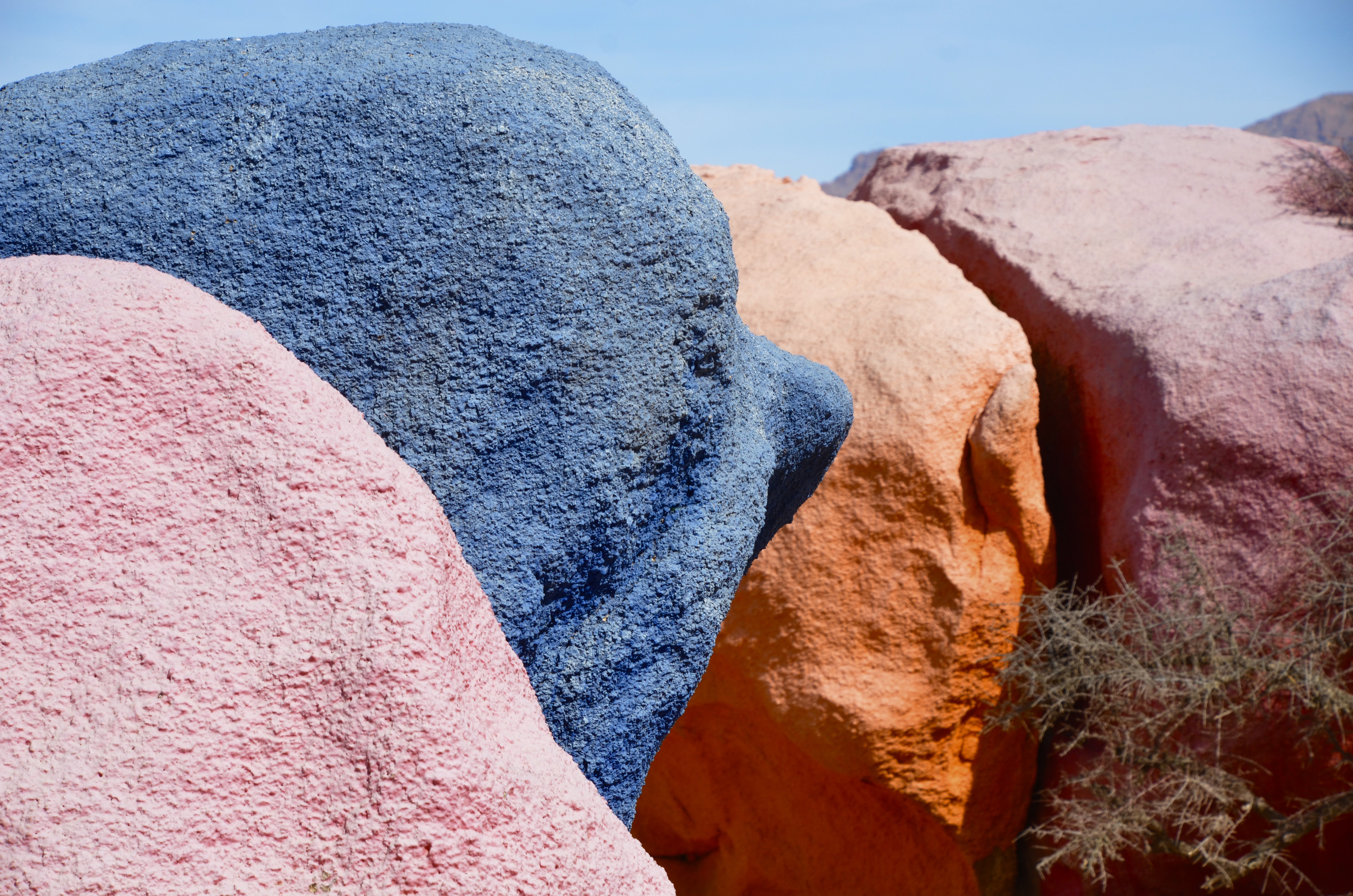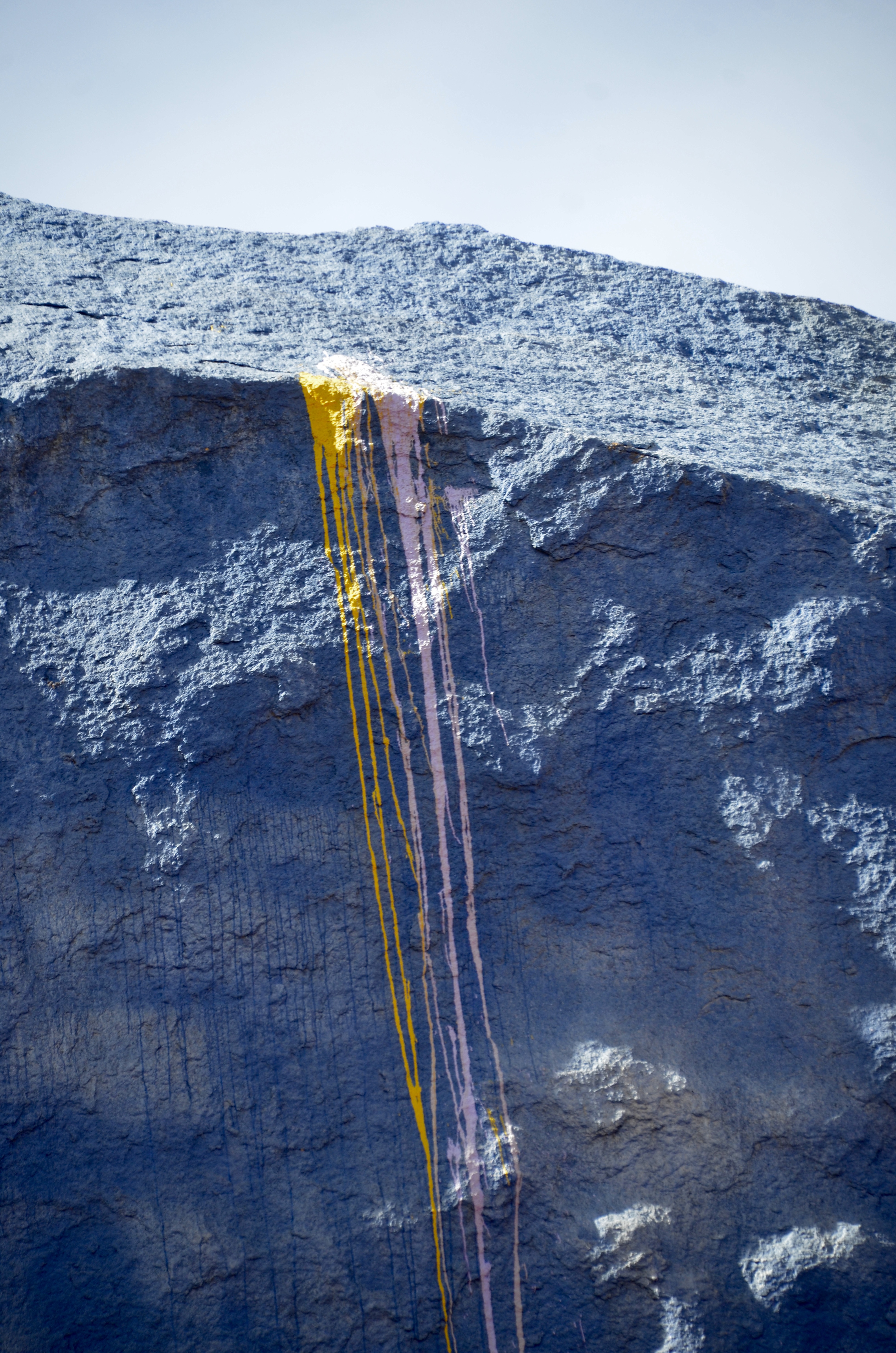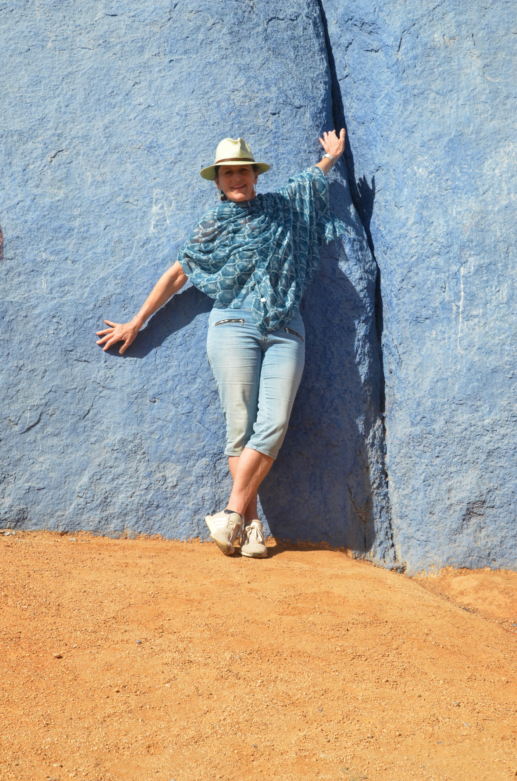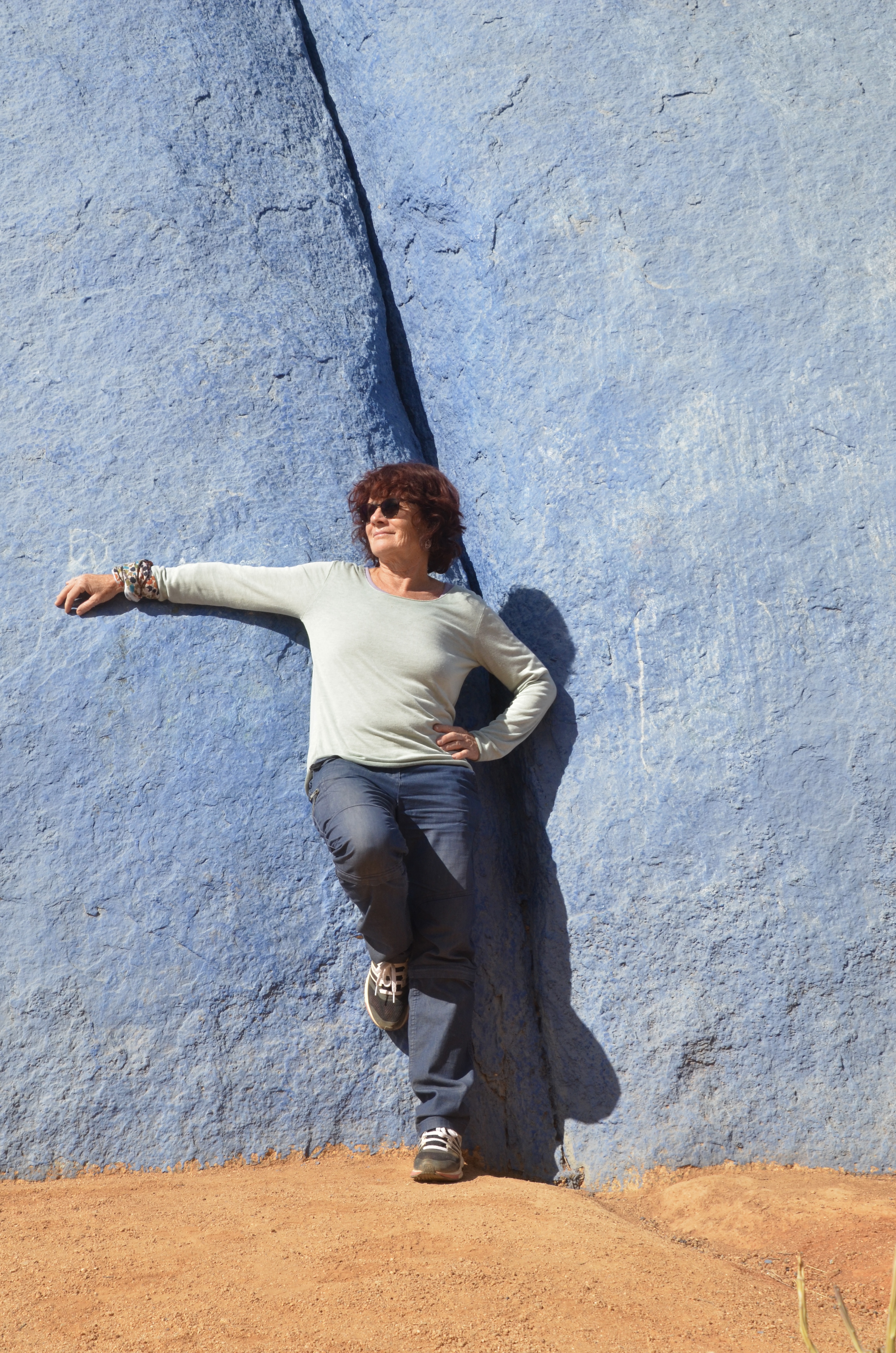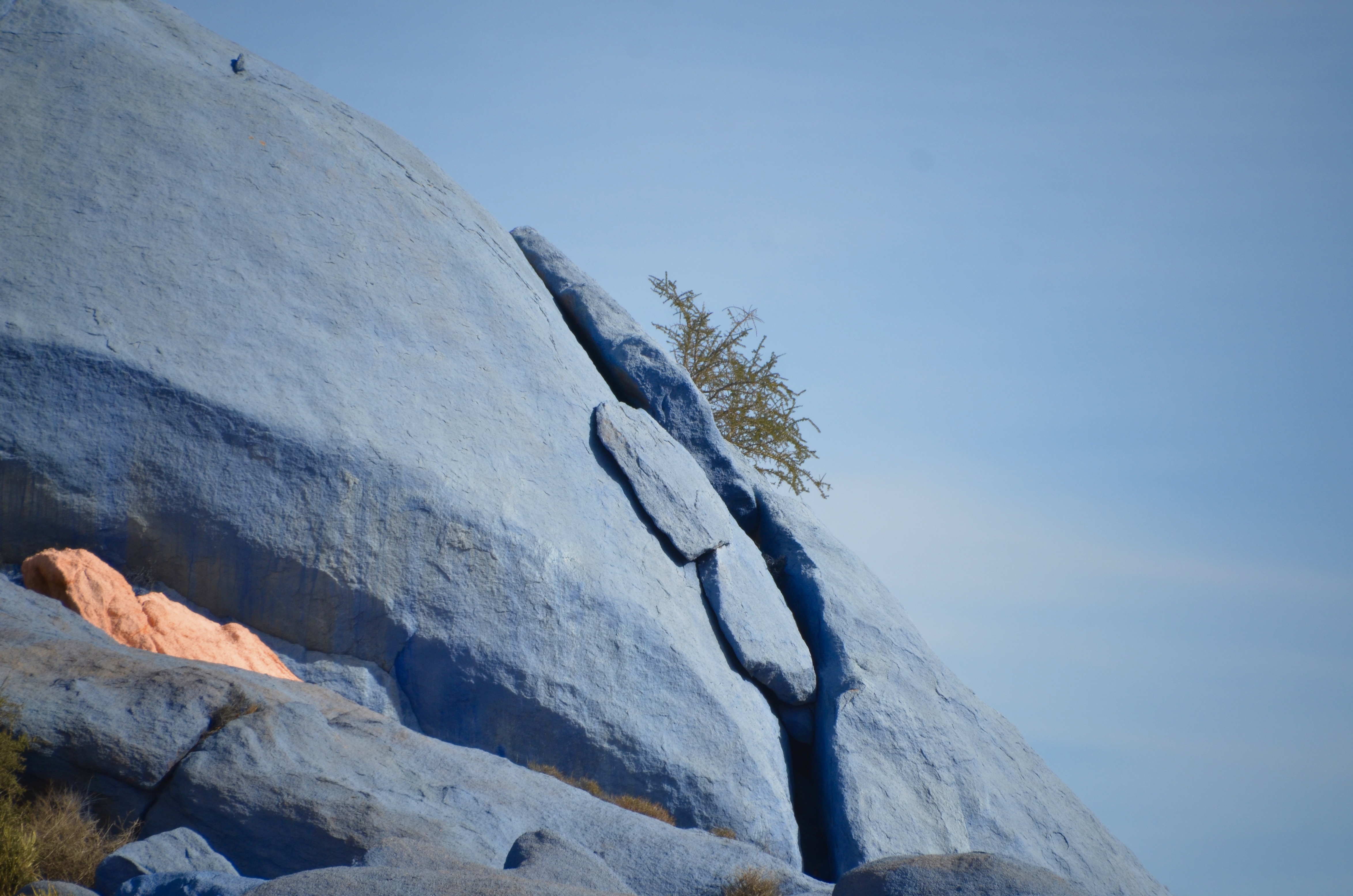 Les rochers bleus : en 1984, le plasticien belge Jean Vérame peint en bleu quelques-uns de ces blocs de granit. L’on aime ou pas. De loin cela ne me plaît guère, surtout qu’il y en a beaucoup plus que lors de mon premier passage en 2010, quand même 30 ans après. Mais en s’approchant c’est très graphique et l’adjonction d’autres couleurs assez pastel est du plus bel effet. Le site est bien entretenu, quasi pas de déchets.