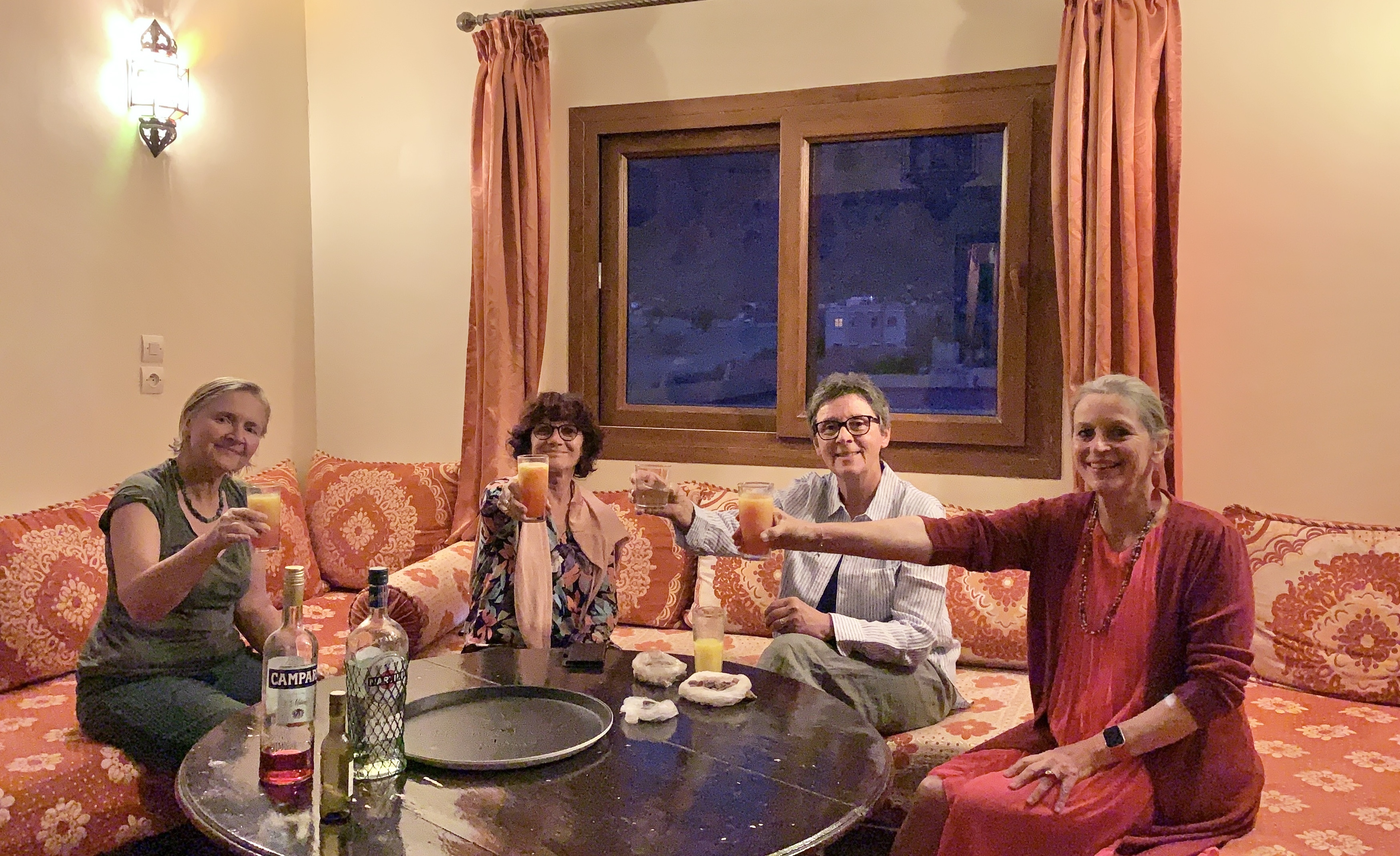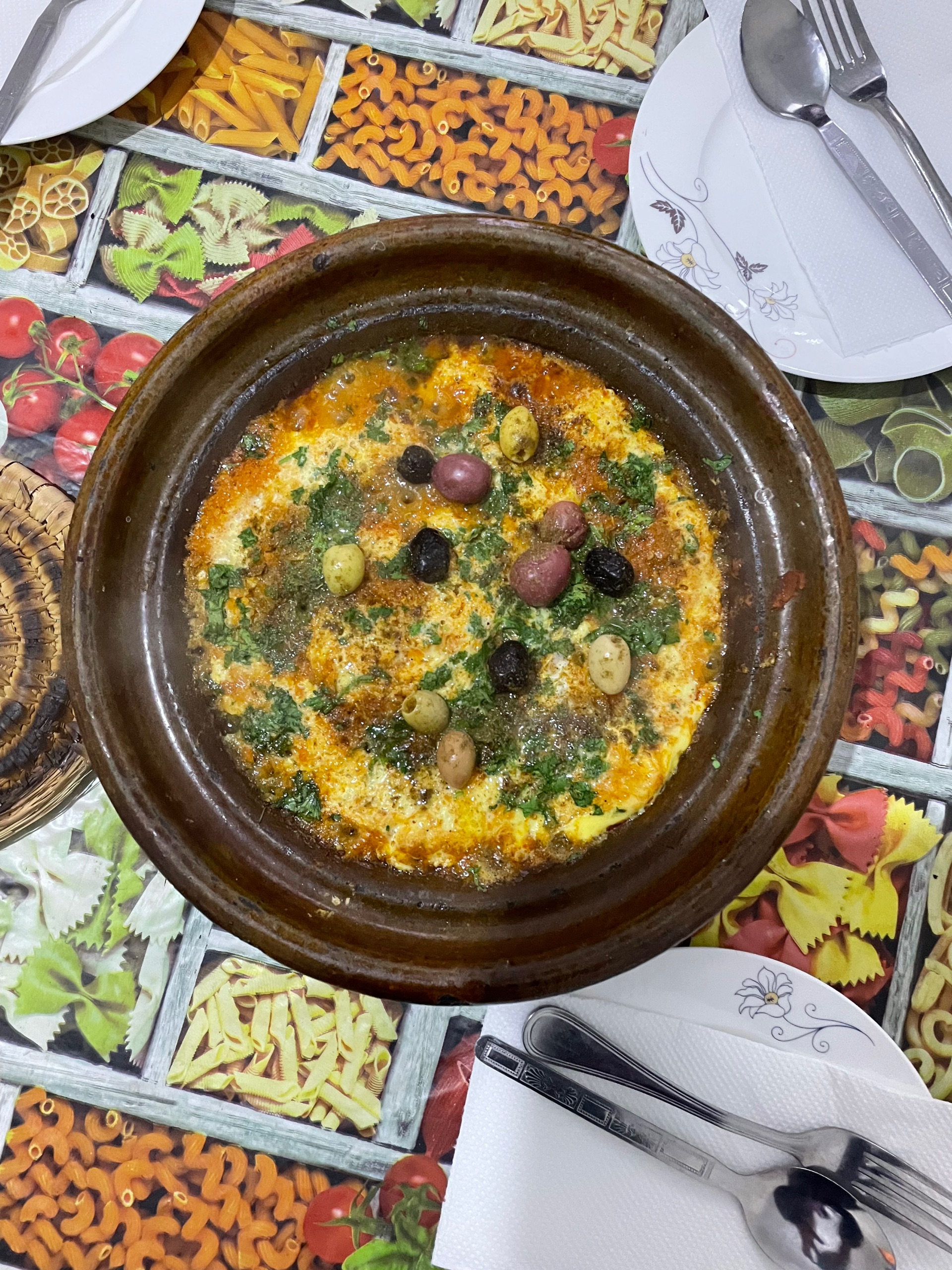 9 h à table avait prévenu Abdou : en effet son omelette ne doit pas attendre. Il dit que c’est lui qui a inventé l’omelette berbère en faisant fondre des légumes avant de les recouvrir d’œufs battus assaisonnés de 3 doigts d’épices. Très important les 3 doigts ! Savoureux, mousseux, quel plat simple et pourtant si délectable.