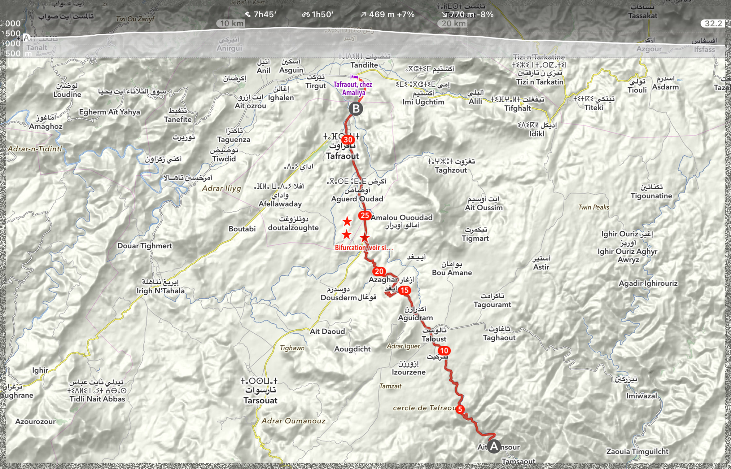 Les inévitables photos du départ avec Abdou et l’un de ses amis. Très petite étape en direction de Tafraout. Pourtant quelle que soit la longueur de l’étape nous arrivons toujours à la même heure !