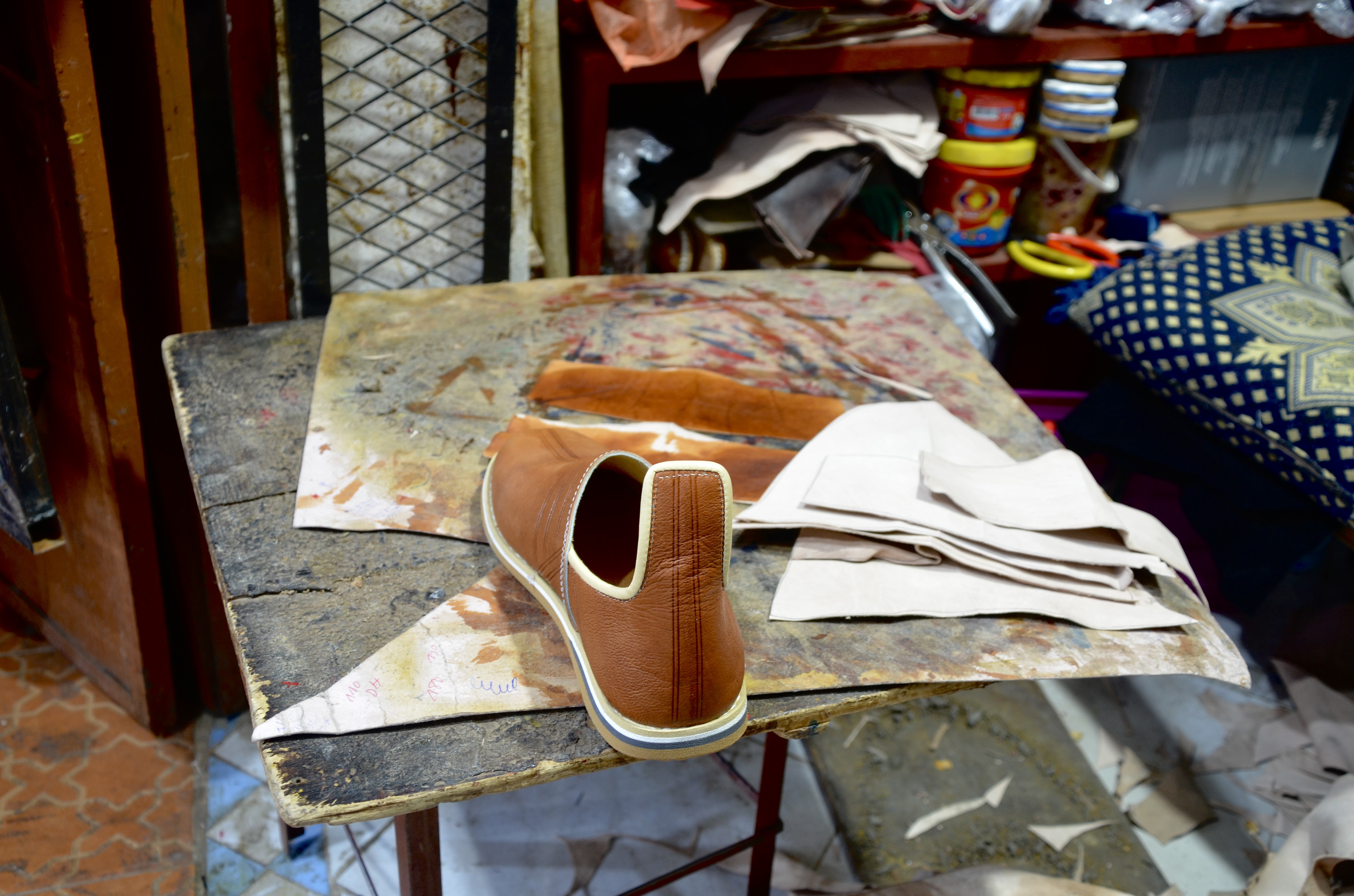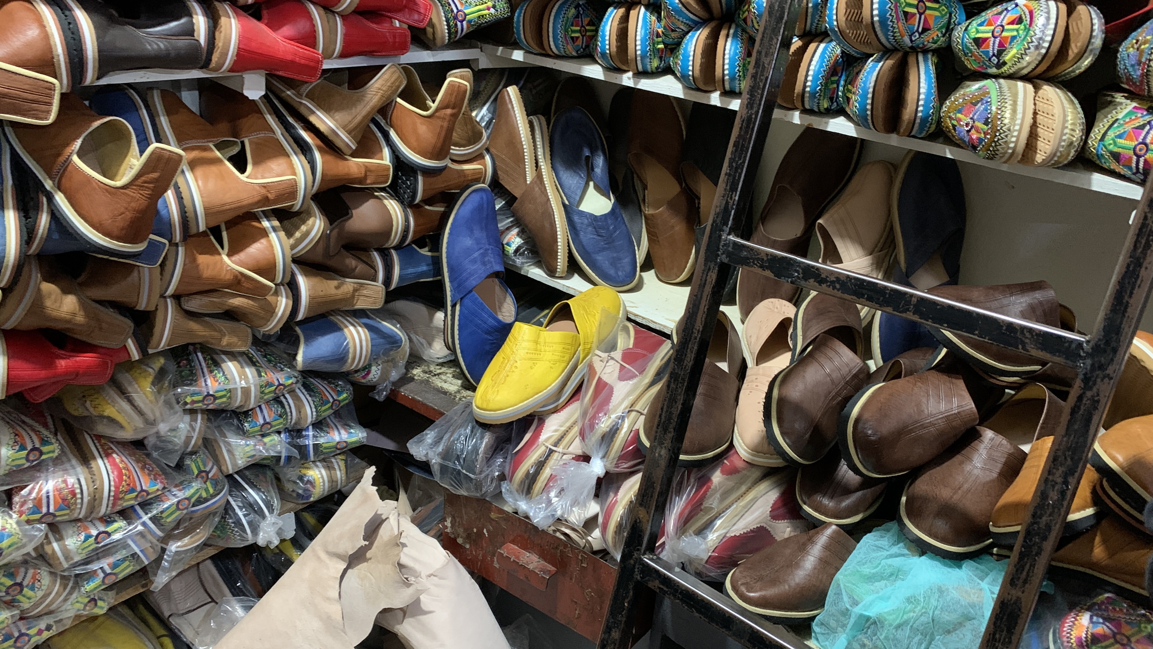 Et les babouches, une grande tradition à Tafraout, celles avec contrefort pour homme et les brodées que l’on aperçoit en haut à droite, plutôt pour femme. L’on nous a expliqué que les broderies se faisaient à Tanger mais toute la fabrication est exécutée sur place. Nous avons évidemment dévalisé un artisan.