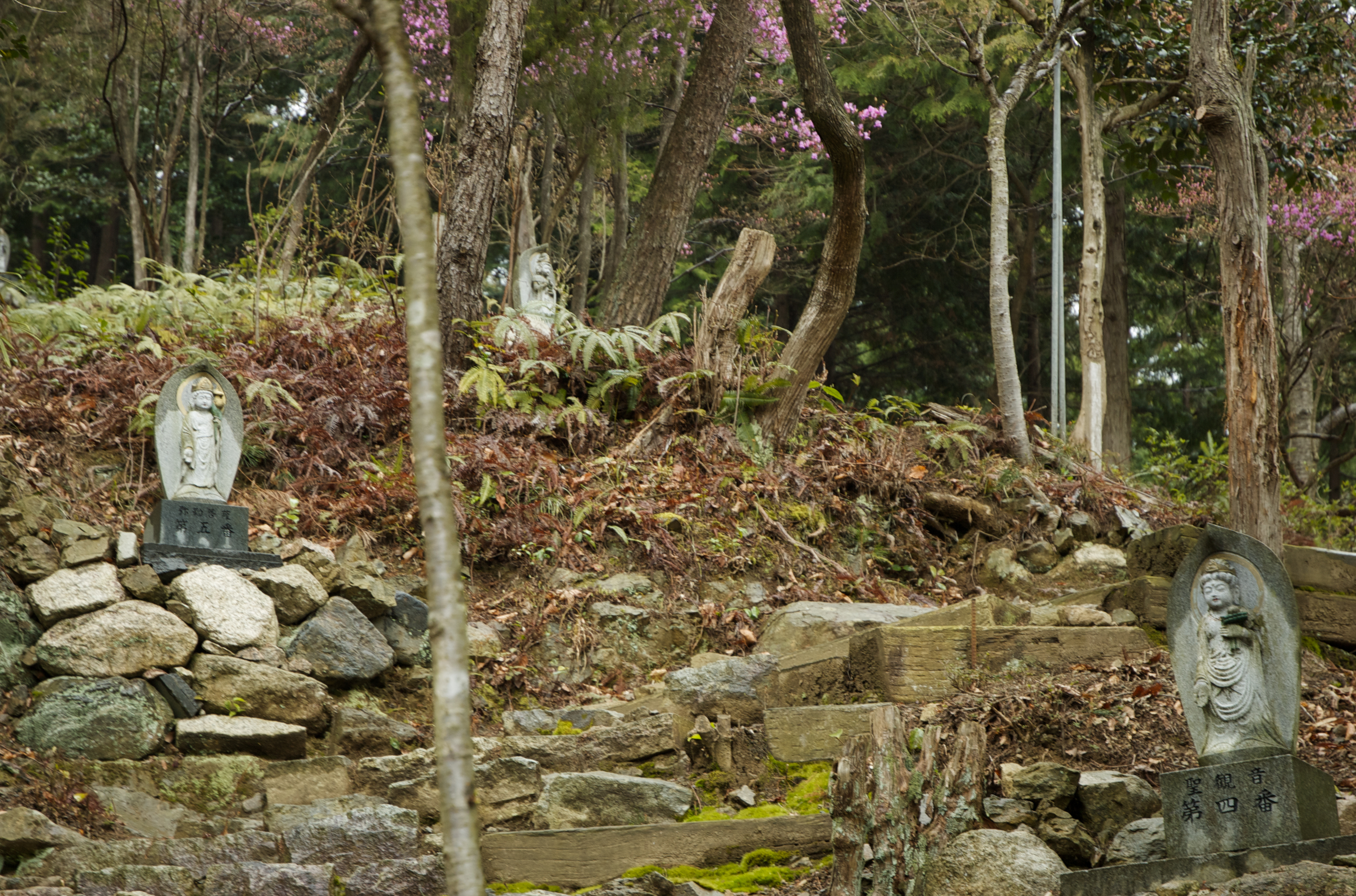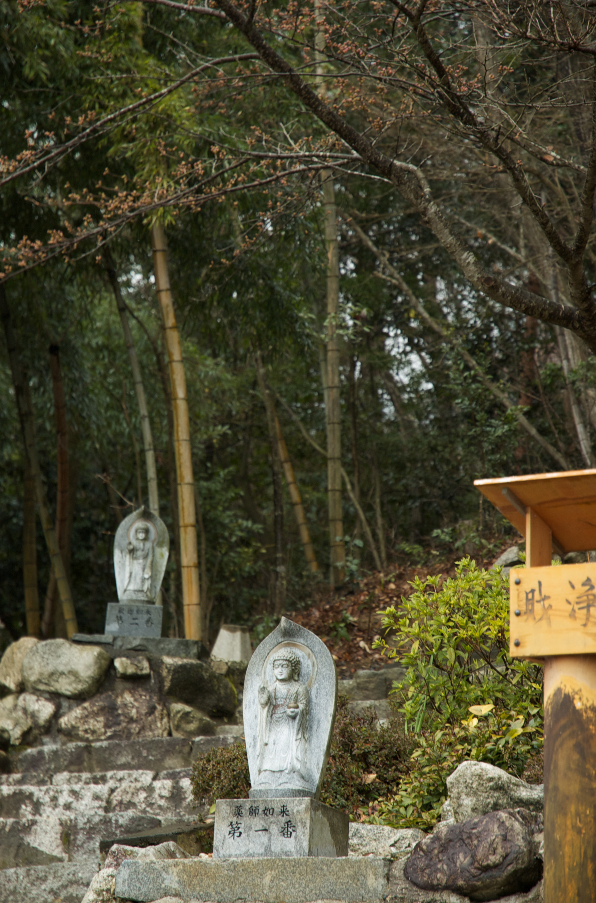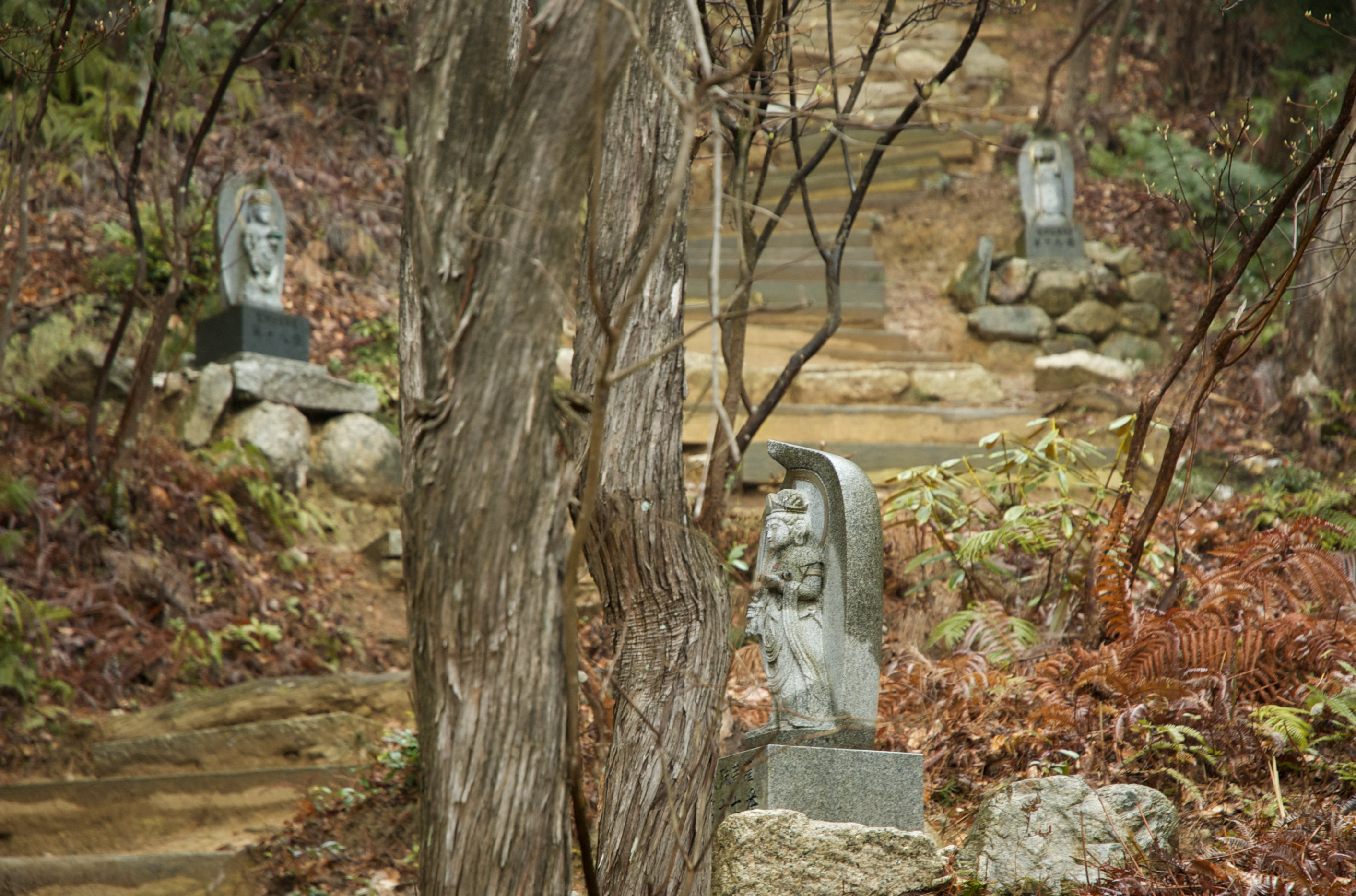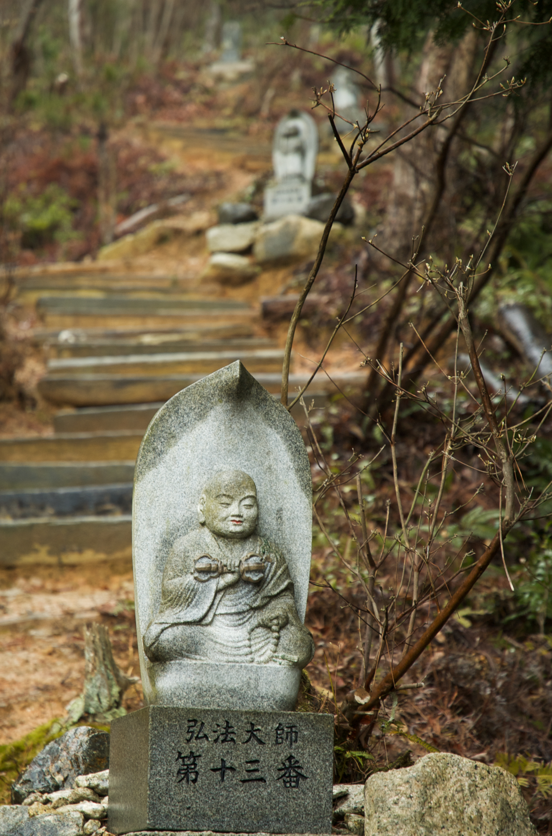 * The path is 88 stations, I was almost a third through it. At first glance, one might expect this to be a miniature reproduction (utsushi reijo) of the 88 temple Shikoku pilgrimage (Shikoku Henro) which commemorates the travels of Kobo Daishi—the founder of Pure Land Buddhism, depicted above at station 13—however the votive markers feature a different image than the corresponding temples on the Shikoku route thus making that connection uncertain (additionally, the temple associated with this path is of the Rinzai Zen tradition who’s focus on meditation is quite different from the otherworldly salvation of Pure Land.). Utsushi reijo became more common from the Tokugawa period on, when a rising middle class and improved security made pilgrimage more accessible. While the original courses may take months to circumambulate, the reproductions often are much smaller. The pilgrimage here would only take a few hours. These offer a spiritual experience to those who, due to infirmity or economic circumstance, are unable to take the time and effort of the longer pilgrimages.