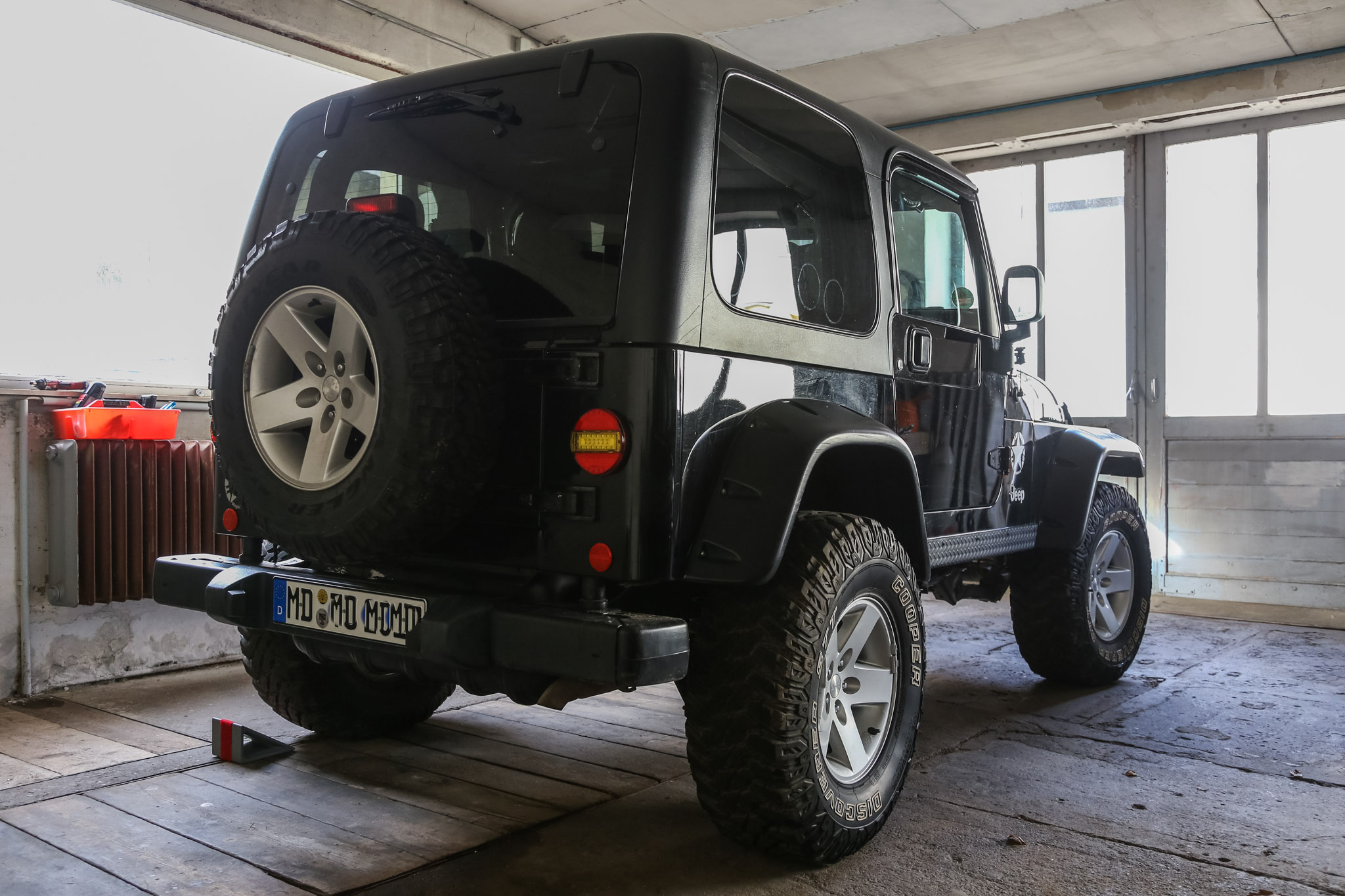 Die Kombination aus Rädern und Spacer veränderten die Fahrzeughöhe von 181 cm auf 193 cm. In der Breite wuchs der Jeep um gut 6 cm.