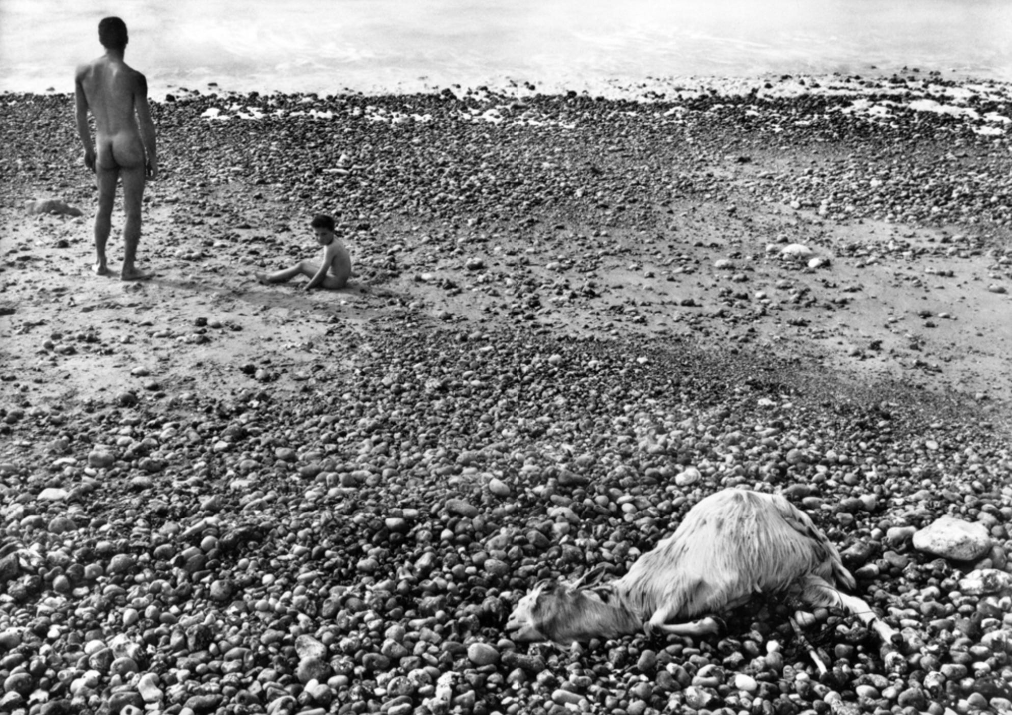 uma praia. três personagens entre a morte e a eternidade. a cabra está morta, a criança olha para o animal, o homem nu mira o horizonte.