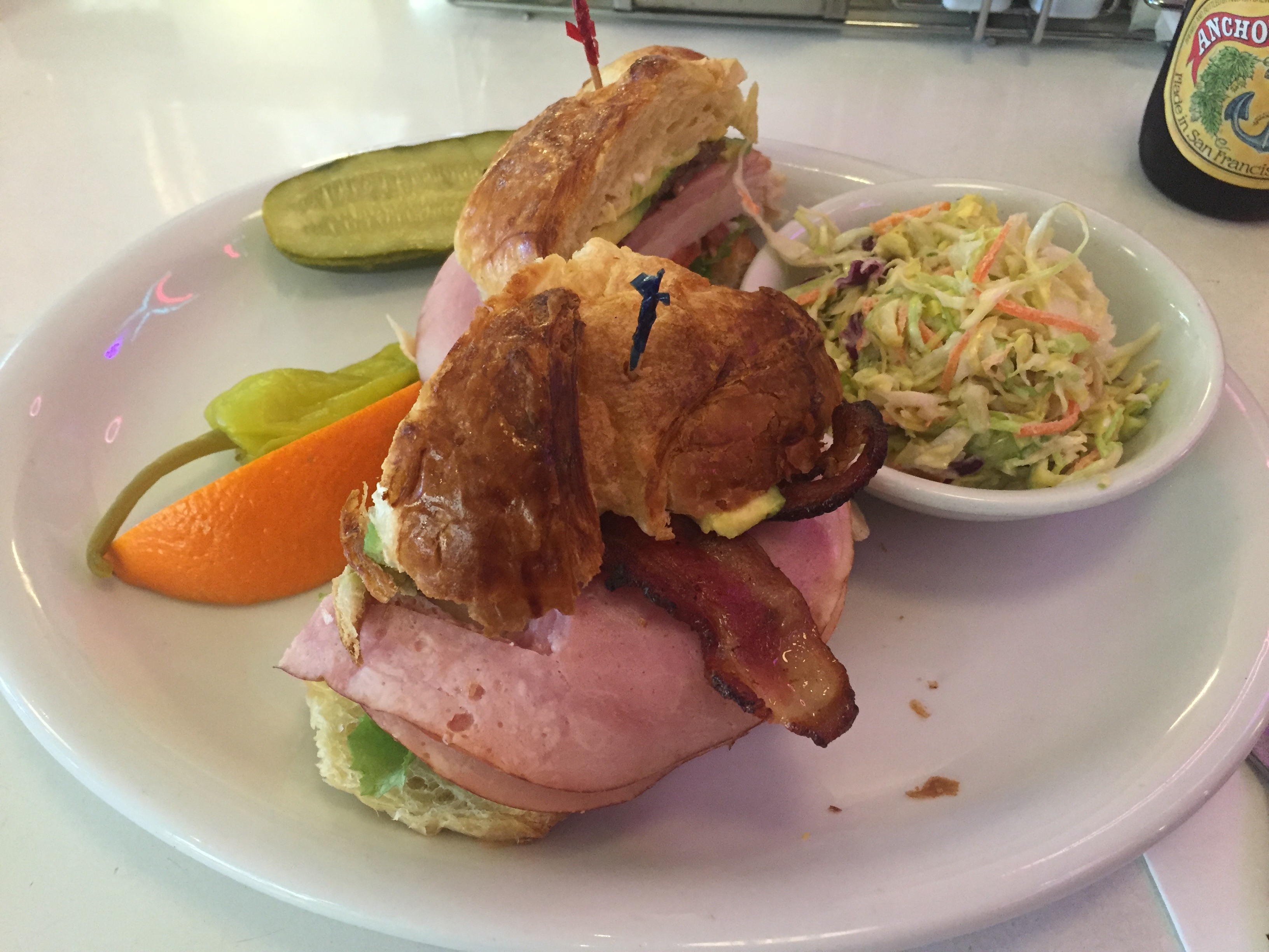 Opposite that hotel is a Lori's diner, and I finally do get something to eat and drink. It's 3.45pm and I'm exhausted, starving, and thirsty as fuck. I've been walking pretty much non-stop since 12.20pm or so and Footpath tells me it's pretty much dead on 7 miles. My thighs hurt a bit, my feet are a tiny bit raw but not much. The Anchor Steam beer goes down very well and I've ordered a sandwich.